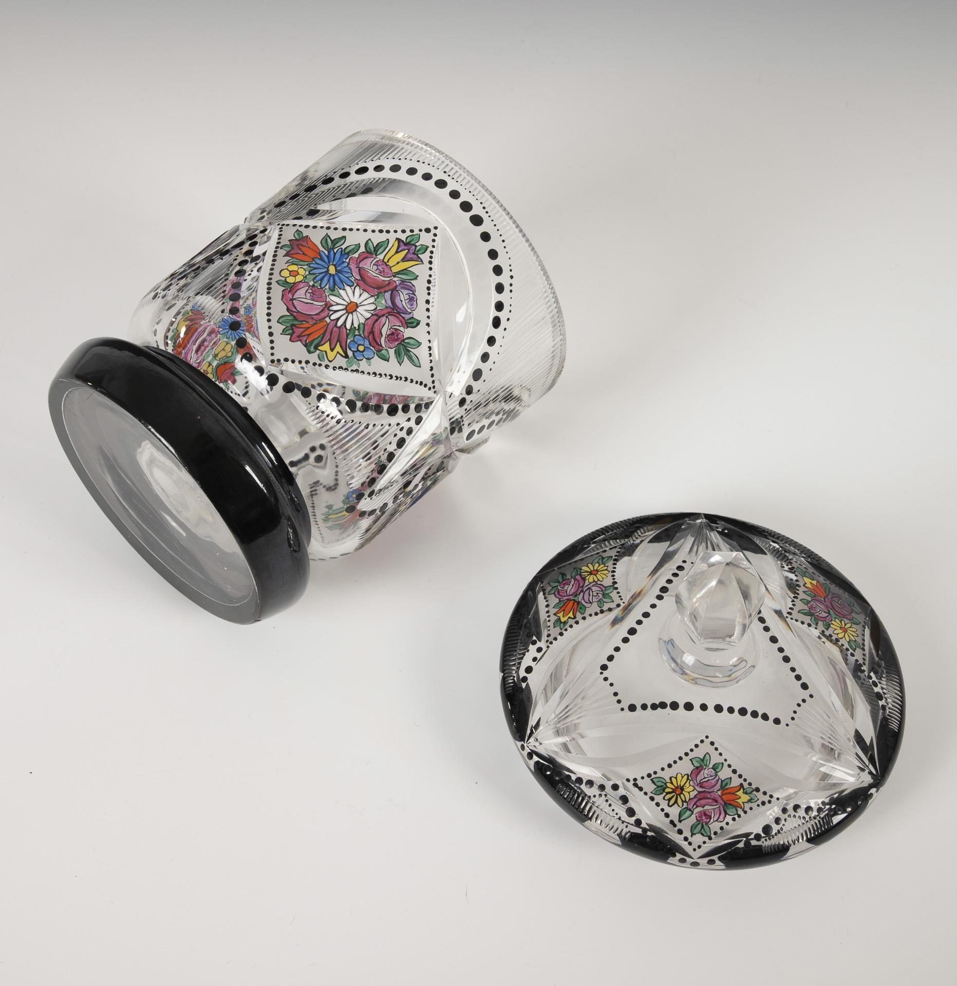 Zylindrischer Korpus über Rundfuß, Knaufdeckel. Umlaufend Kerbschliffdekor sowie drei Kartuschen mit polychrom gemalten Blumenbuketts.