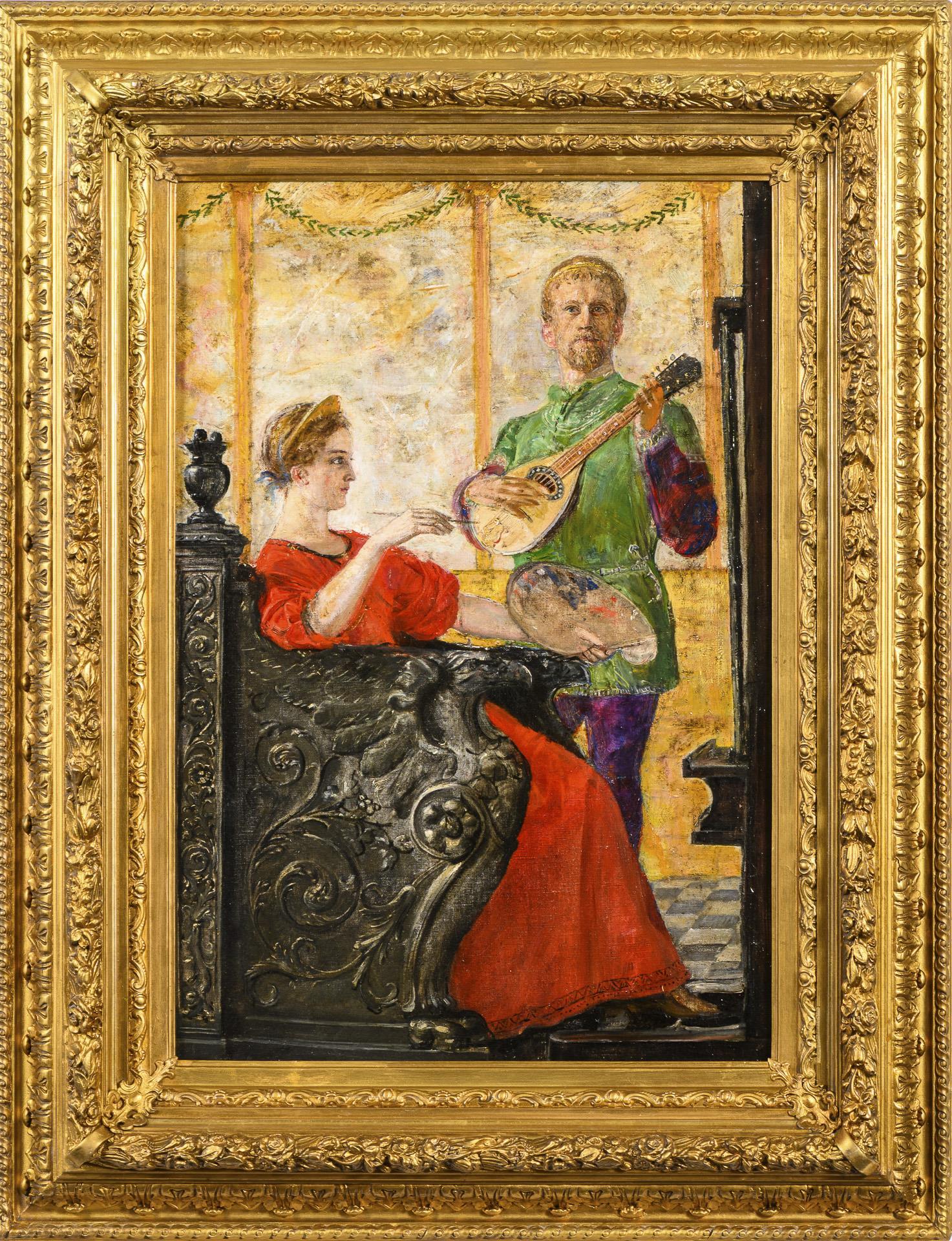 Auf einem Thron mit Armlehnen in Form von Adlern sitzende junge Frau im roten Kleid mit Farbpalette neben einem die Laute spielenden jungen Mann. Drei kleine restaurierte Stellen.