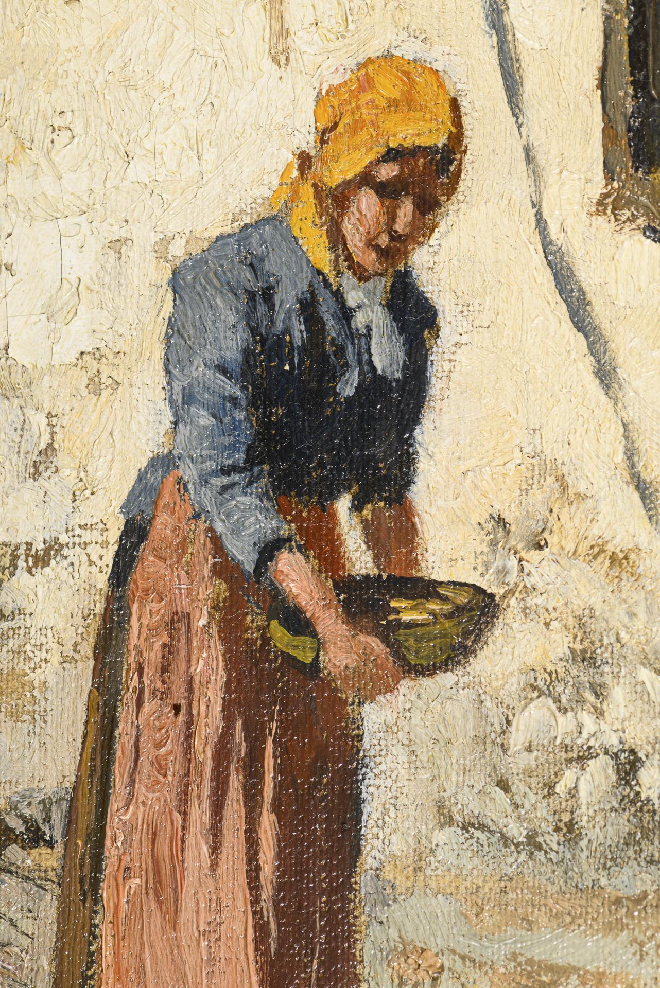 Die Bäuerin beim Füttern der Enten und Gänse auf dem großen Hof.