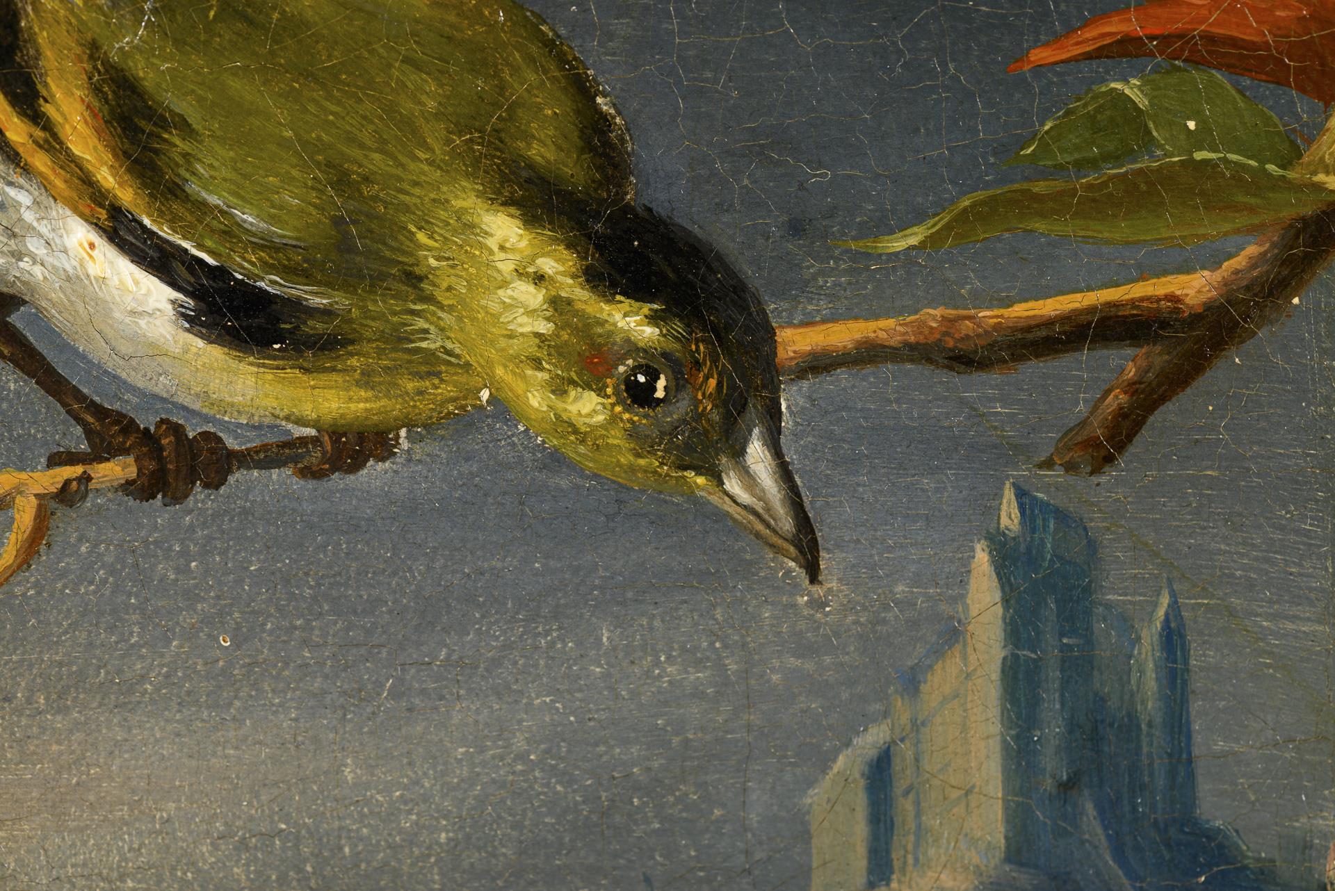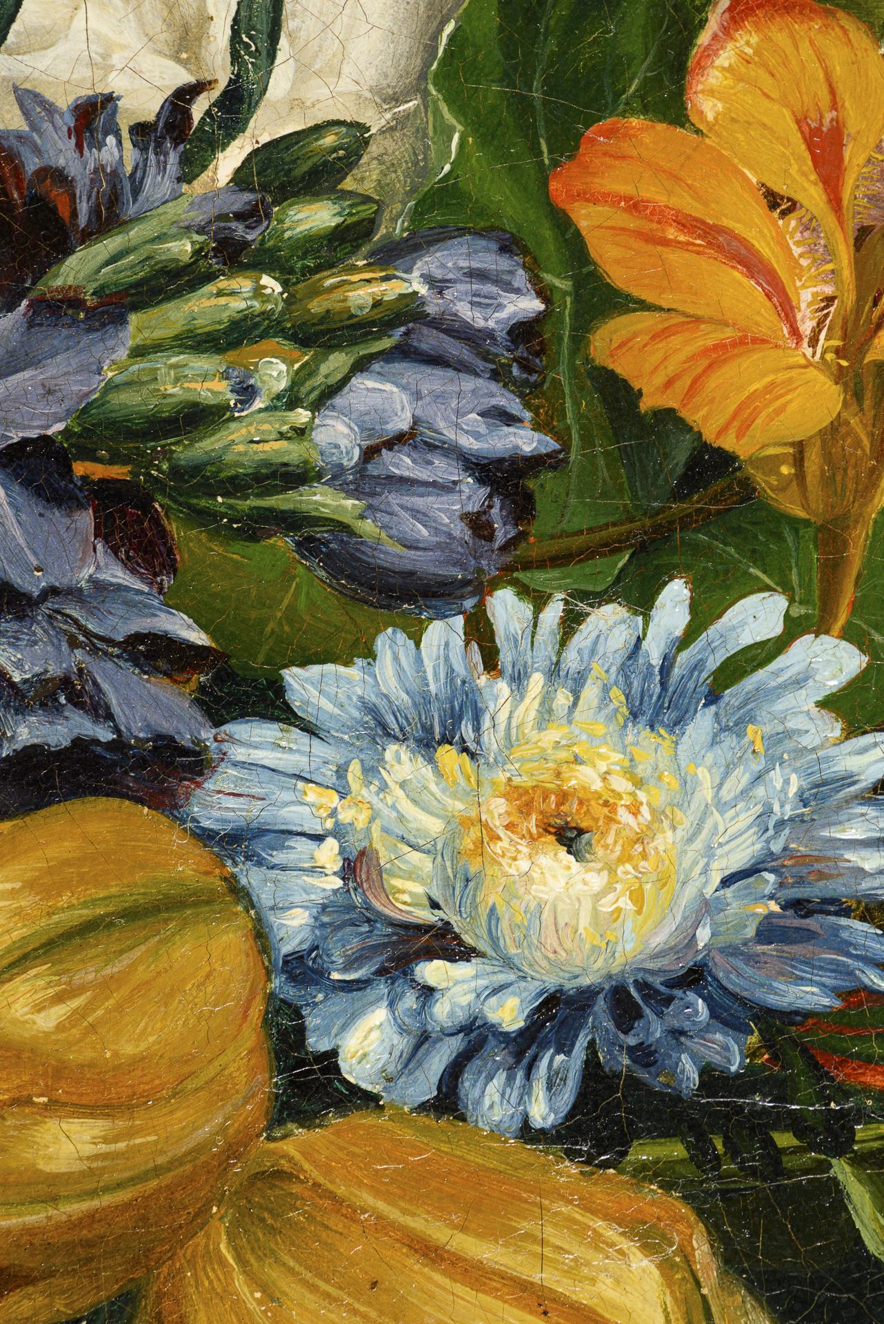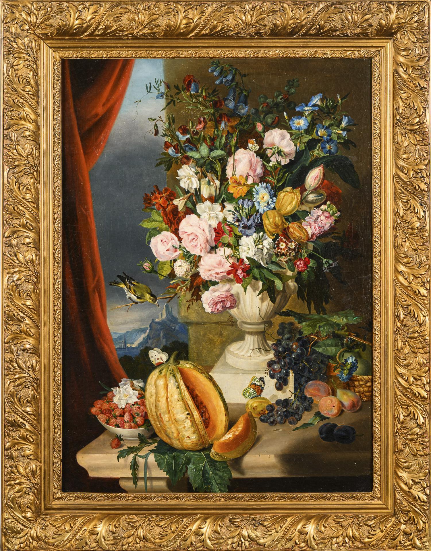 Qualitätvoll gemalter, großer Blumenstrauß in weißer Kratervaser neben Melone, Erdbeeren und Trauben sowie einem Zeisig und Schmetterlingen vor einem gelüfteten Vorhang, der einen Blick auf die bergige Landschaft mit Burgruine freigibt. Leichte Altersspuren.