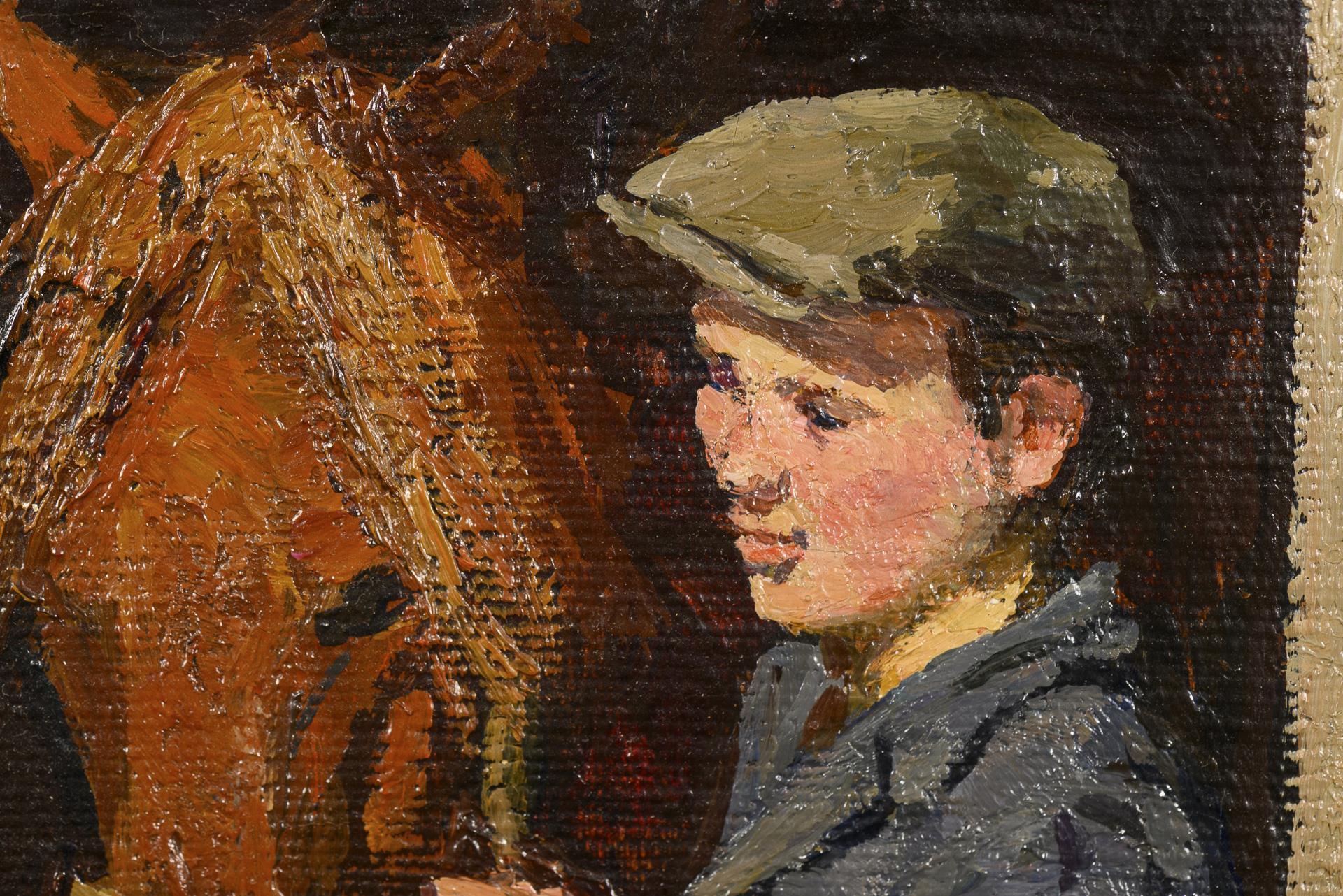 Junger Mann beim Führen des Pferdes aus dem Stall in den Sonnenschein.
