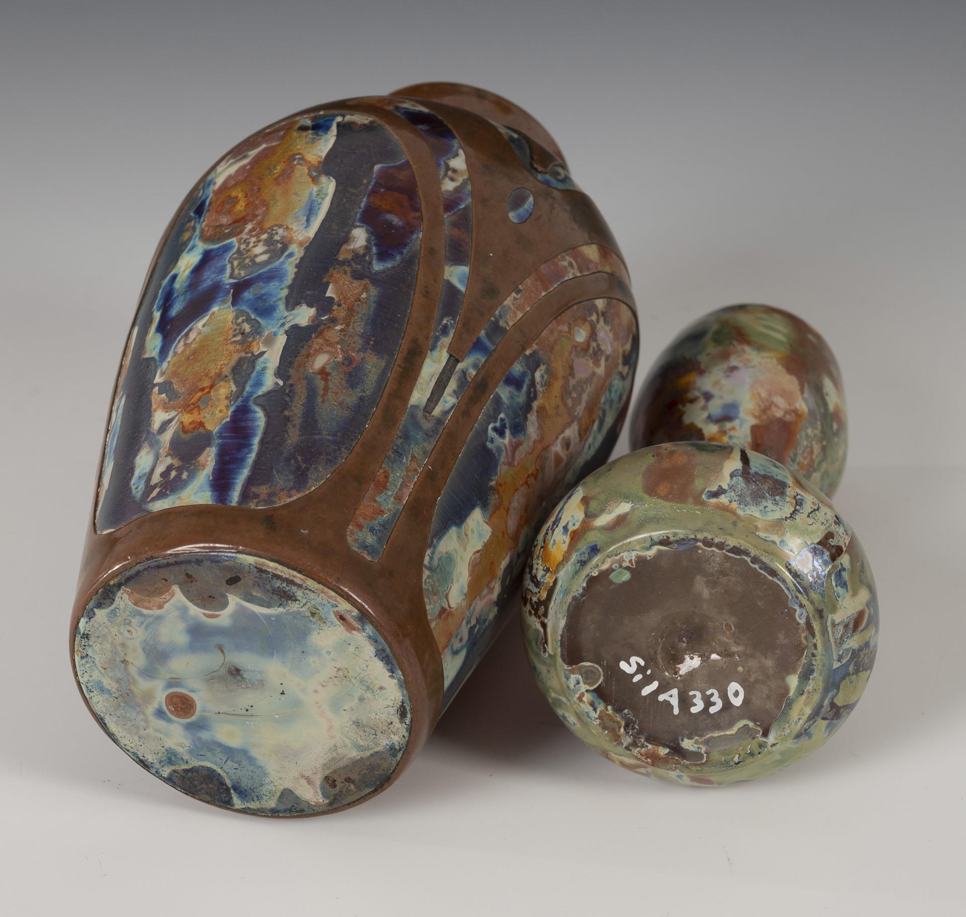 1x Balustervase mit galvanischer Kupferauflage in Form von Rundbögen. / 1x kleine Vase mit konischem Korpus und tüllenförmiger Mündung (diese Vase ehemals Sammlung Giorgio Silzer). Kleine Fehlstelle an der Kupferauflage.