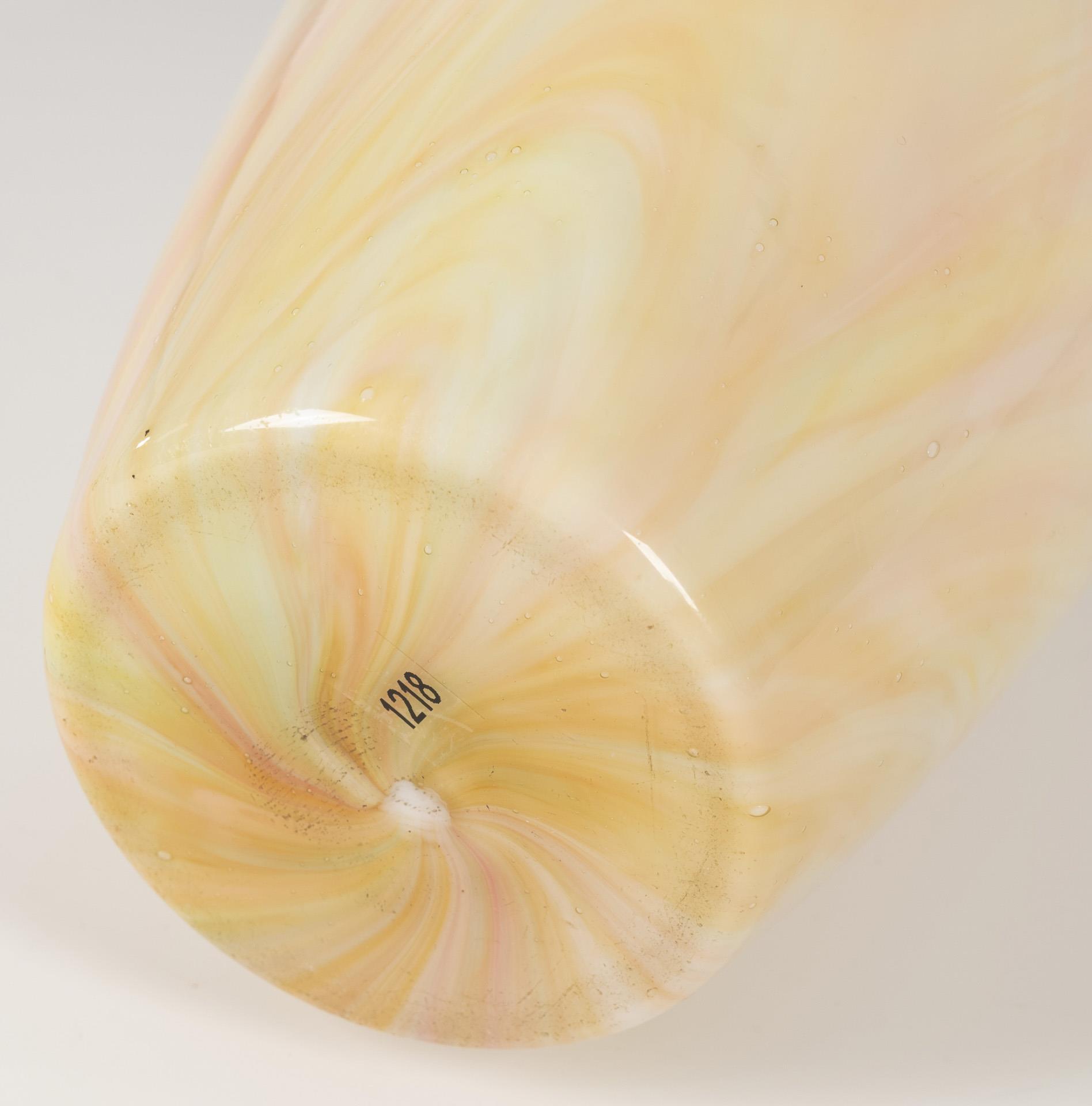 Weißes, mit gelben und rosaroten Fäden marmoriert umsponnenes Milchglas mit Klarglasüberfang, Reliefemail in Violett, Goldstaffage. H 18 cm.