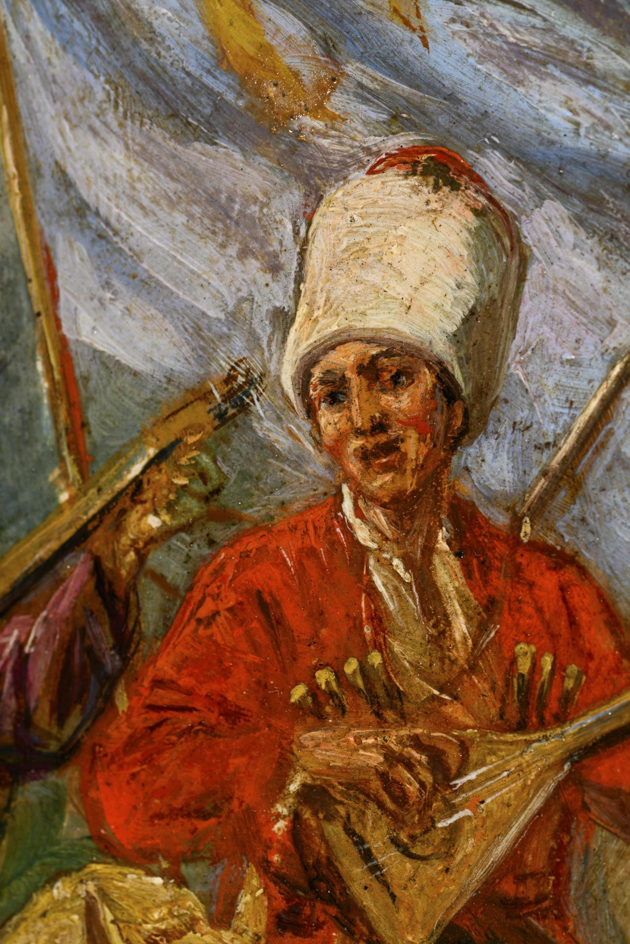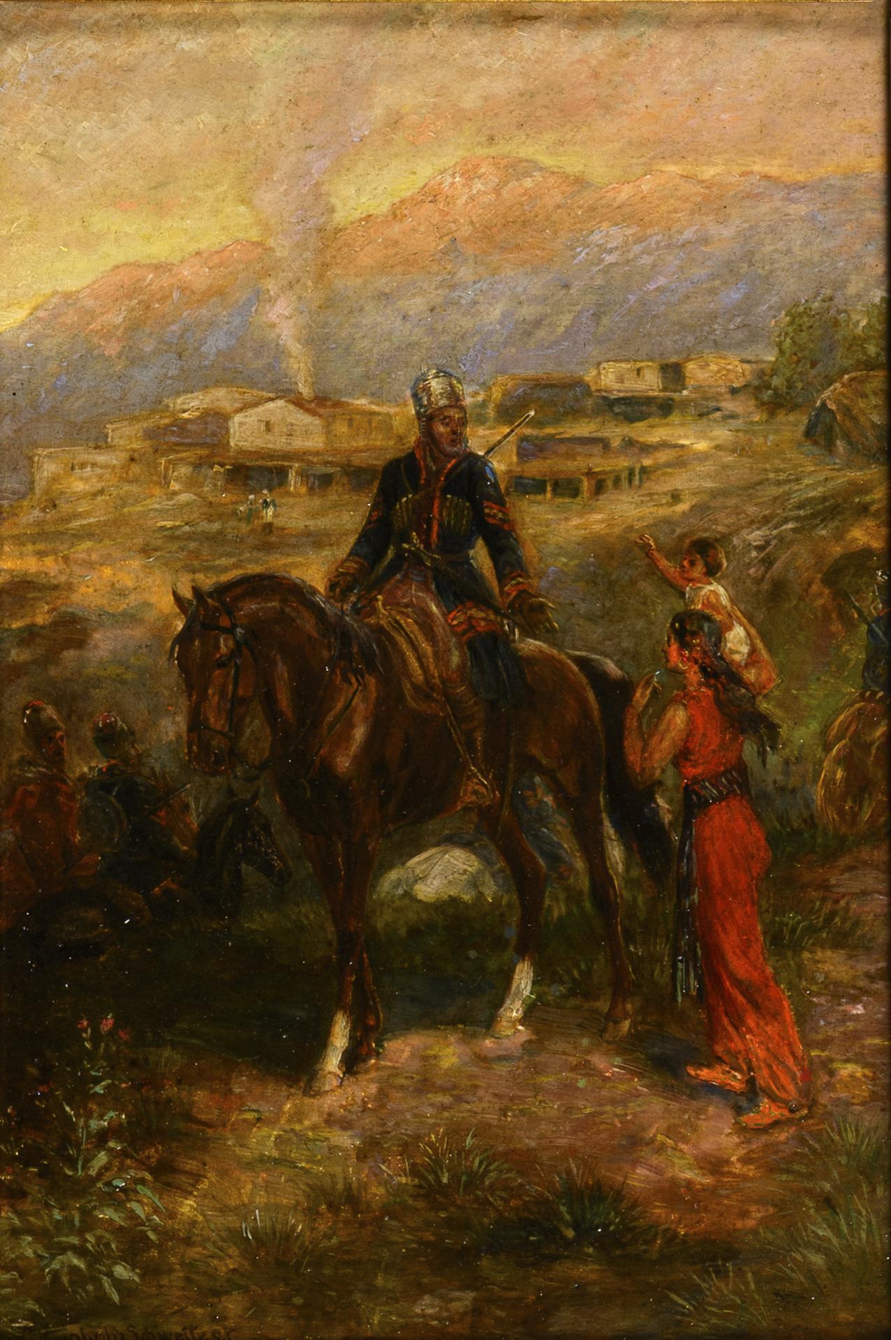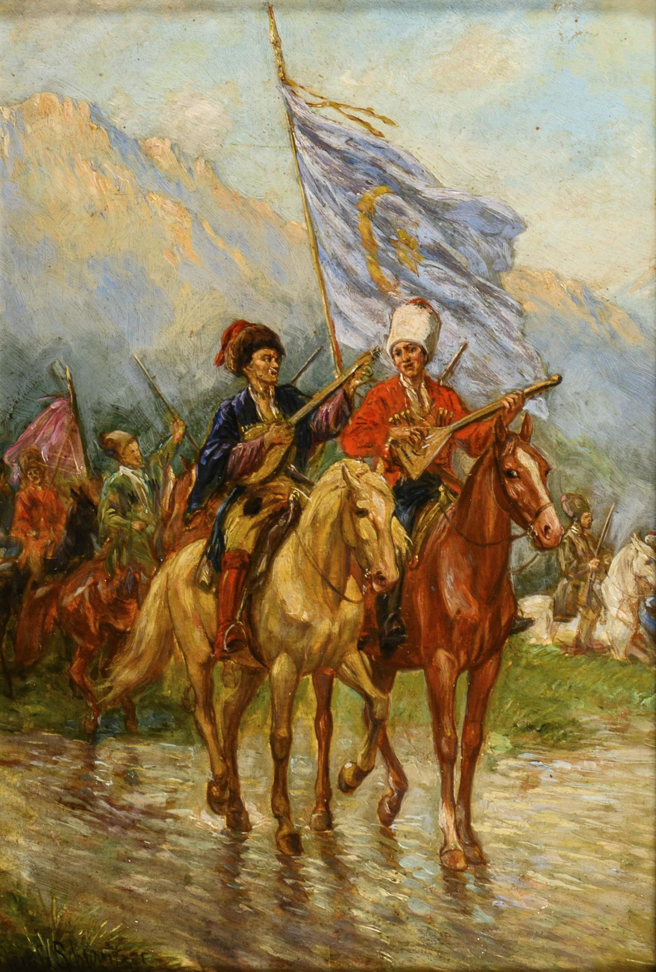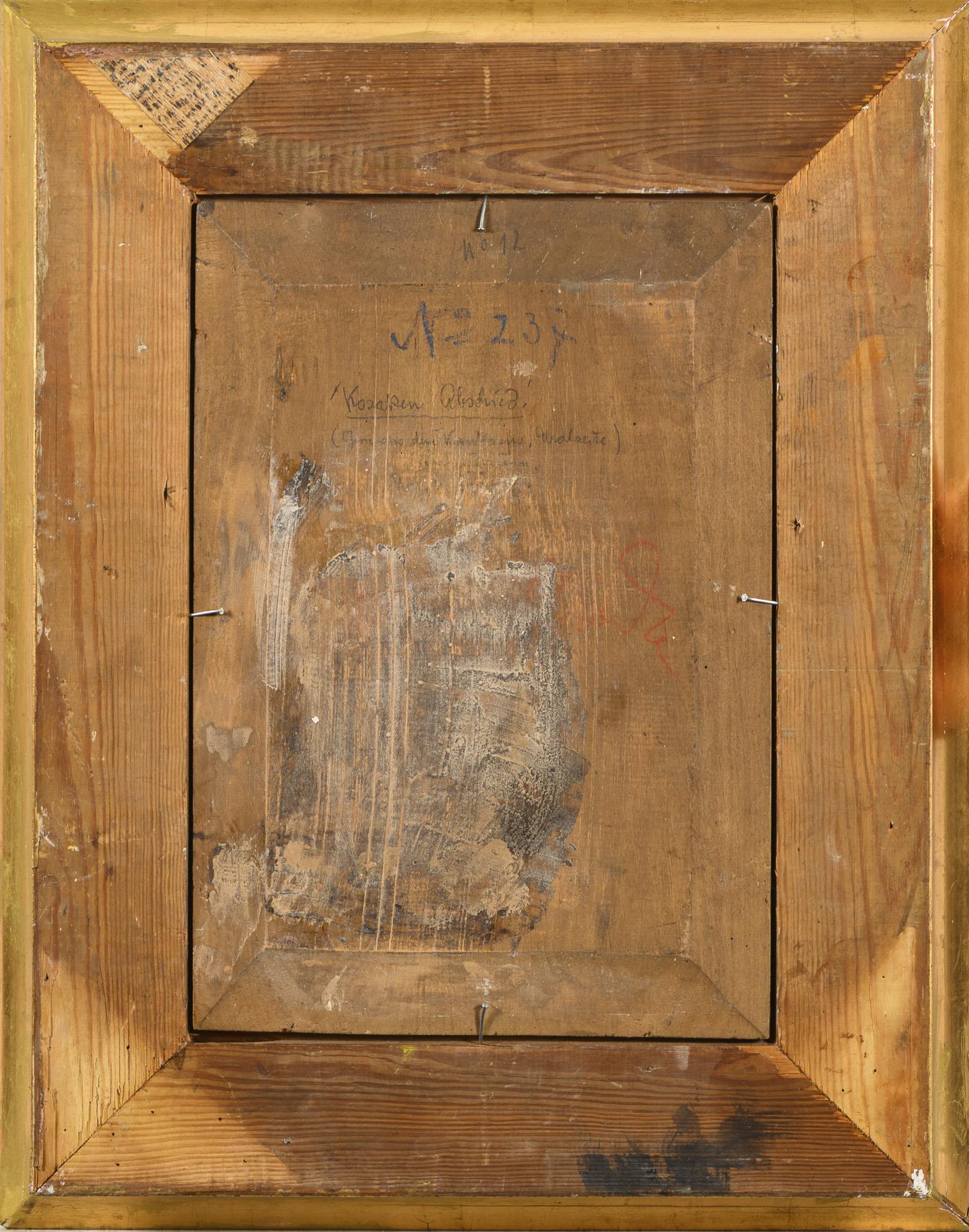Je Öl/Holz. Je links unten signiert, verso als "Des Kosaken Abschied (Südkaukasus auf der Uralseite)" "Tscherkessen Musikanten Südkaukasus" betitelt.
