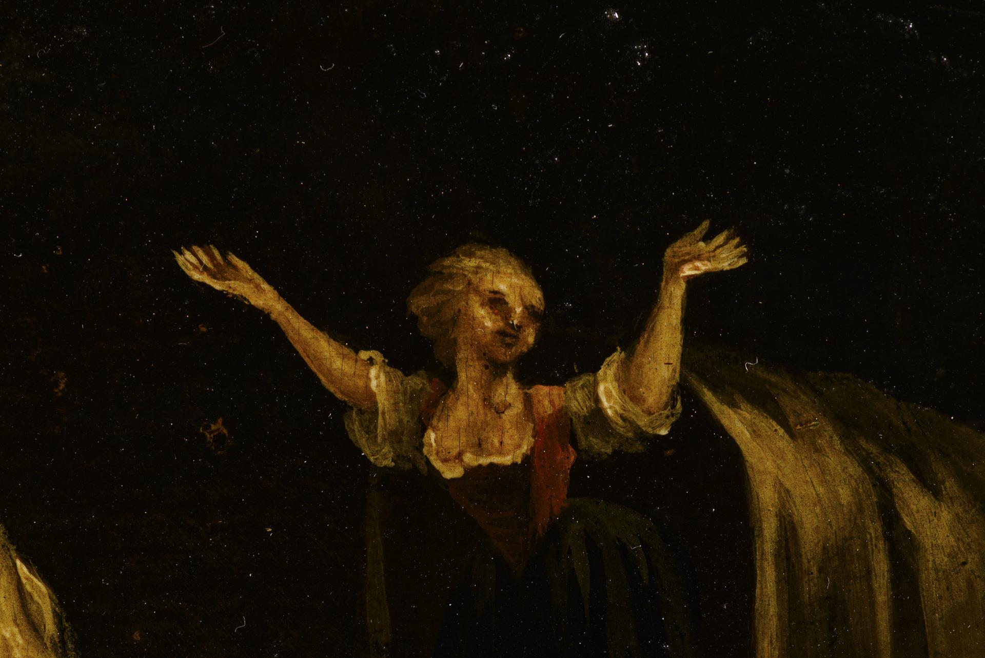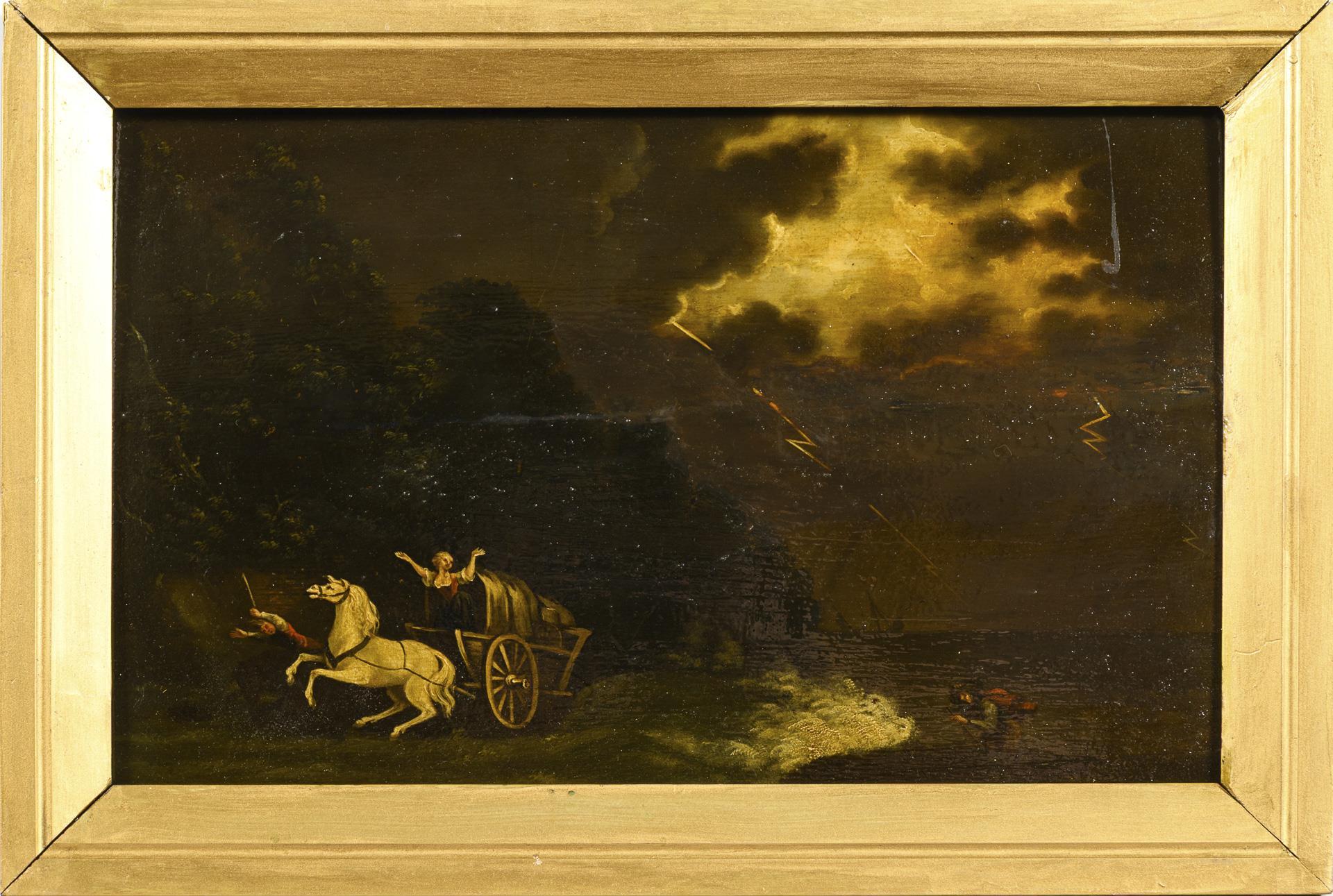Pferdewagen an der Küste unter dunken Wolken mit einschlagenden Blitzen. Retuschiert.