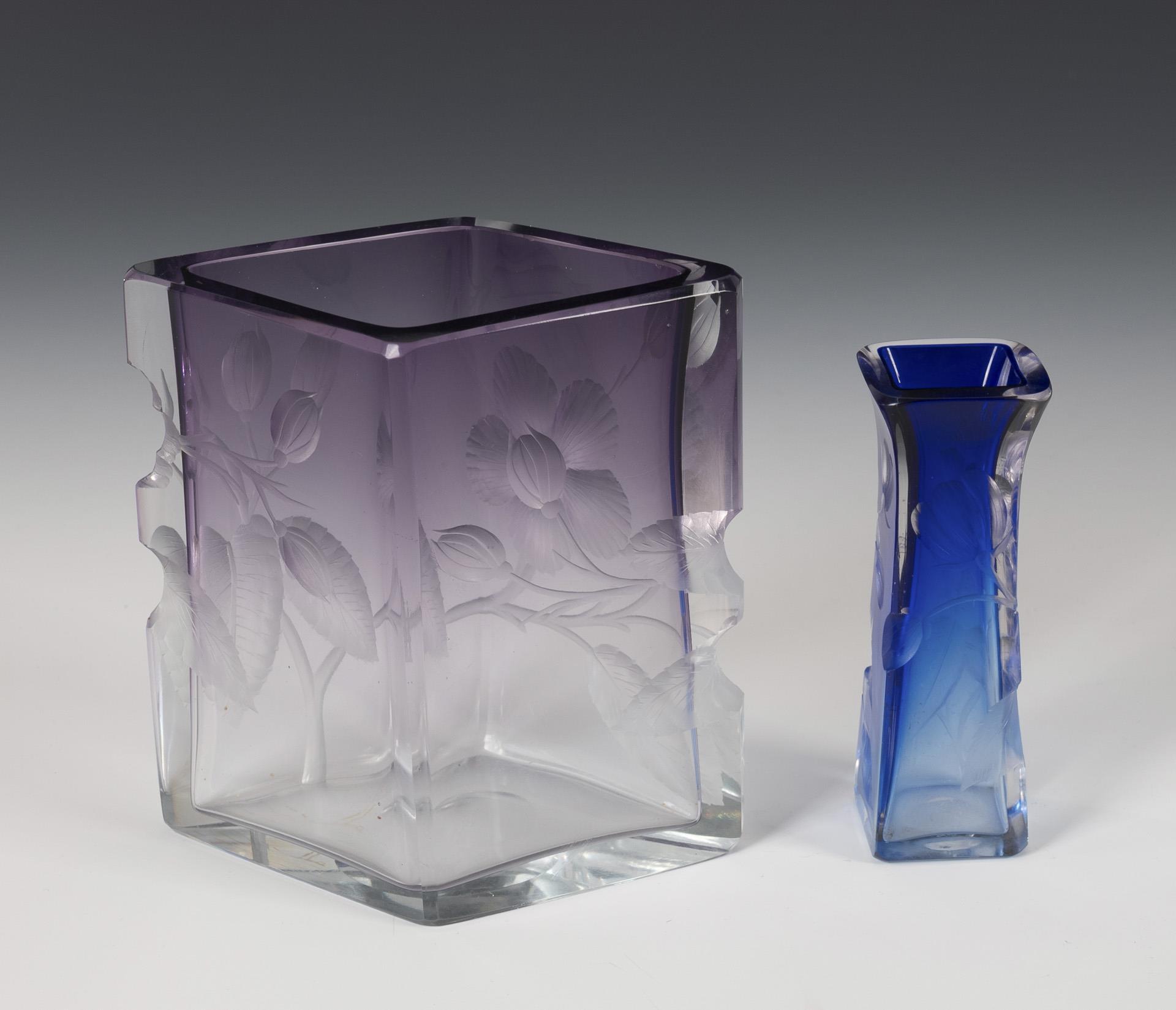 1x unsigniert: rhombenförmige Vase aus farblosem Glas mit manganviolettem Verlauf. / 1x signiert "Moser" (Ätzstempel): kleine quadratische Vase aus farblosem Glas mit kobaltblauem Verlauf. Beide mit tiefgeschnittenen Blumen. Winzige Bestoßungen an den Schliffkanten der kleinen Vase.