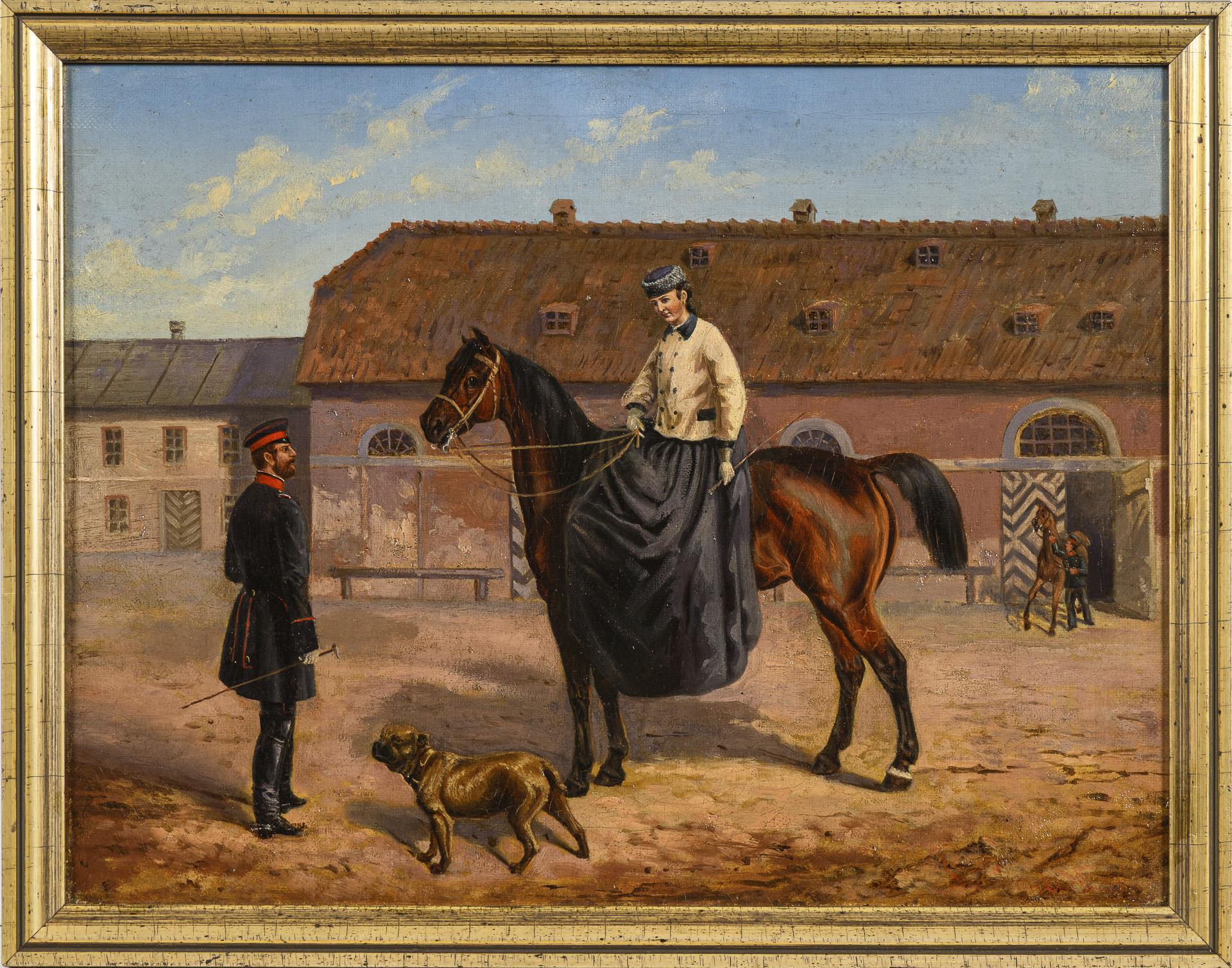 Genreszene mit Dame zu Pferd
