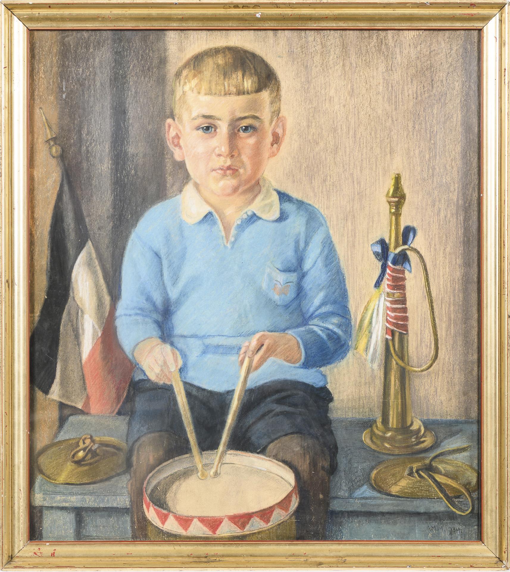 Porträt eines Jungen mit Trommel und Trompete.