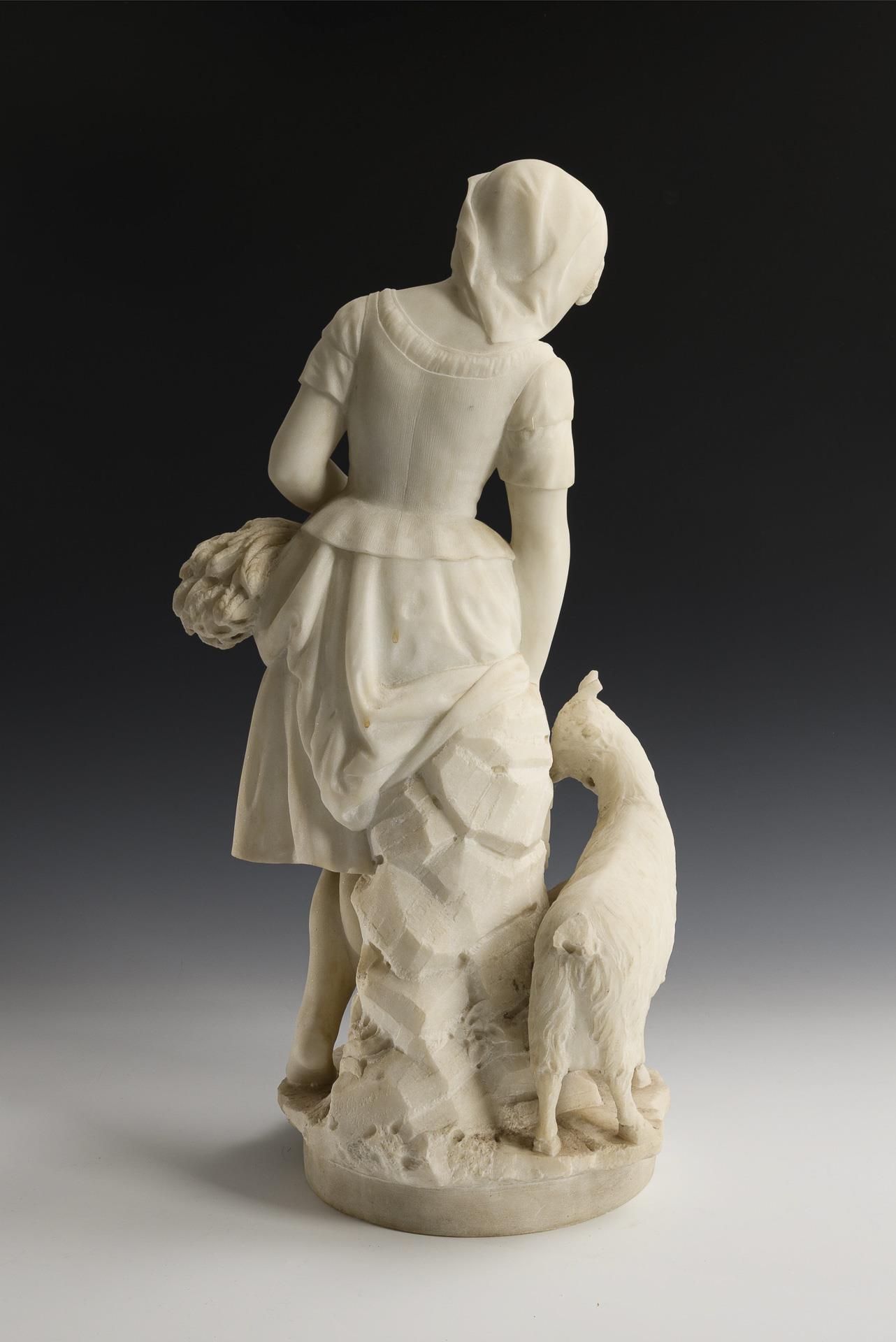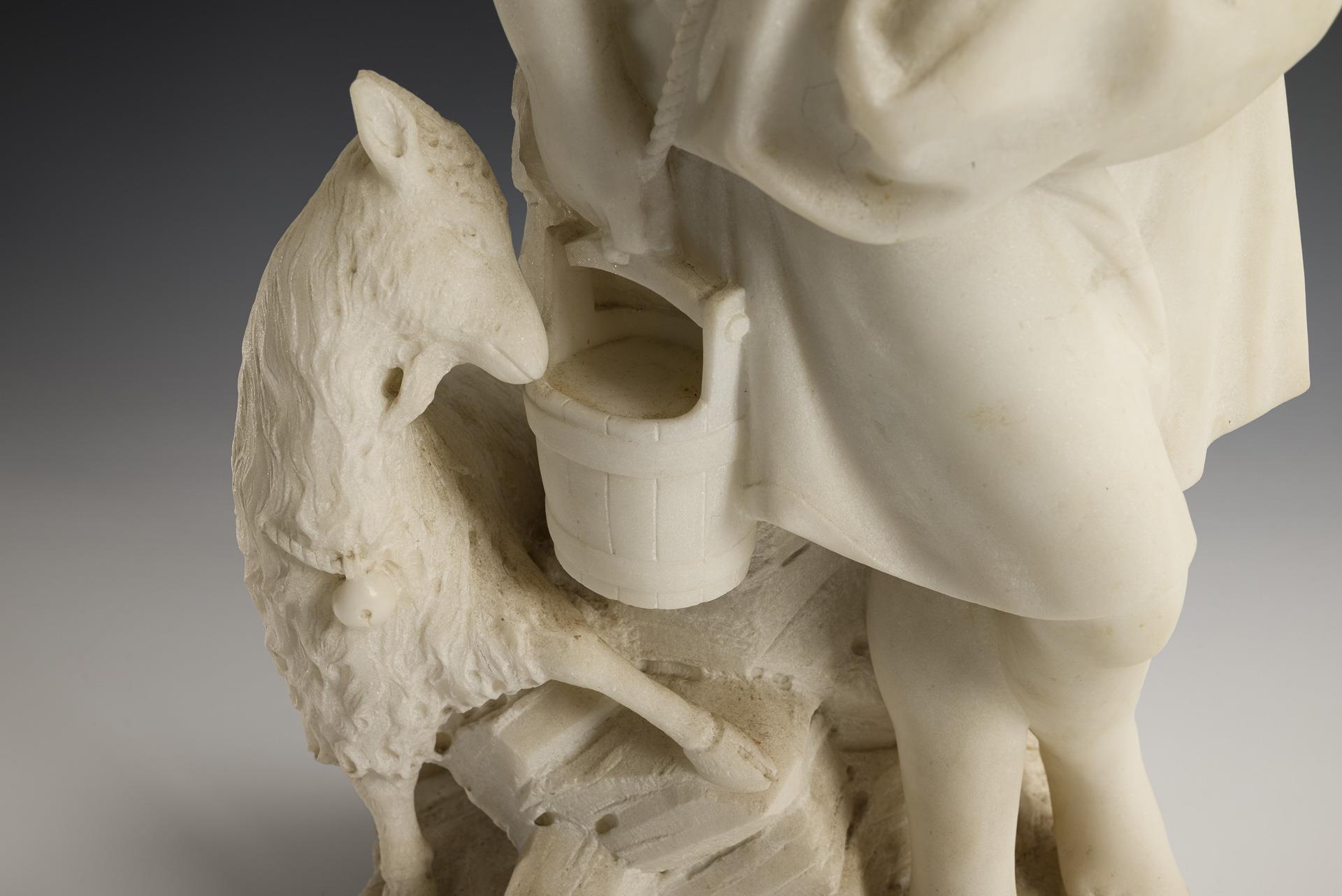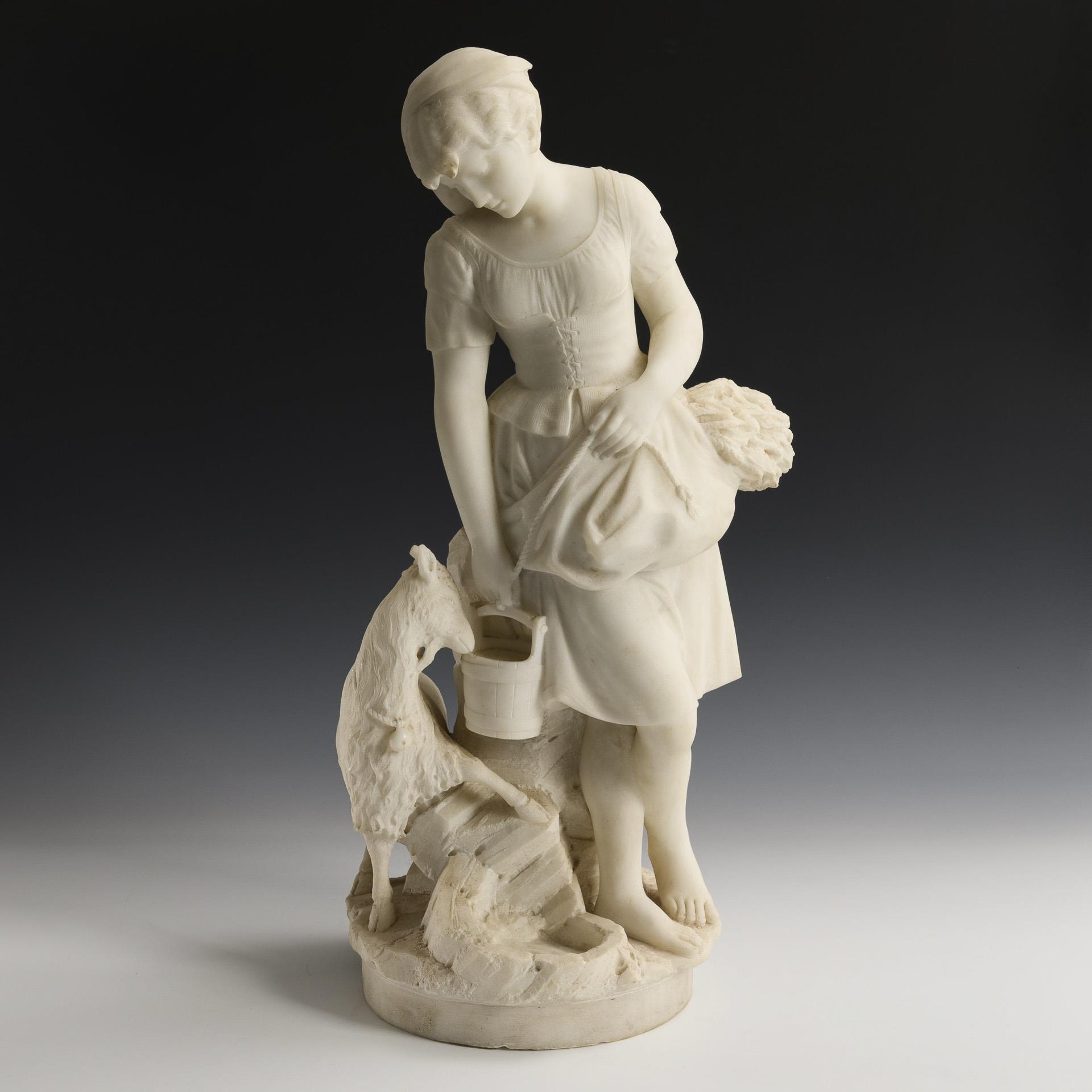 Anmutige Genreszene: Am Brunnen mit gerafftem Rock stehende junge Frau, die die Ziege aus dem Eimer trinken lässt. Hörner und Schwanz der Ziege abgebrochen.