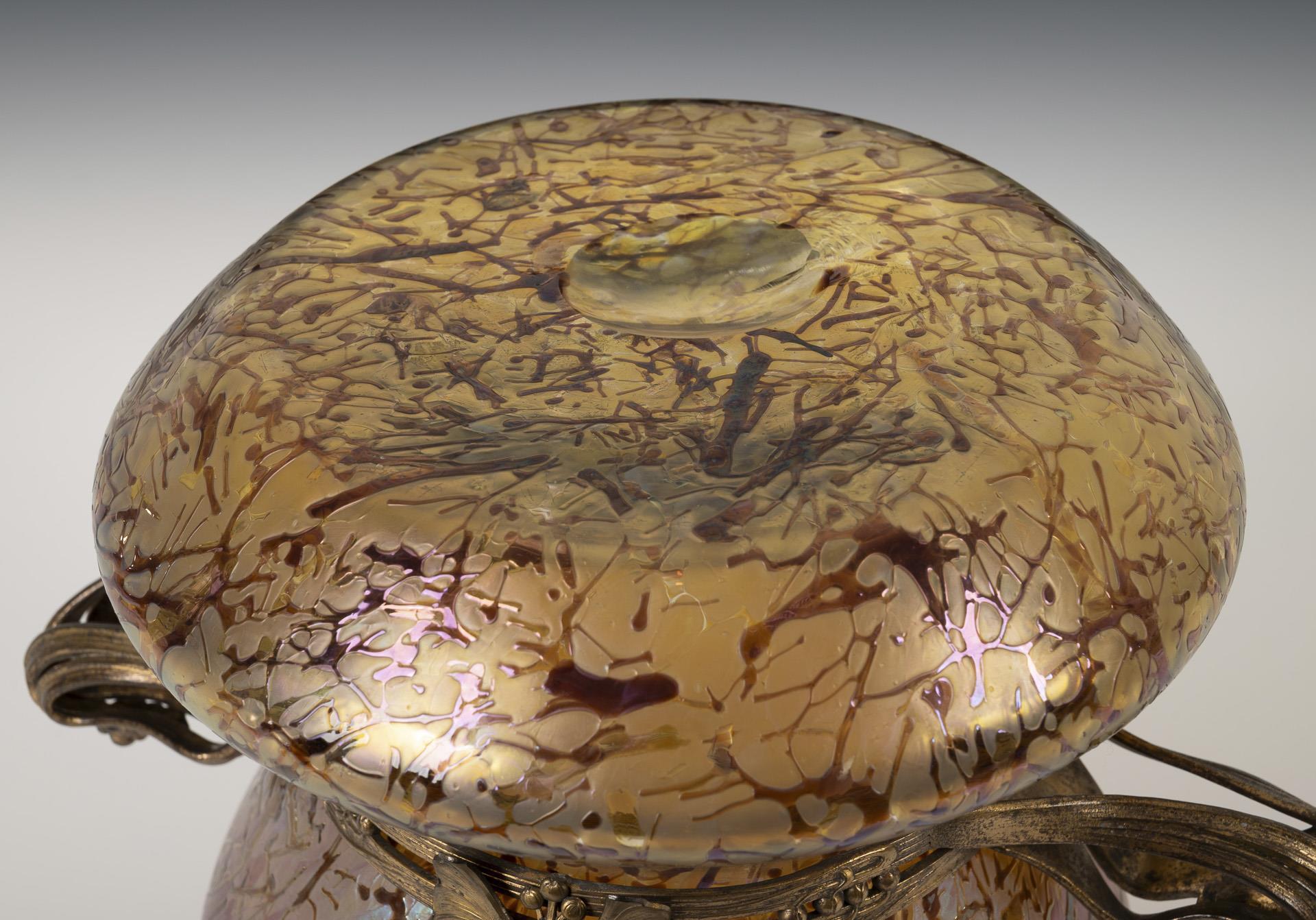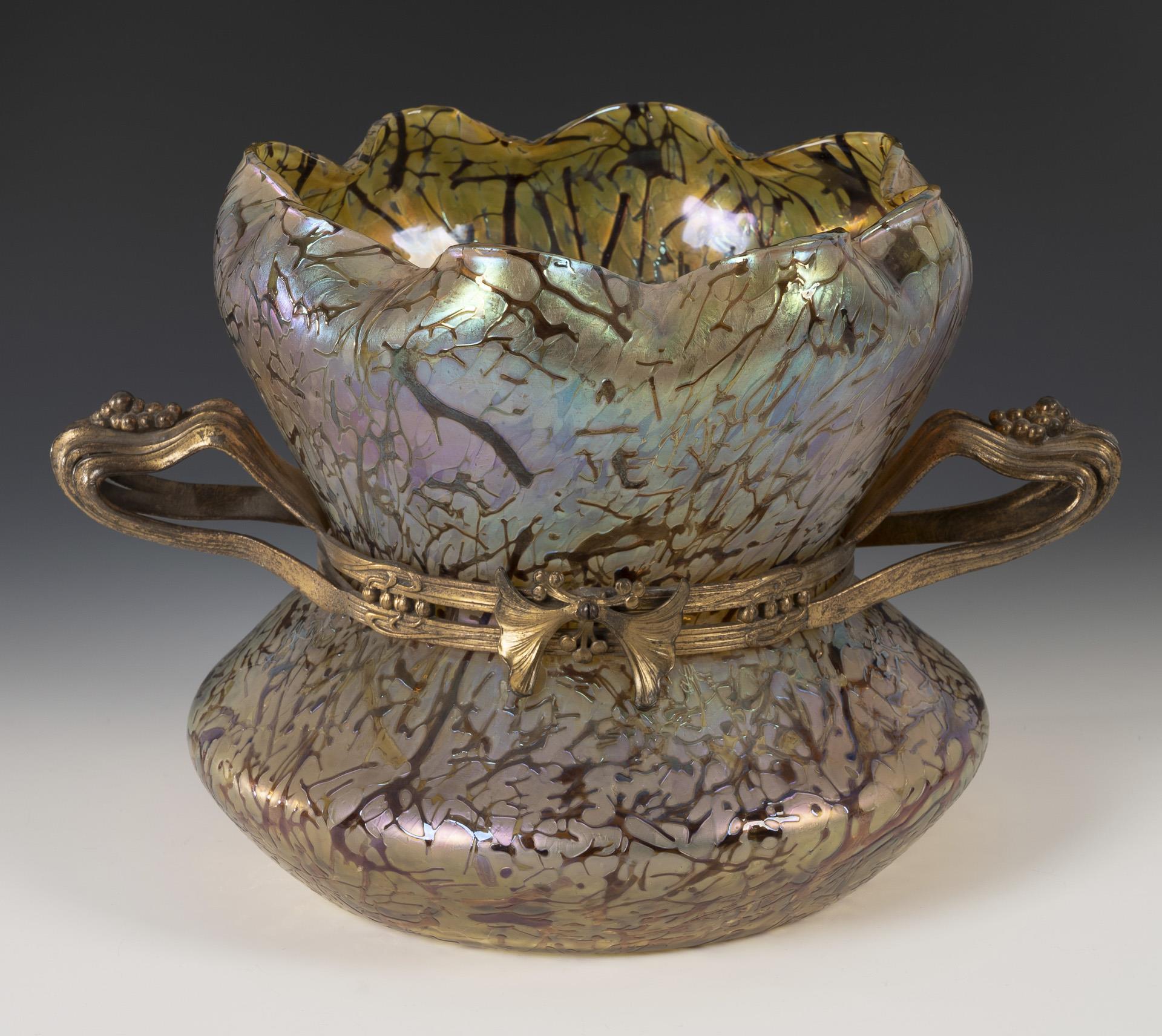 Bauchiger, mittig geschnürter Korpus mit eingezogenem, achtfach gekniffenem Mündungsrand; ausgekugelter Abriss. Auf dem Korpus eine florale Bronzemontierung mit zwei Henkeln.
