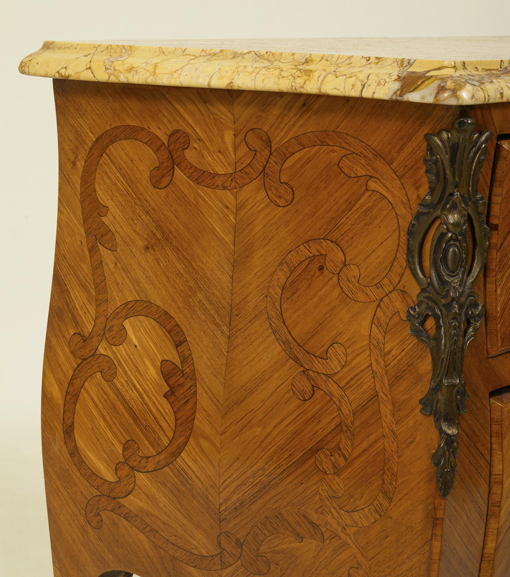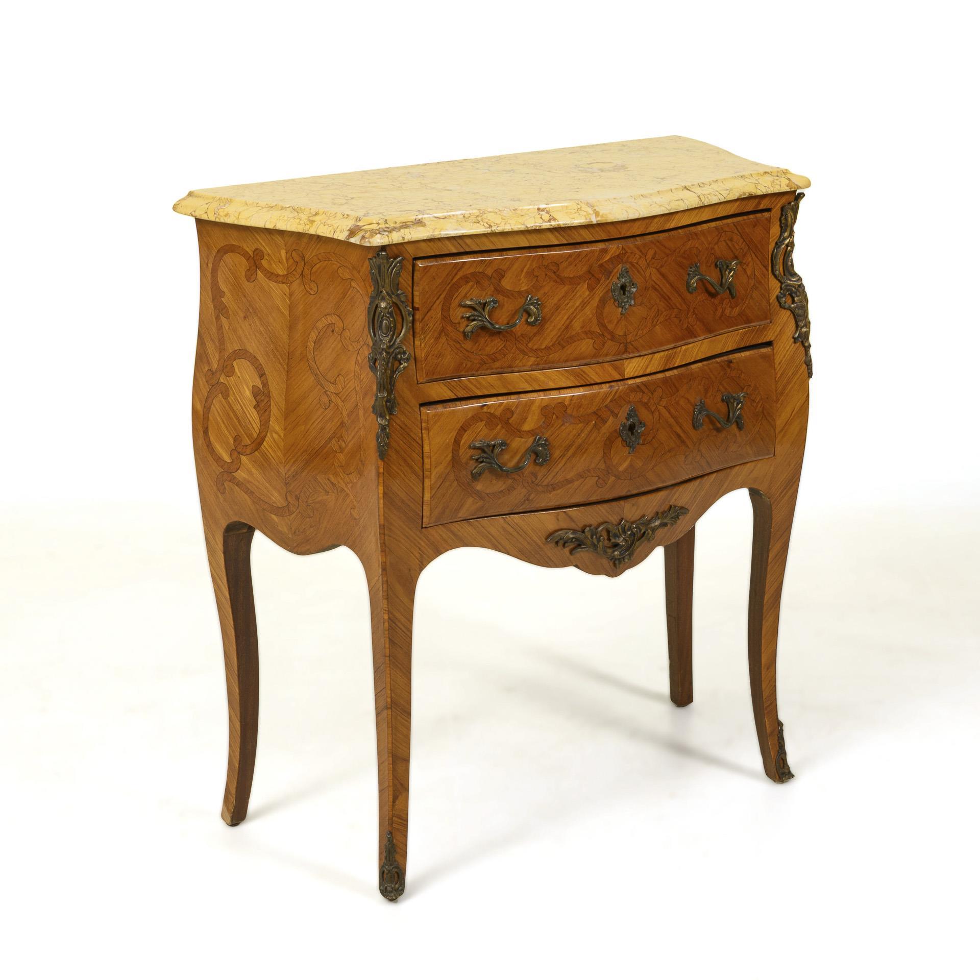 2-schübiger, bombierter Korpus mit geschweifter Marmordeckplatte, auf 4 leicht geschwungenen Beinen. Intarsierte Rocaillen-Bänder. Florale Bronzegriffe und Kantenbeschläge. Bestoßung an Marmorplatte.