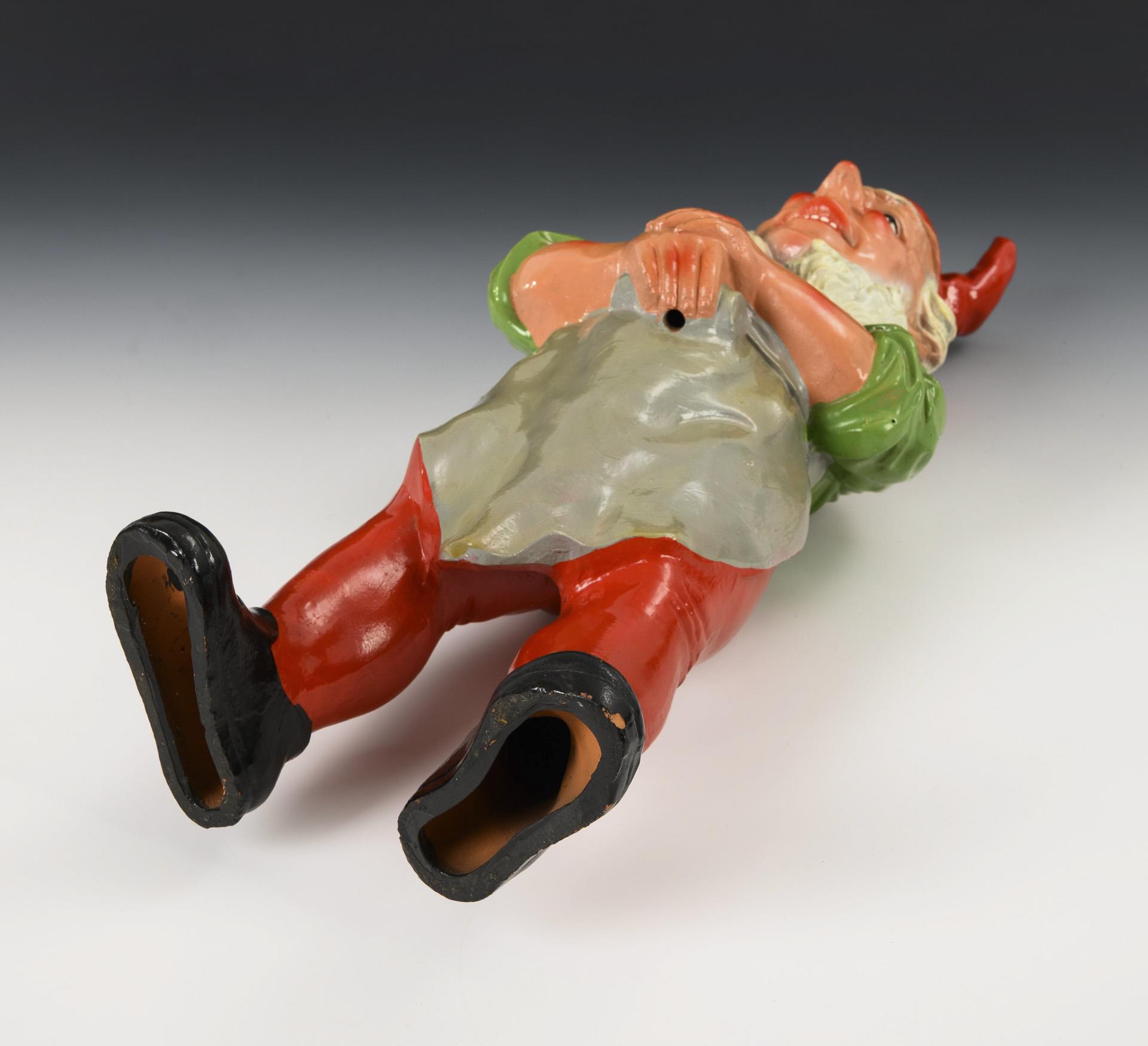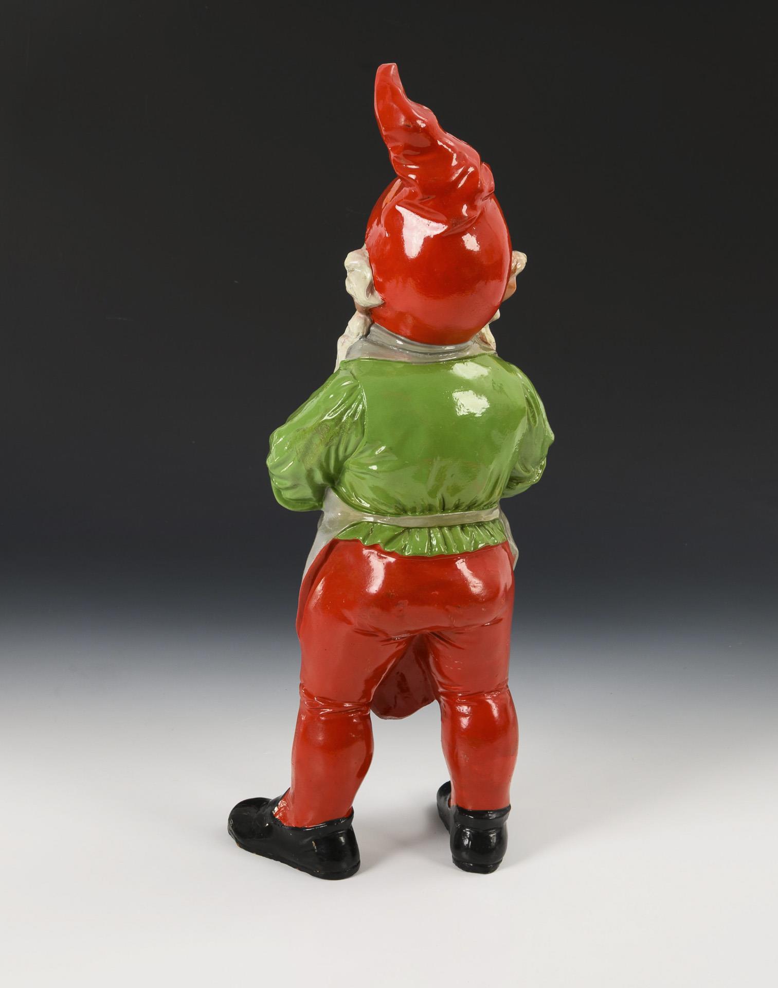 Freundliche Figur eines stehenden Gartenzwergs mit "Schifferkrause" (auch sogenannter "Lincoln"-Bart) und verschränkten Händen, ursprünglich mit einem (Garten-)Arbeitsgerät. Partiell kleine Glasurchips, Attribut in den Händen fehlend.