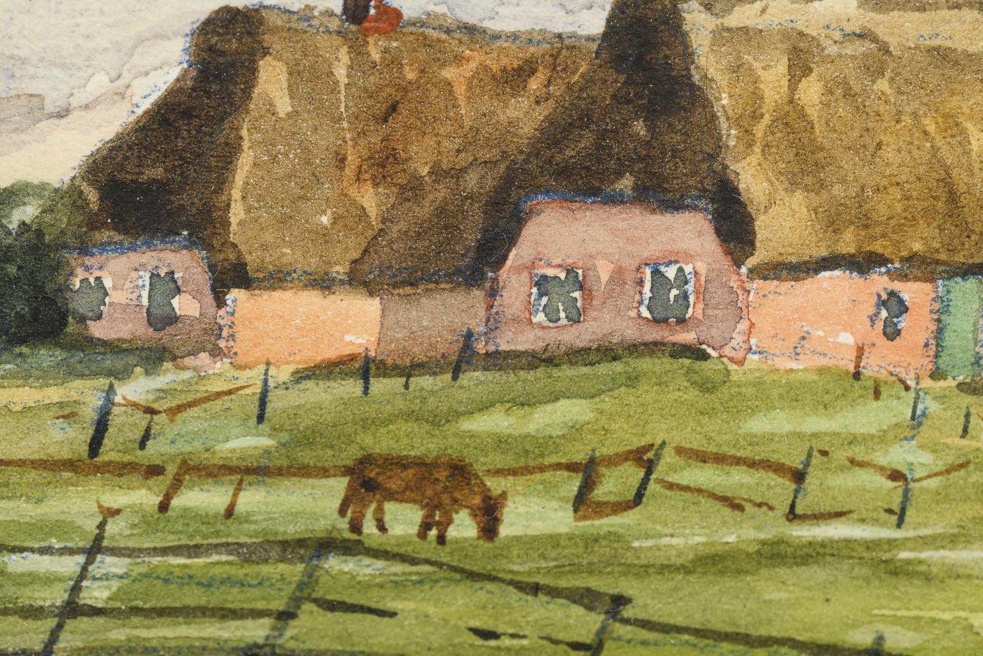 Reetgedeckte Häuser in weiter flacher Landschaft unter leicht wolkigem Himmel.