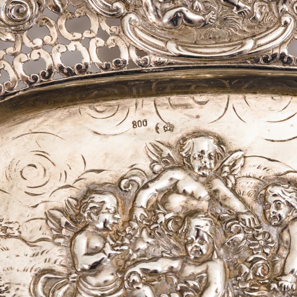 Reich reliefierte Durchbruchschale im Hanauer Stil, verziert mit Putten, Blütenkörben und Rosengirlanden. Winzige Bruch- und Lötstellen.