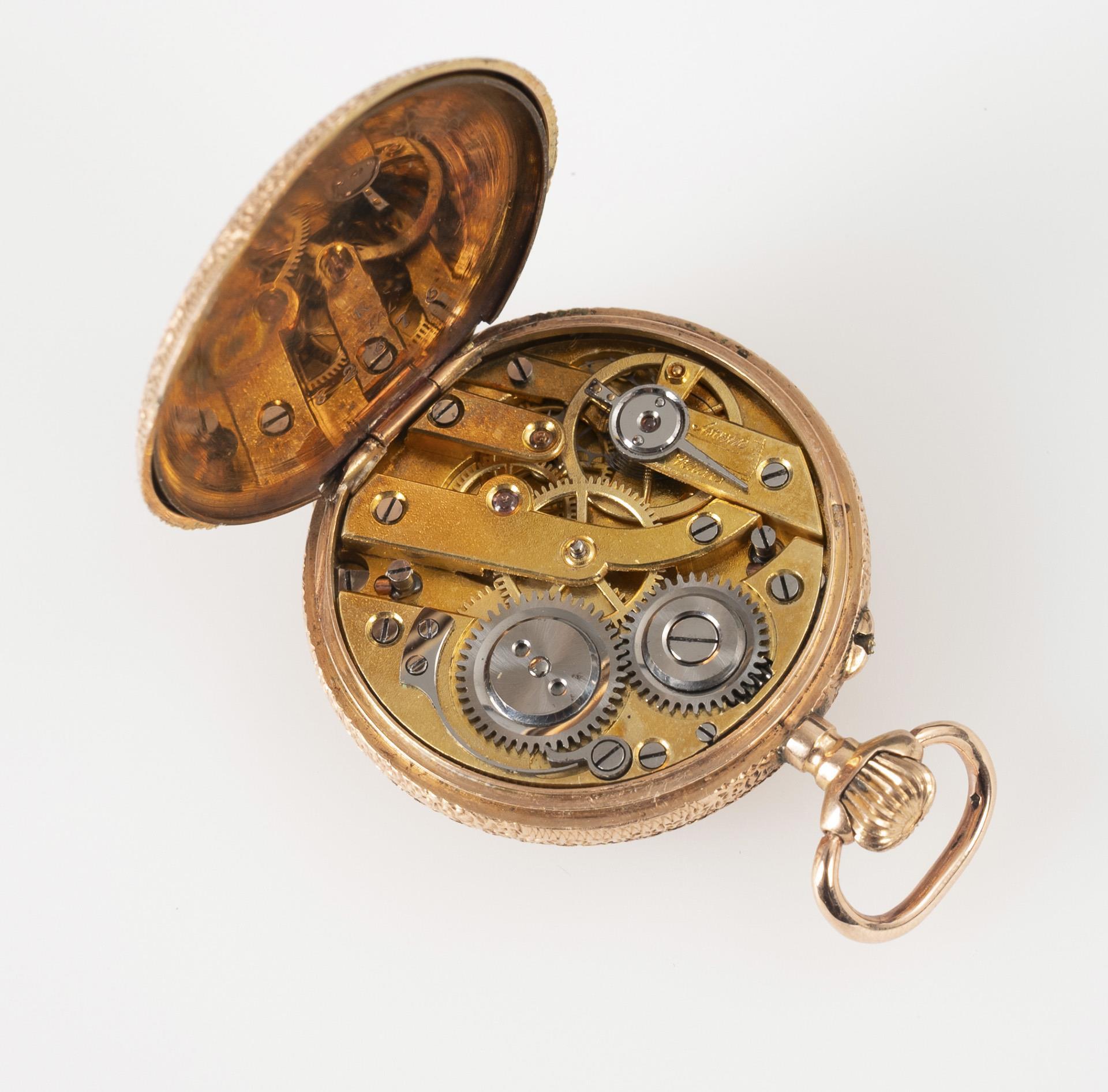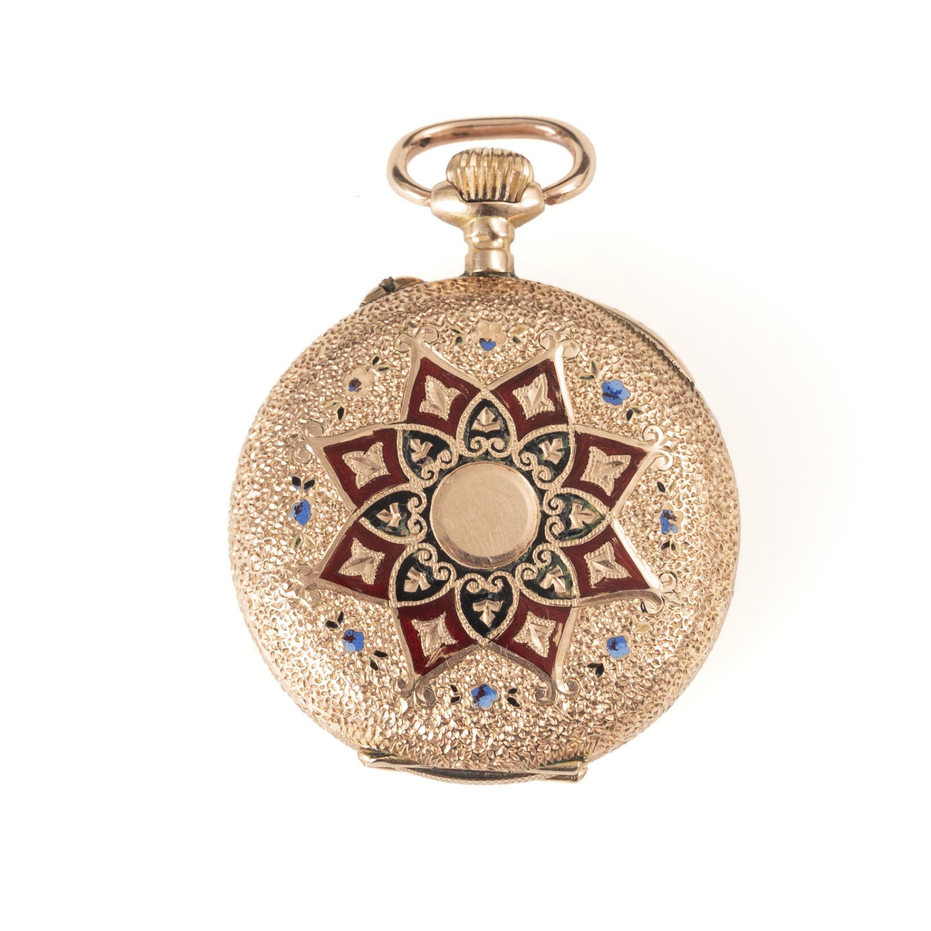 Goldene Damentaschenuhr mit farbig emaillierter Sternrosette.