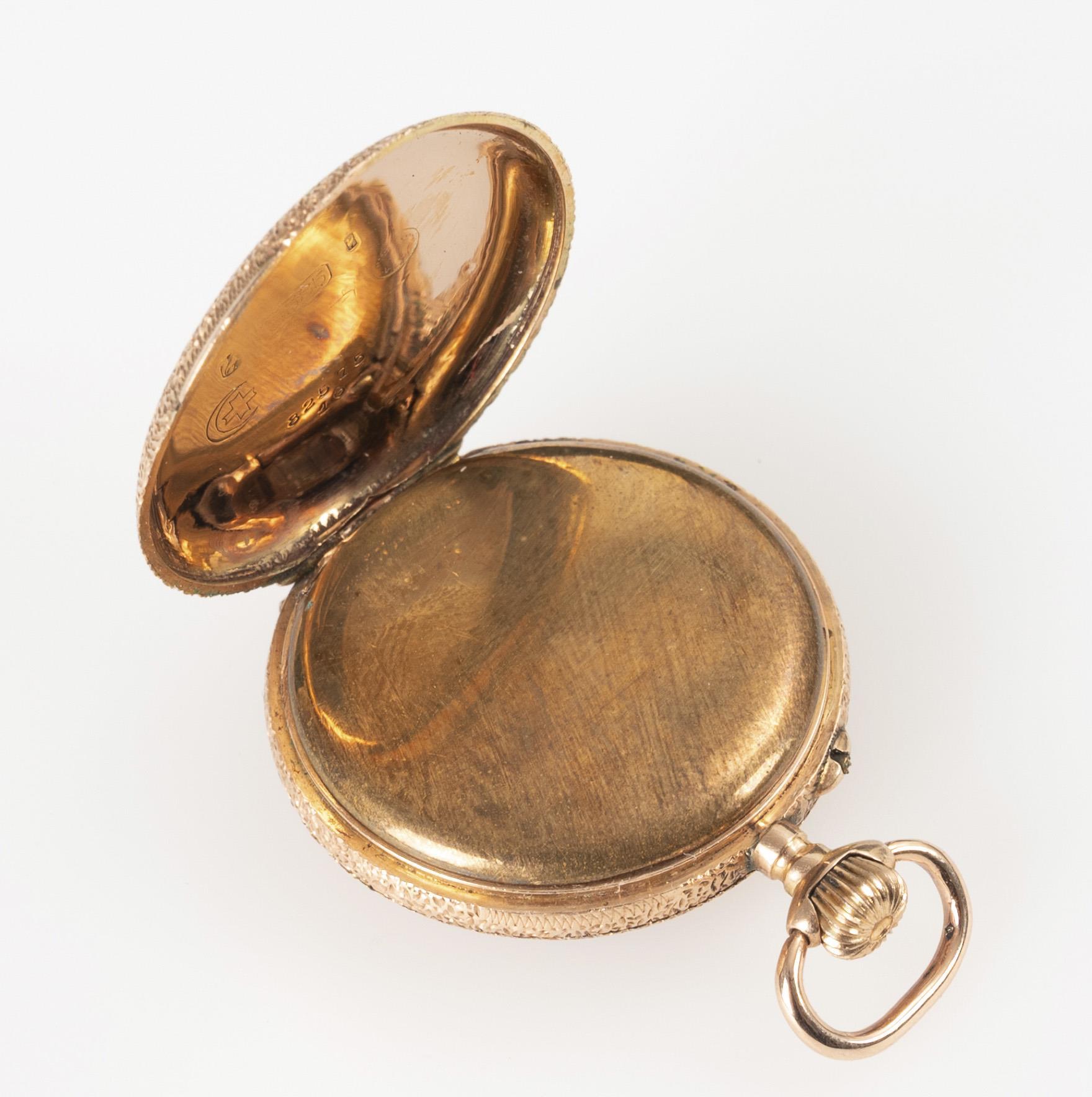 585 gepunzt, Schweizer Beschauzeichen, Feingehaltsstempel, Staubdeckel aus Metall. Ø 3 cm. 19 g.