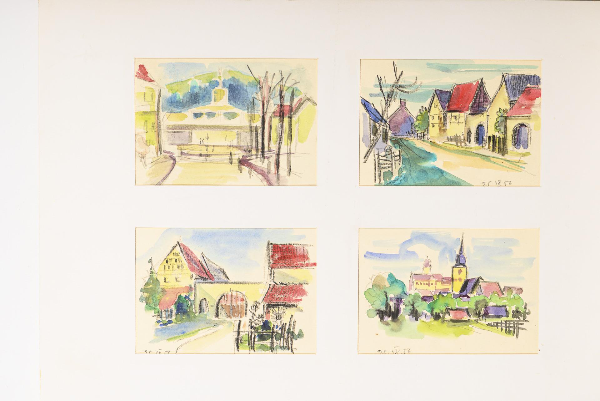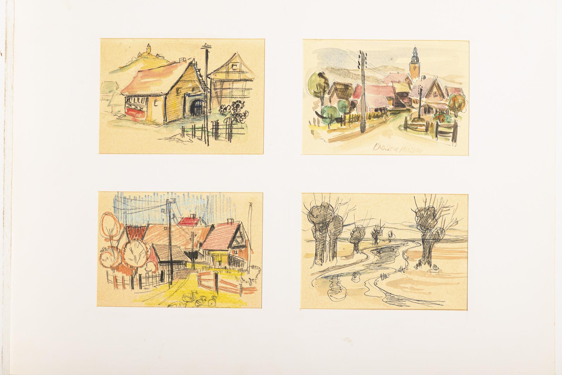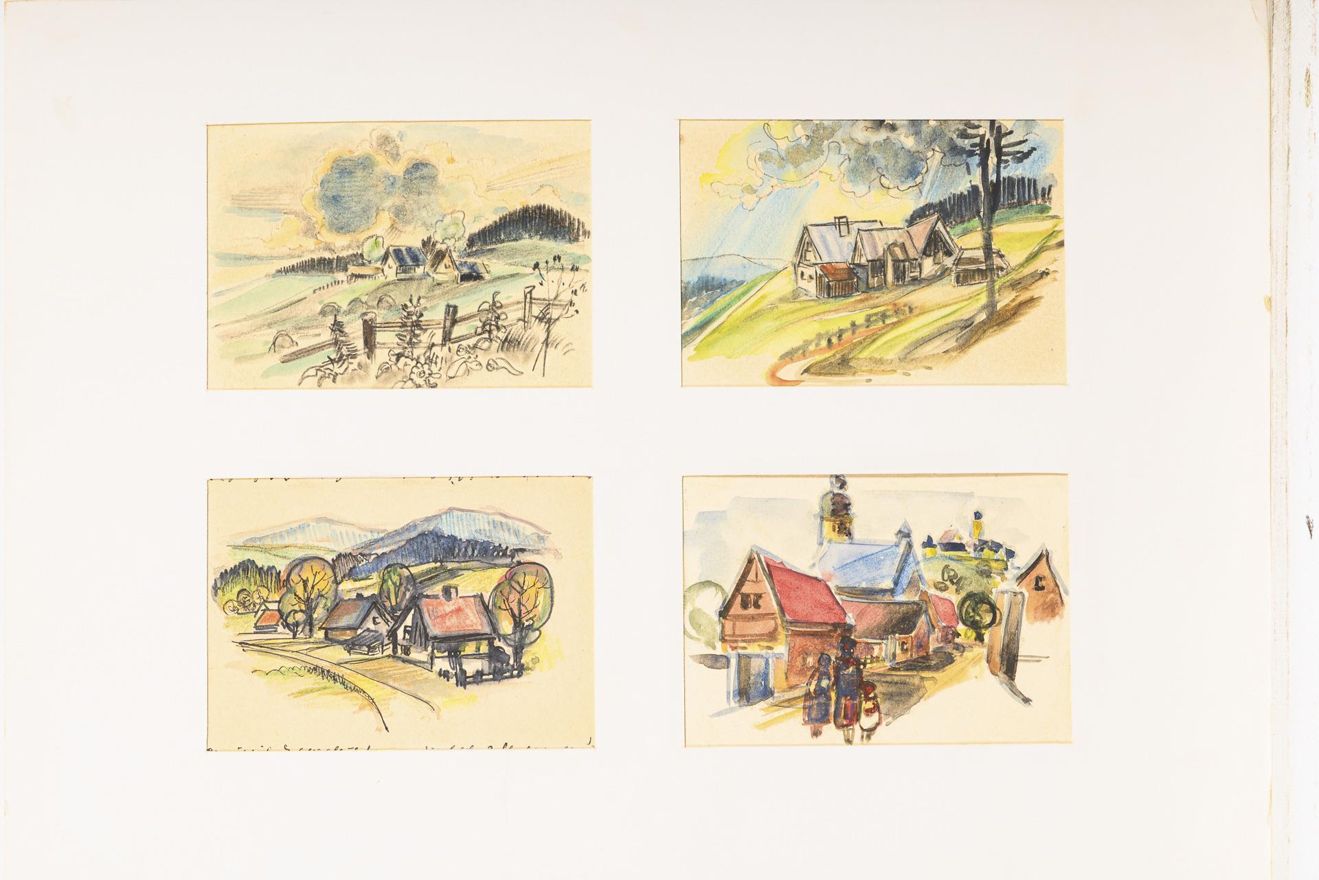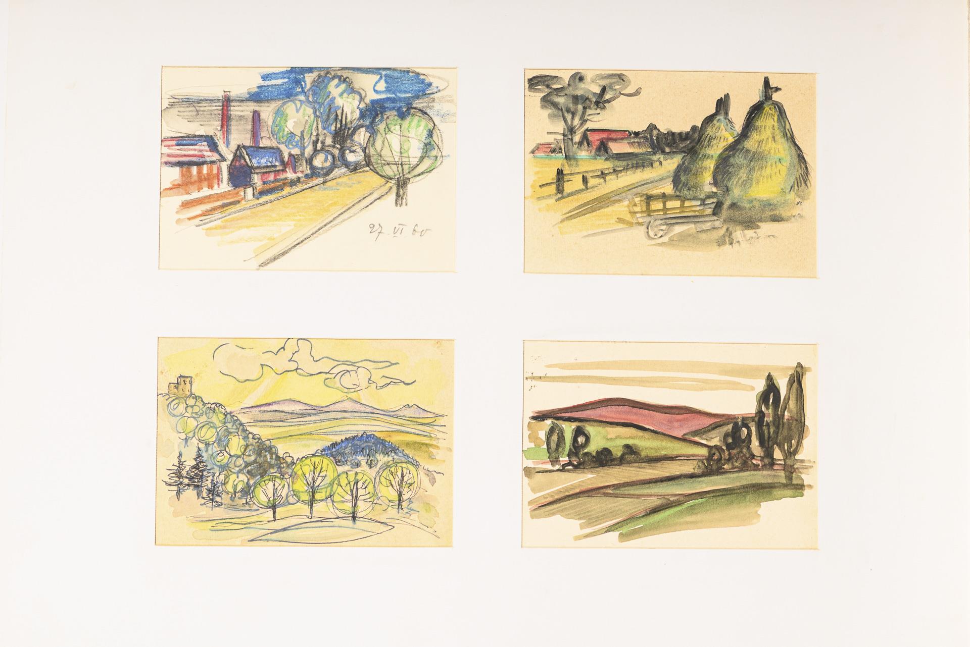 Farbstift, Bleistift, Tusche, Aquarell. In der Mappe bezeichnet.