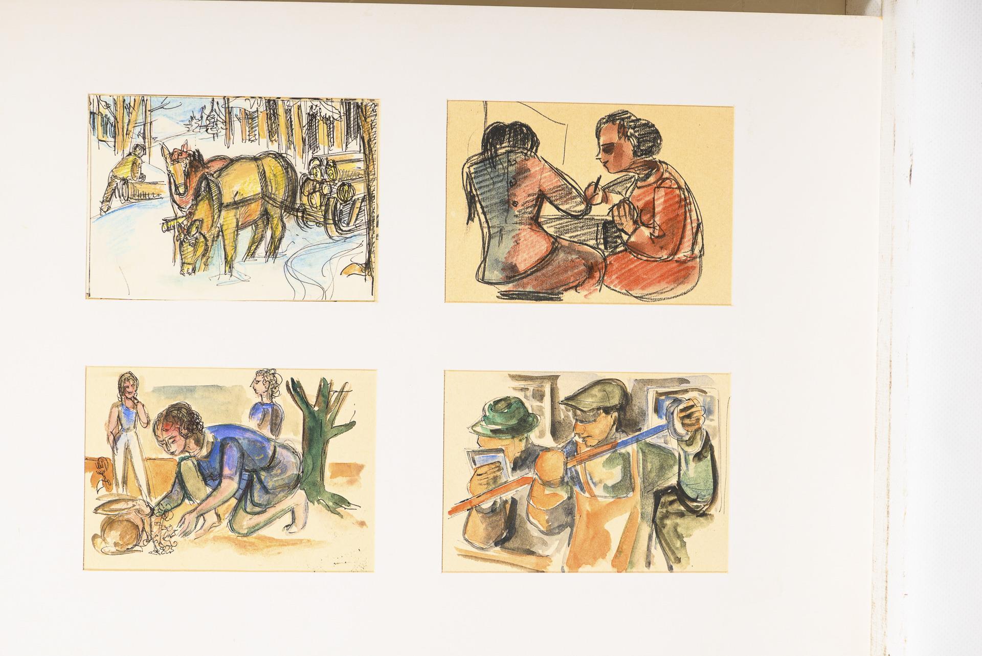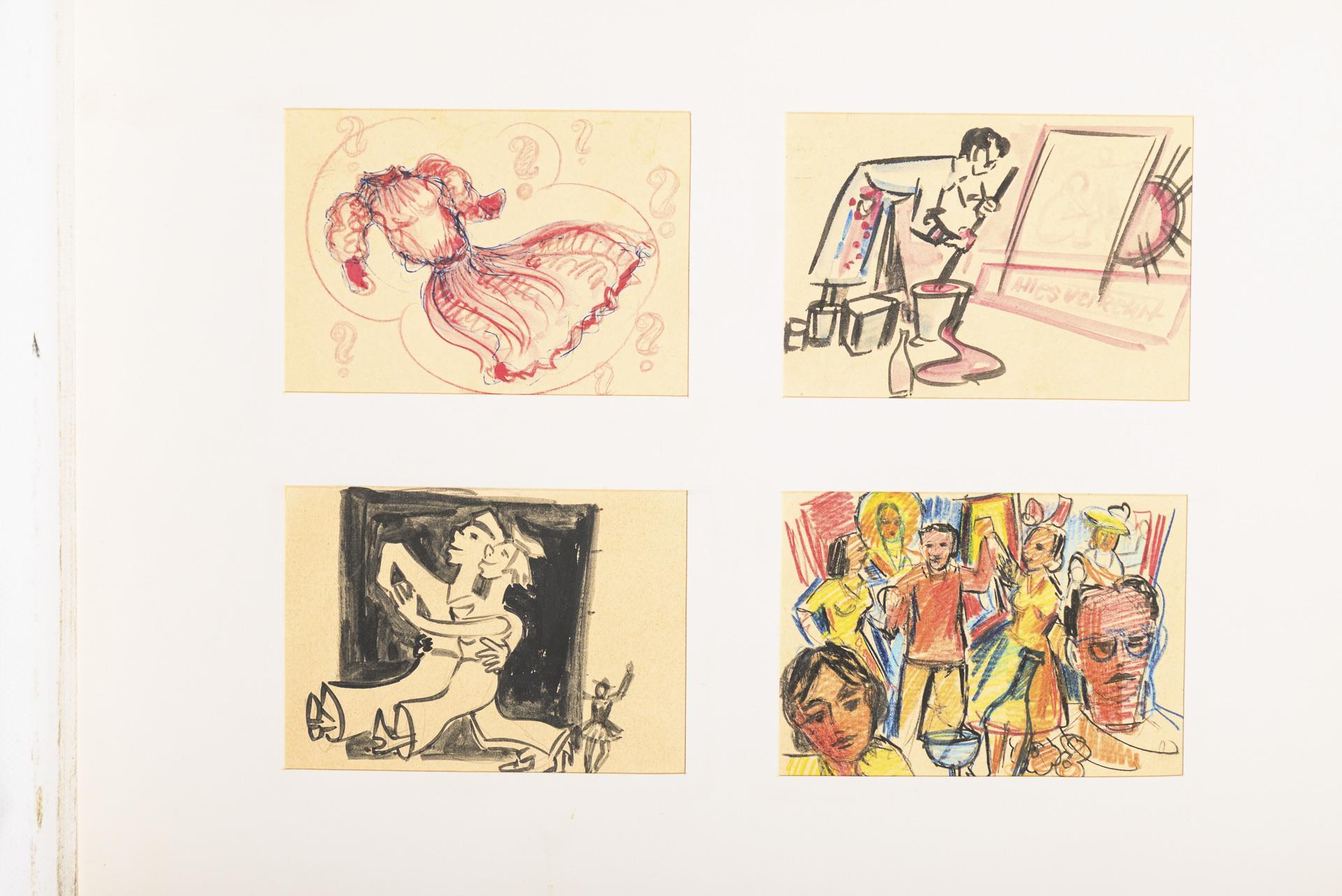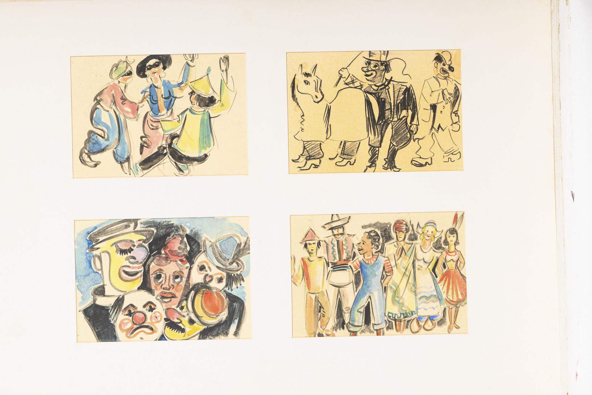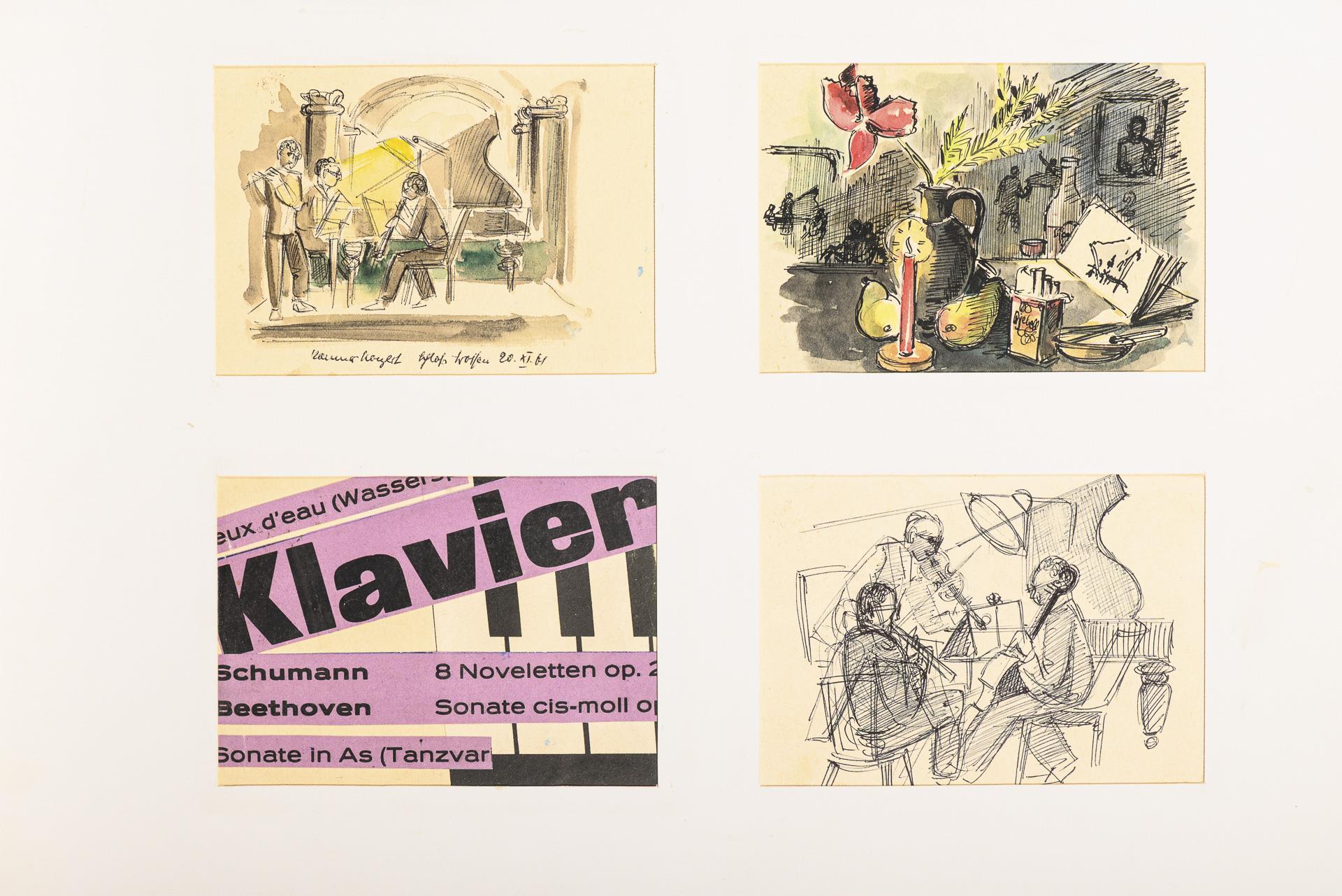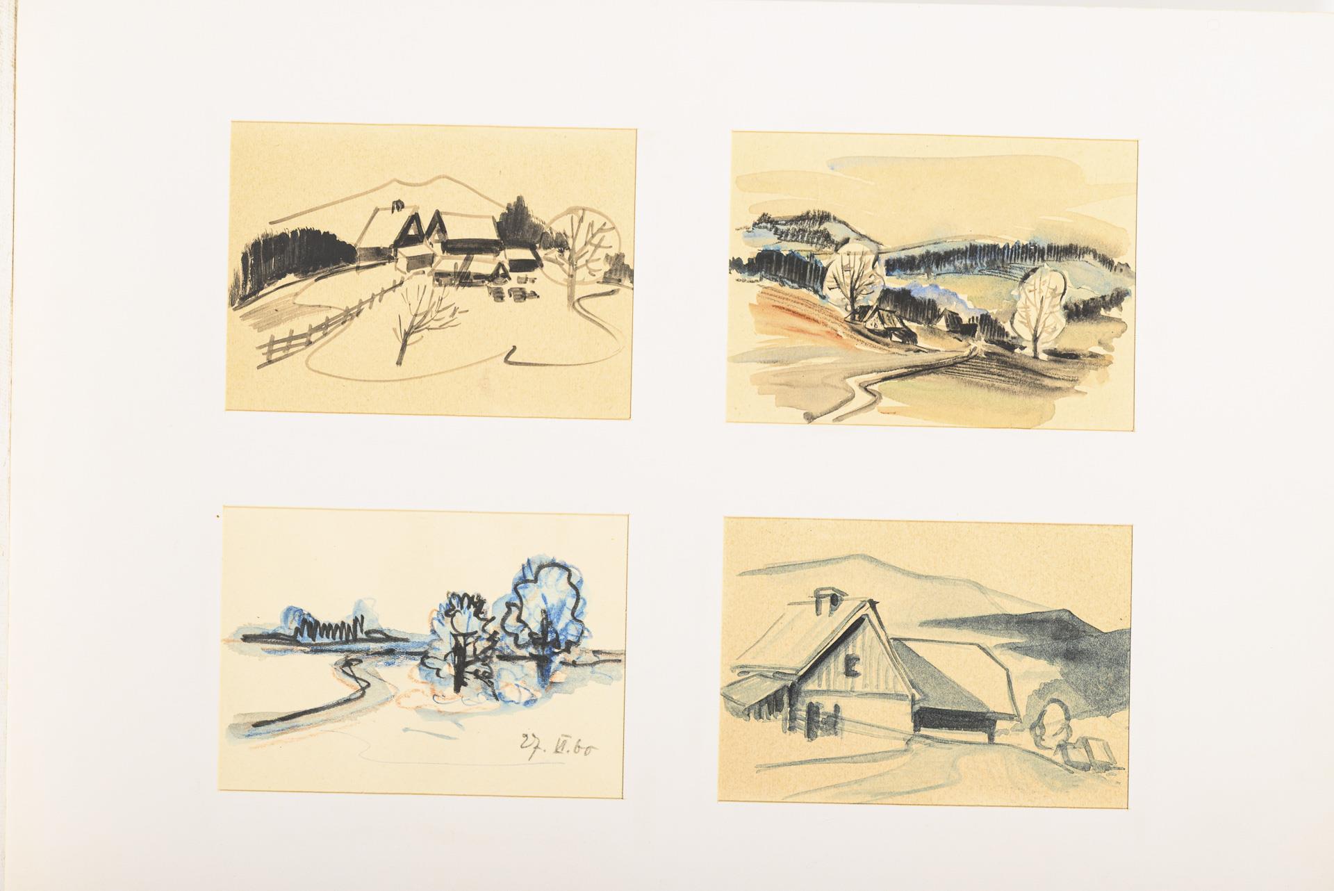 Farbstift, Bleistift, Tusche, Aquarell. In der Mappe bezeichnet.
