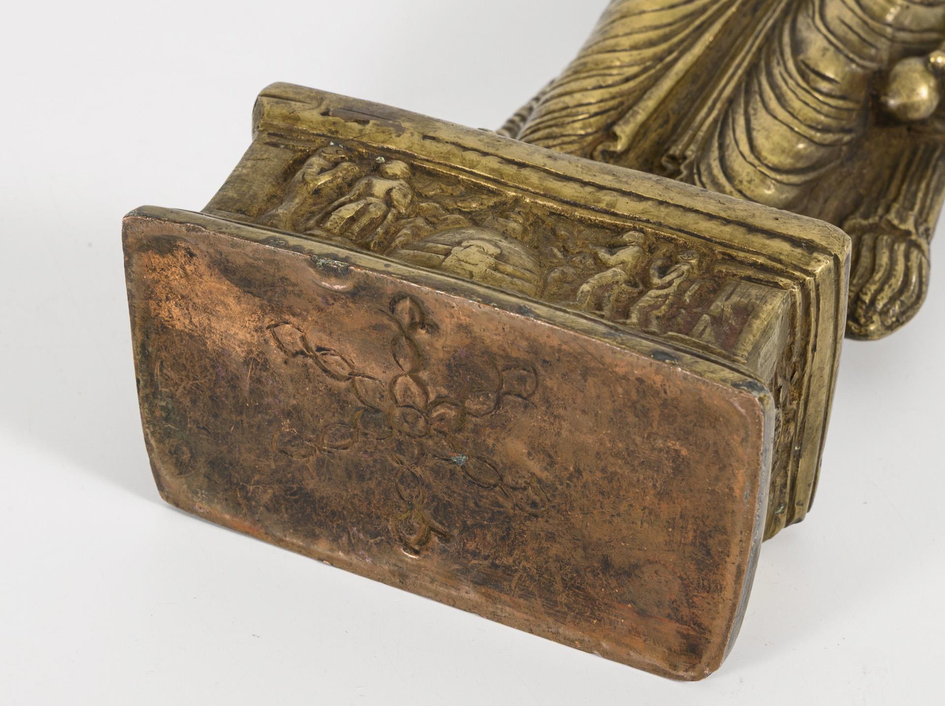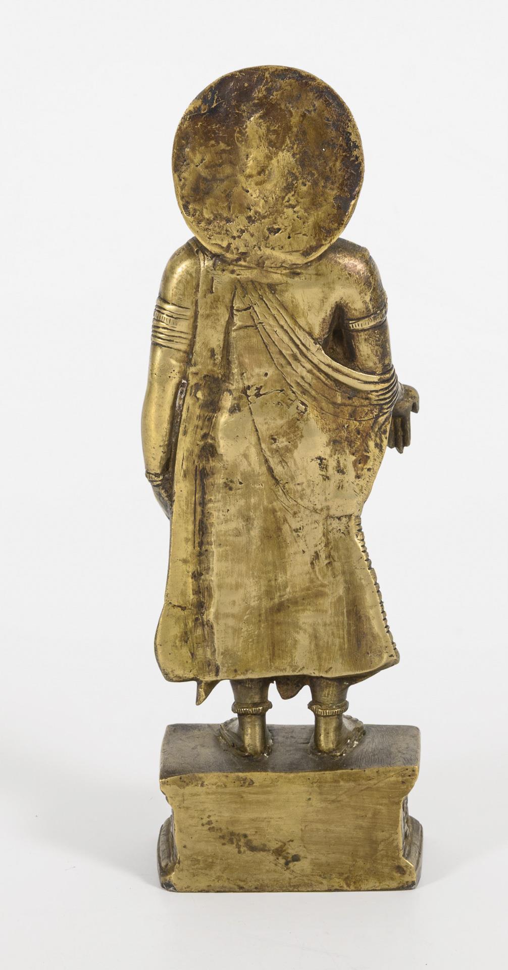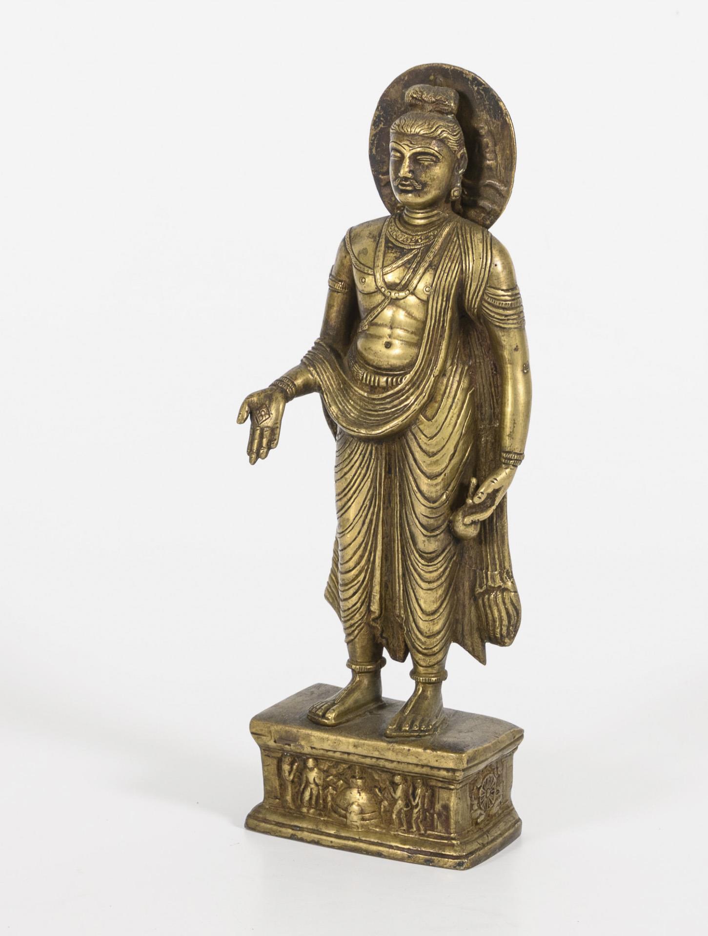 Herausstechendes Merkmal der Figur ist das jugendliche Aussehen und der Oberlippenbart. Buddha, bekleidet mit reich gefaltetem Gewand und Schmuck sowie einem detailliert ausgeführten Haarknoten. In einer Hand einen kleinen Beutel haltend, die andere mit Rhombus-Zeichen, dem Betrachter zugewandt. In der Aureole oder Nimbus im Flachrelief dargestellt zwei weitere Buddhafiguren. Im Sockel Reliefszene mit Hanuman, Boden geschlossen. Im Typus Anlehnung an den Ghandara-Stil.