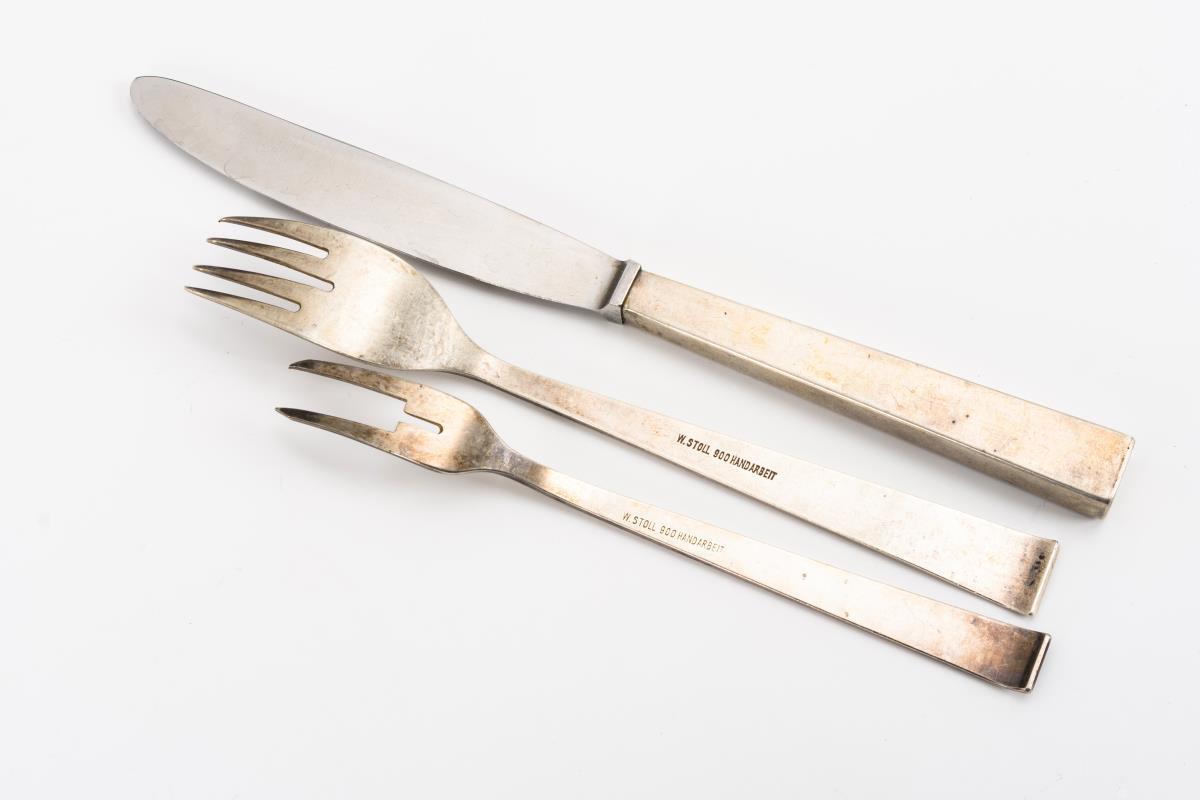 16 Teile. Schlichter Entwurf im Art-Déco-Stil, bestehend aus 6 Menügabeln, 6 Menümessern und 4 kleinen Vorlegegabeln. Heller Originalkasten.