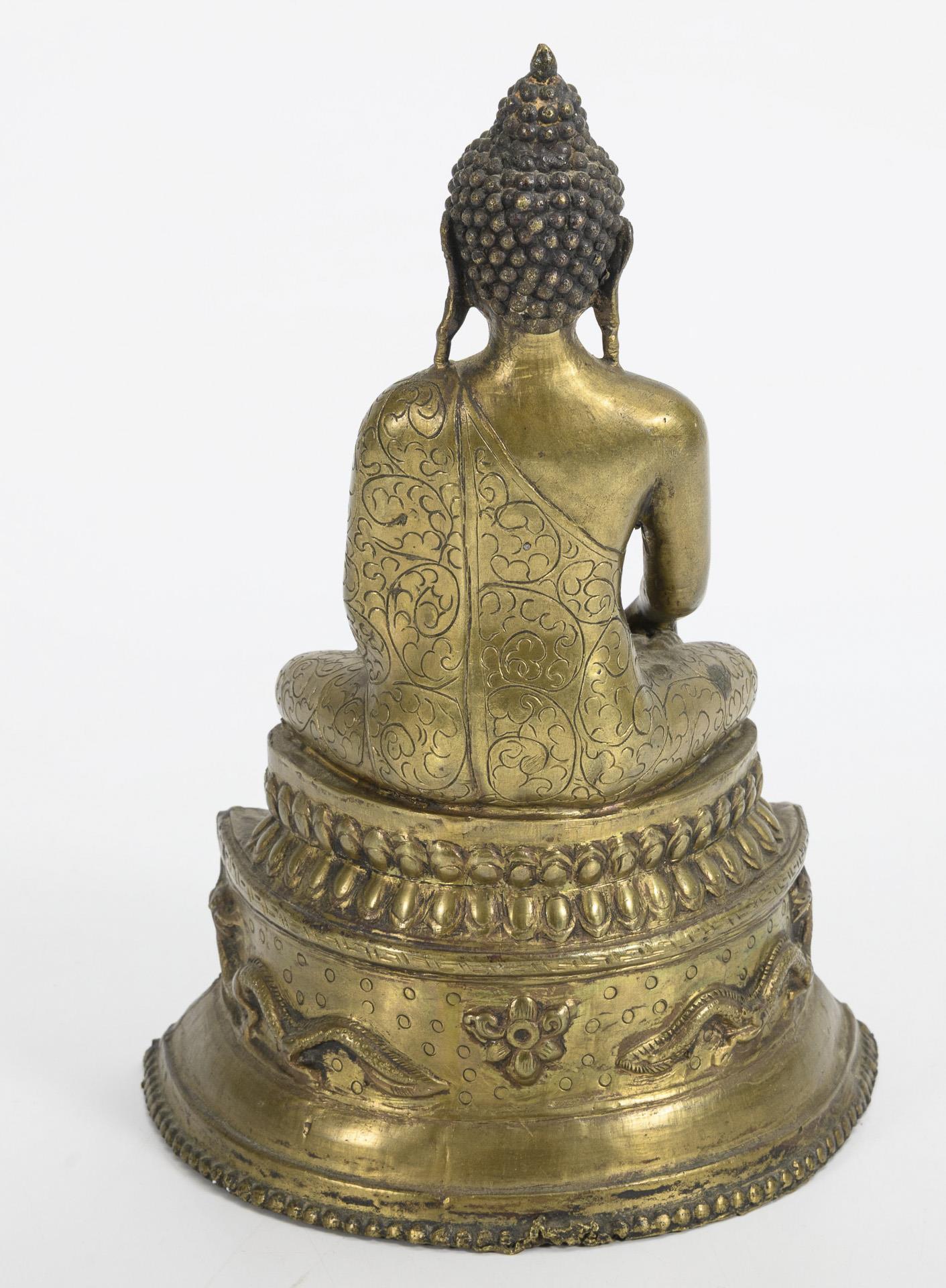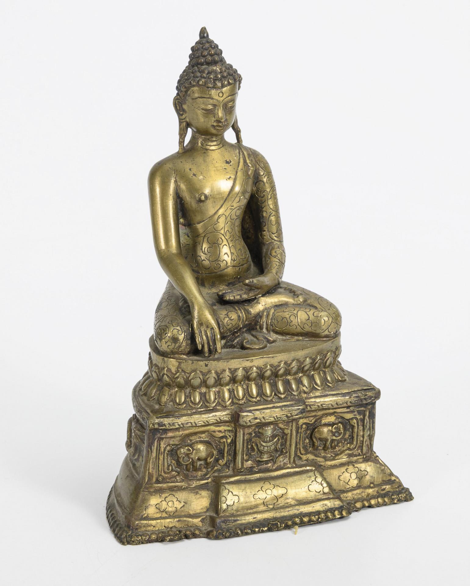 Auf hohem Sockel und doppeltem Lotosthron ruhender Buddha mit der Geste der Erdberührung. Im Sockel reliefierte Elefanten und Drachen. Unterste Kante mit Perlmuster mit kleineren Beschädigungen.