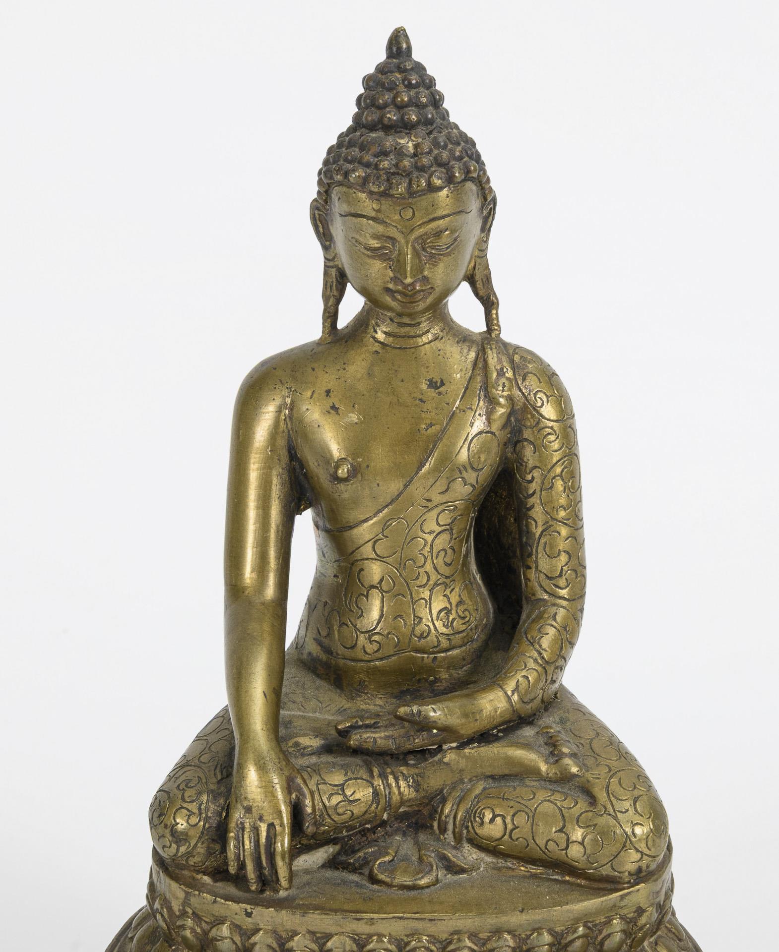 Sitzender Buddha auf hohem Sockel.
