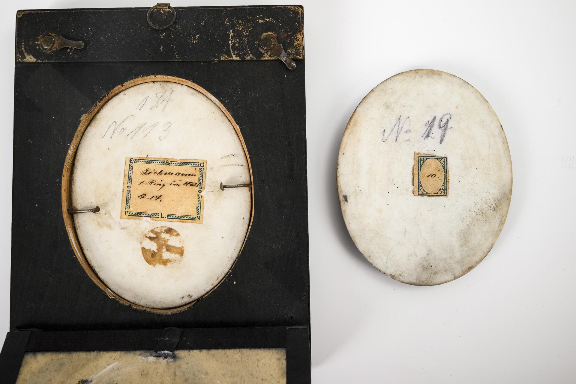 Ovale Plaketten: 1x mit der Darstellung "Der Raub des Ganymed" nach Rembrandt (1606-1669); 1x mit der Darstellung einer Südländerin mit Goldreif.