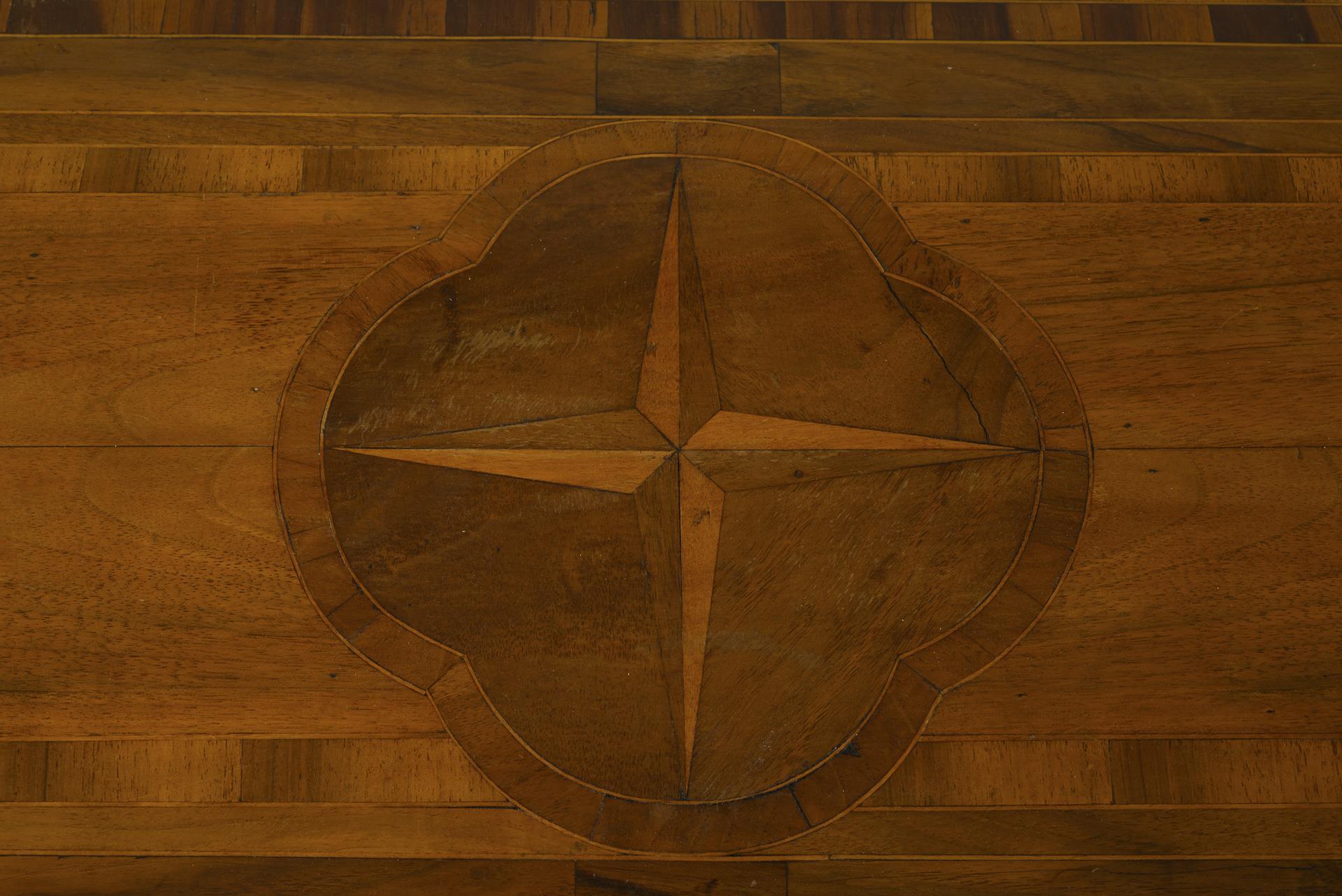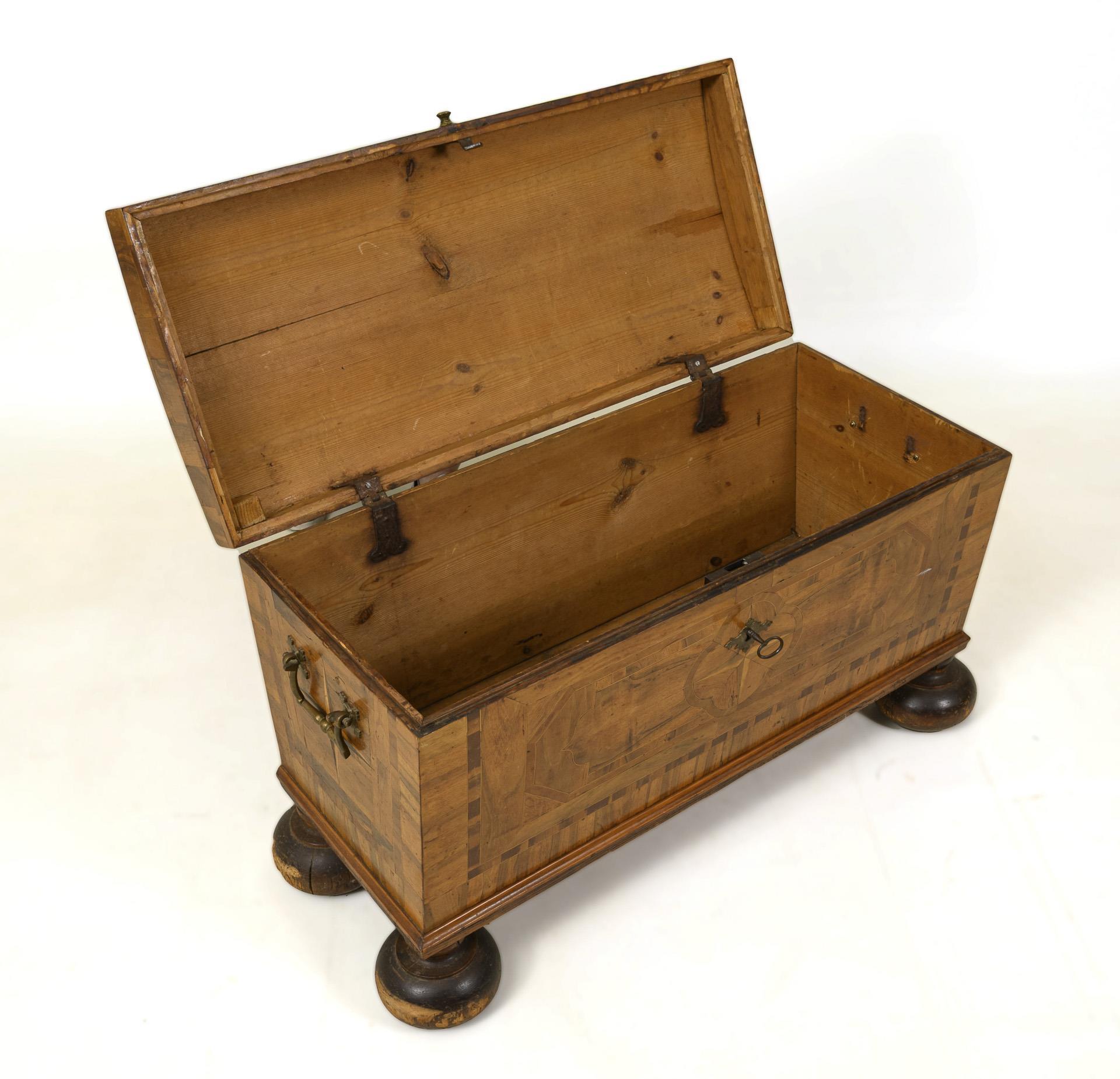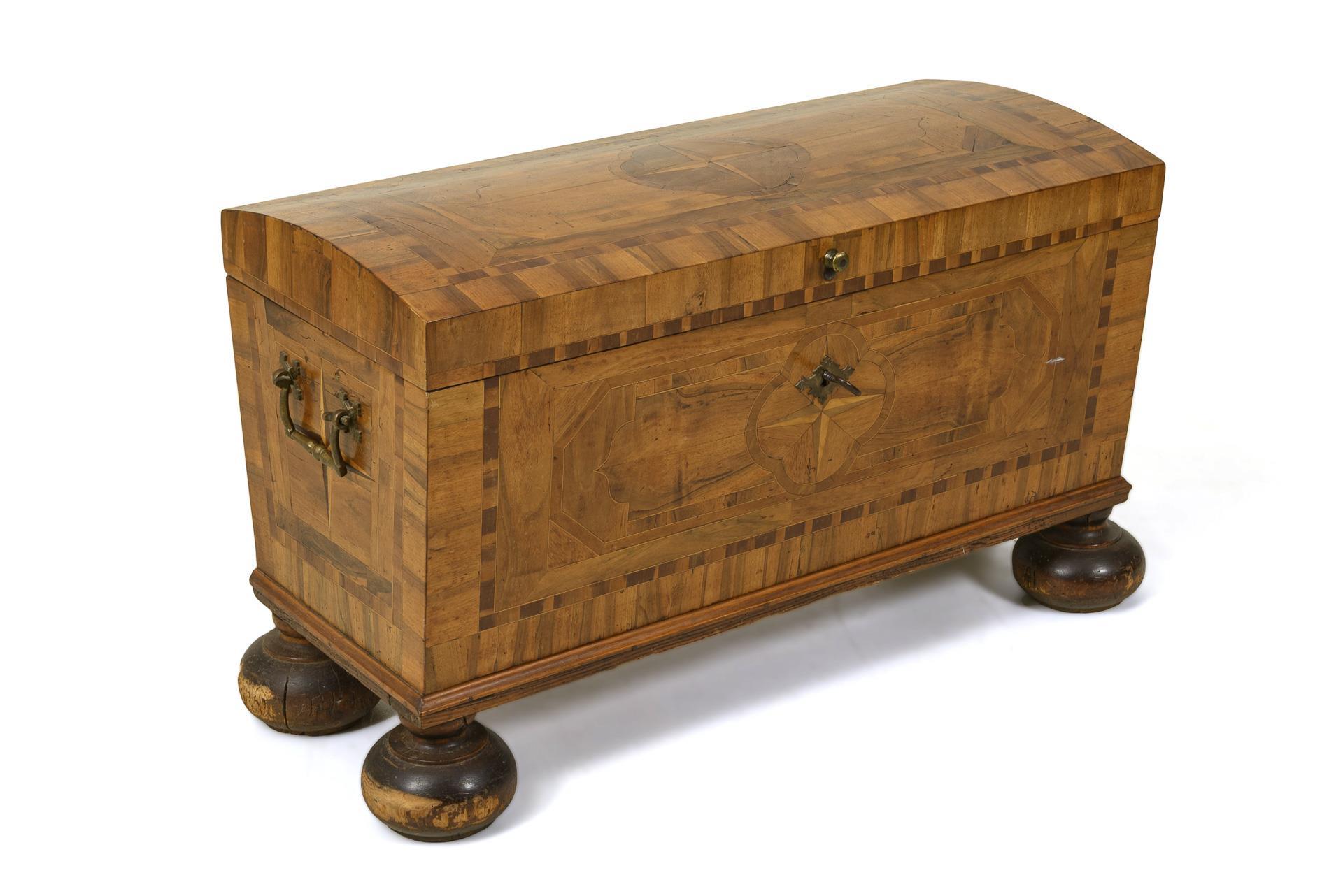 Gewölbter, klappbarer Scharnierdeckel, schauseitig reich intarsierter Korpus mit Scheinkassettierungen und Sternmotiven, rückseitig ohne Furnier, auf 4 großen, gedrückten Kugelfüßen. Knauf, Schlüssellochbeschlag und seitliche Bügelgriffe aus Messing, Schloss und Beschläge innen aus Eisen. Restauriert, mit Ergänzungen. Alters- und Gebrauchsspuren, inaktiver Anobienbefall, Risse.