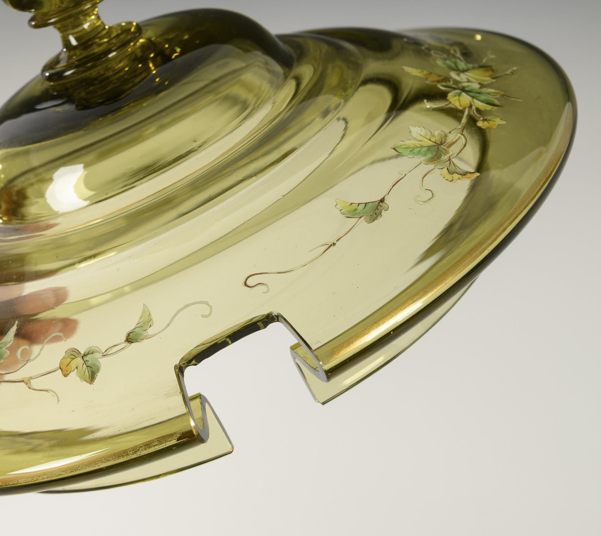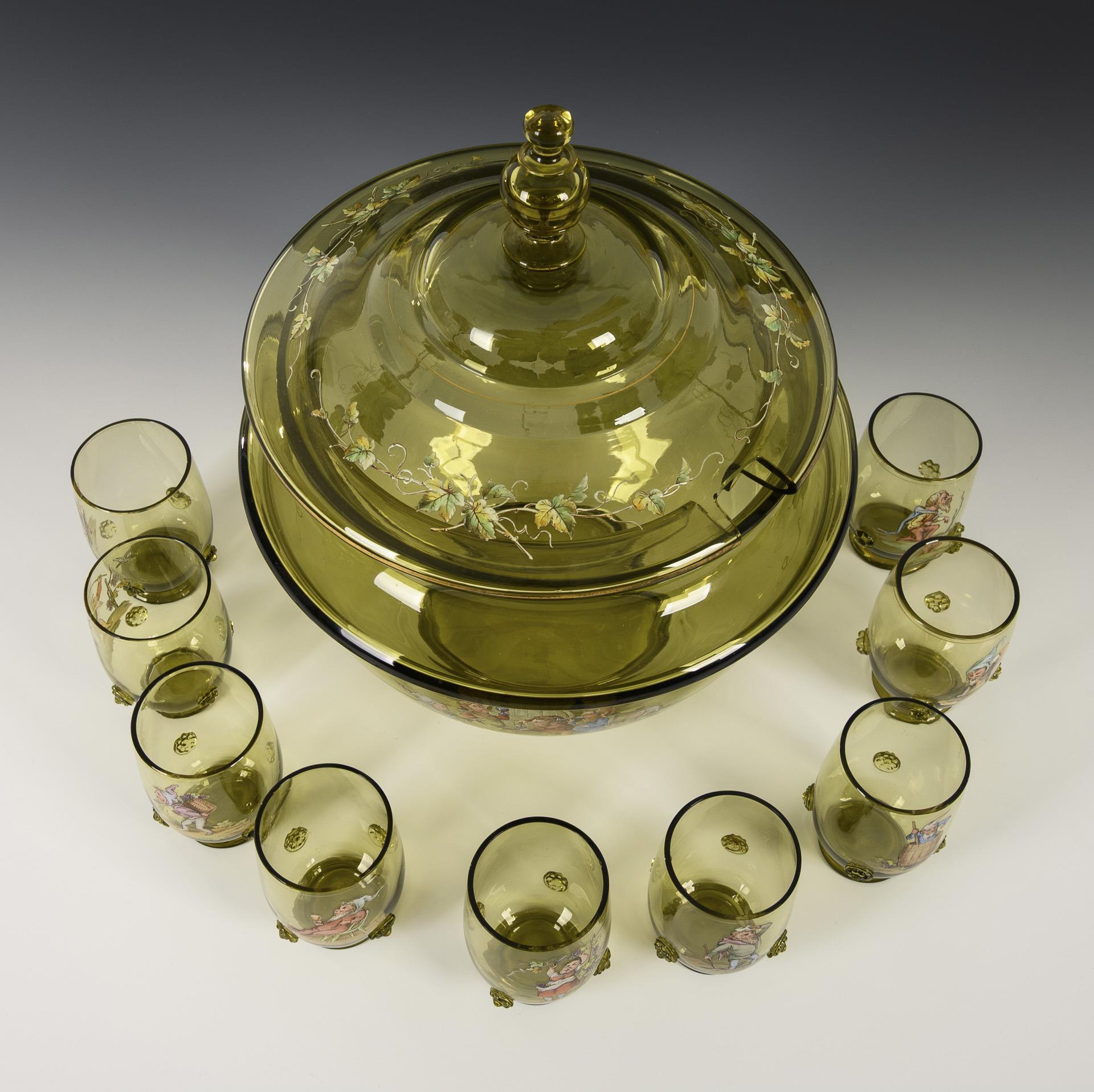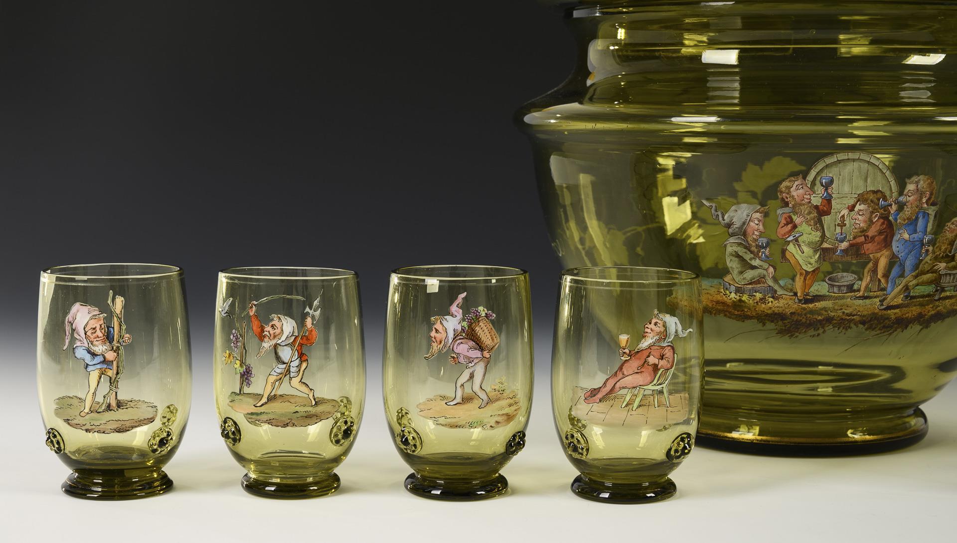 Olivgrünes Glas, polychrome Emailmalerei. Bowle (H 30,5 cm), 9 Becher (H 8,5 cm).