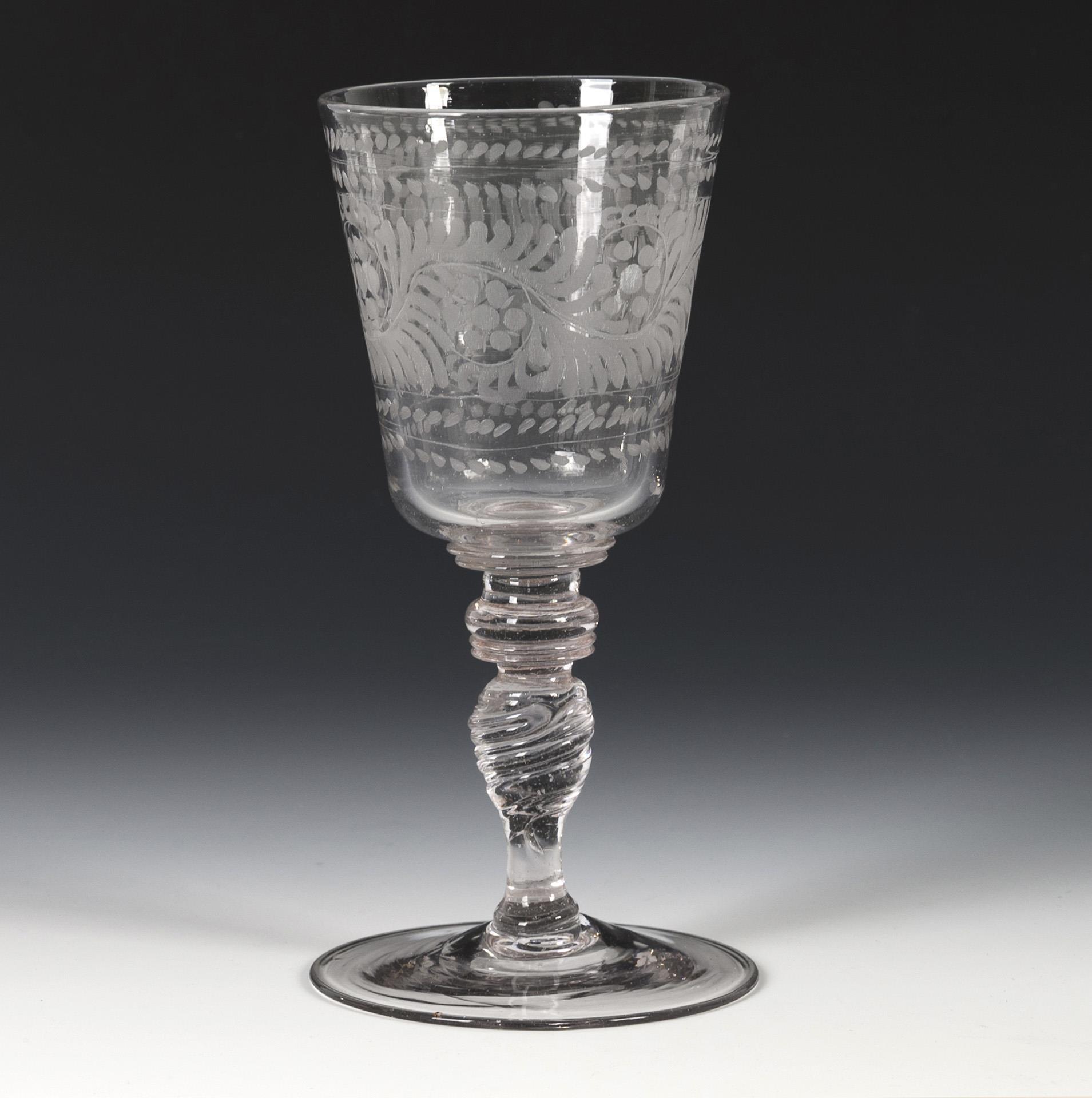 Konische Kuppa, mehrfach gegliederter Schaft mit gedrücktem Nodus zwischen Scheibennodi, gedrehter Balusterschaft, leicht ansteigender Rundfuß; Abriss. Auf der Kuppa eine gravierte Blütenranke.