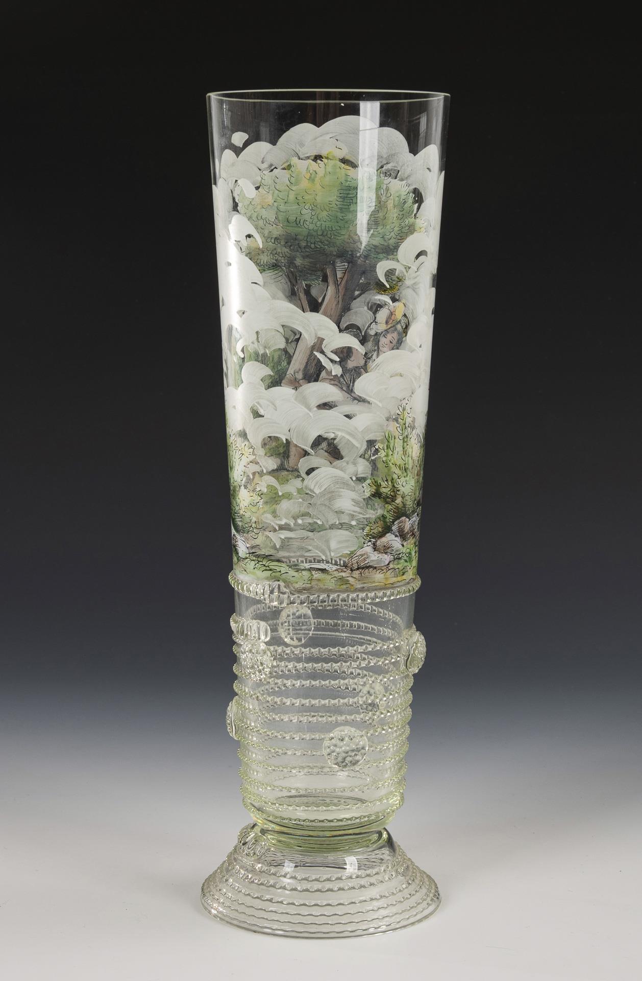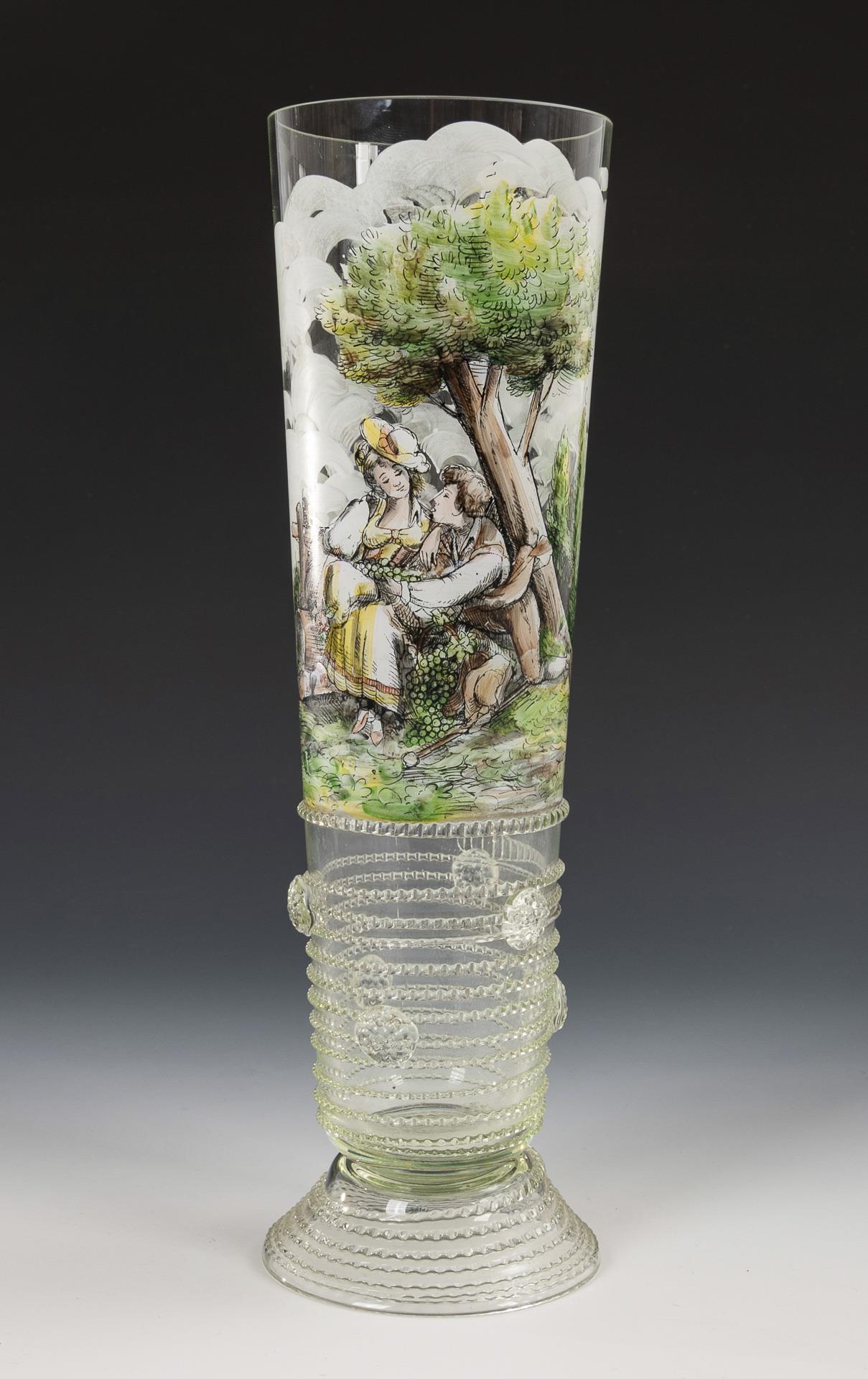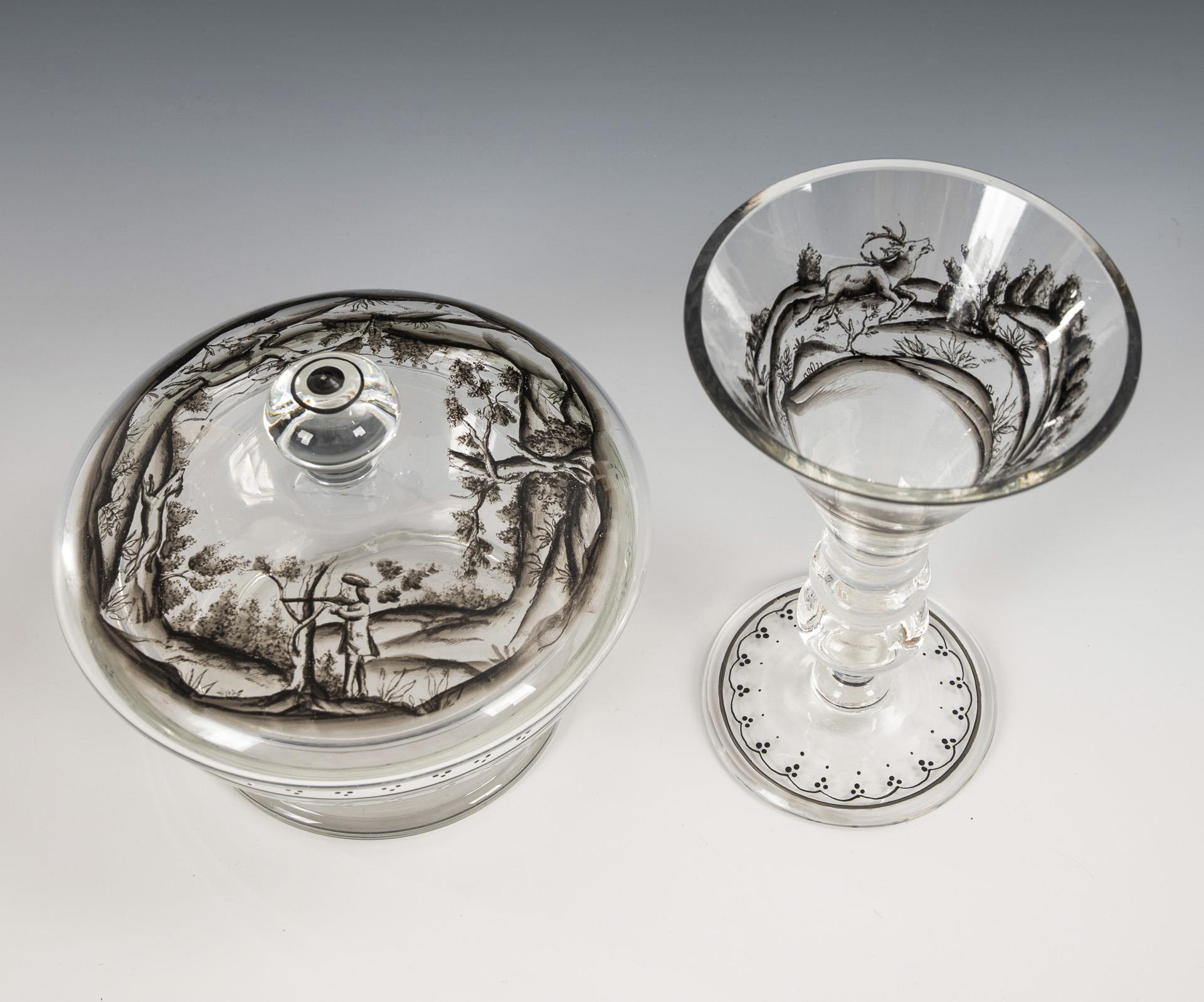 1x mit polychromer Emailmalerei: 20. Jh.; Stangenglas mit aufgelegtem Zwackelband und Beerennuppen; mit der Darstellung eines Winzerpaares (H 29,5 cm). / 2x mit Schwarzlotdekor: Johann Oertel, Haida?, um 1910: Dose (H 10,5 cm) und Kelchglas (H 13,5 cm) mit der Darstellung einer Landschaft mit Jäger, Hund und Hirsch.