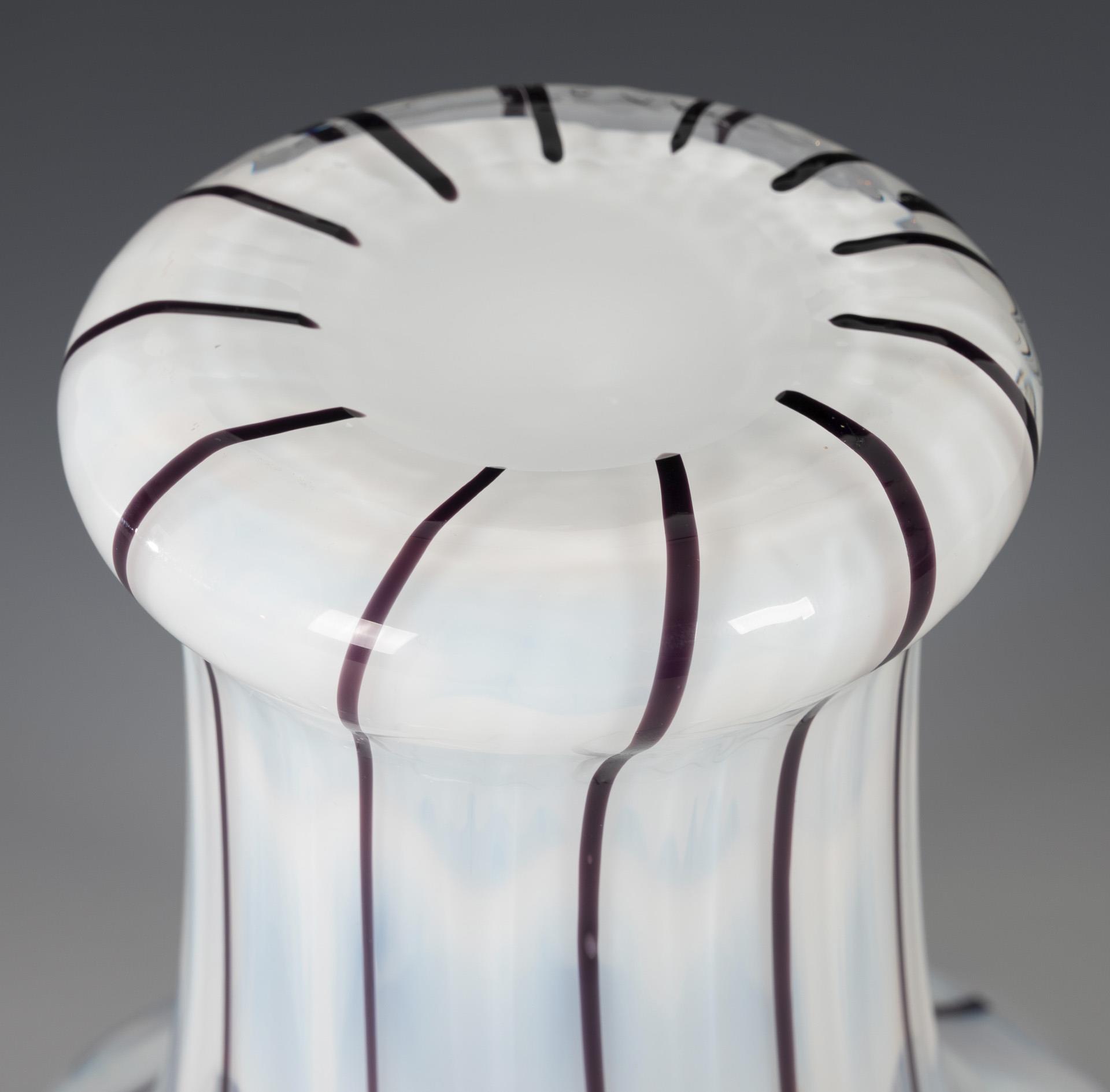 Farbloses Glas mit opalweißem Unterfang und aufgeschmolzenen violetten Streifen. H 17 cm.