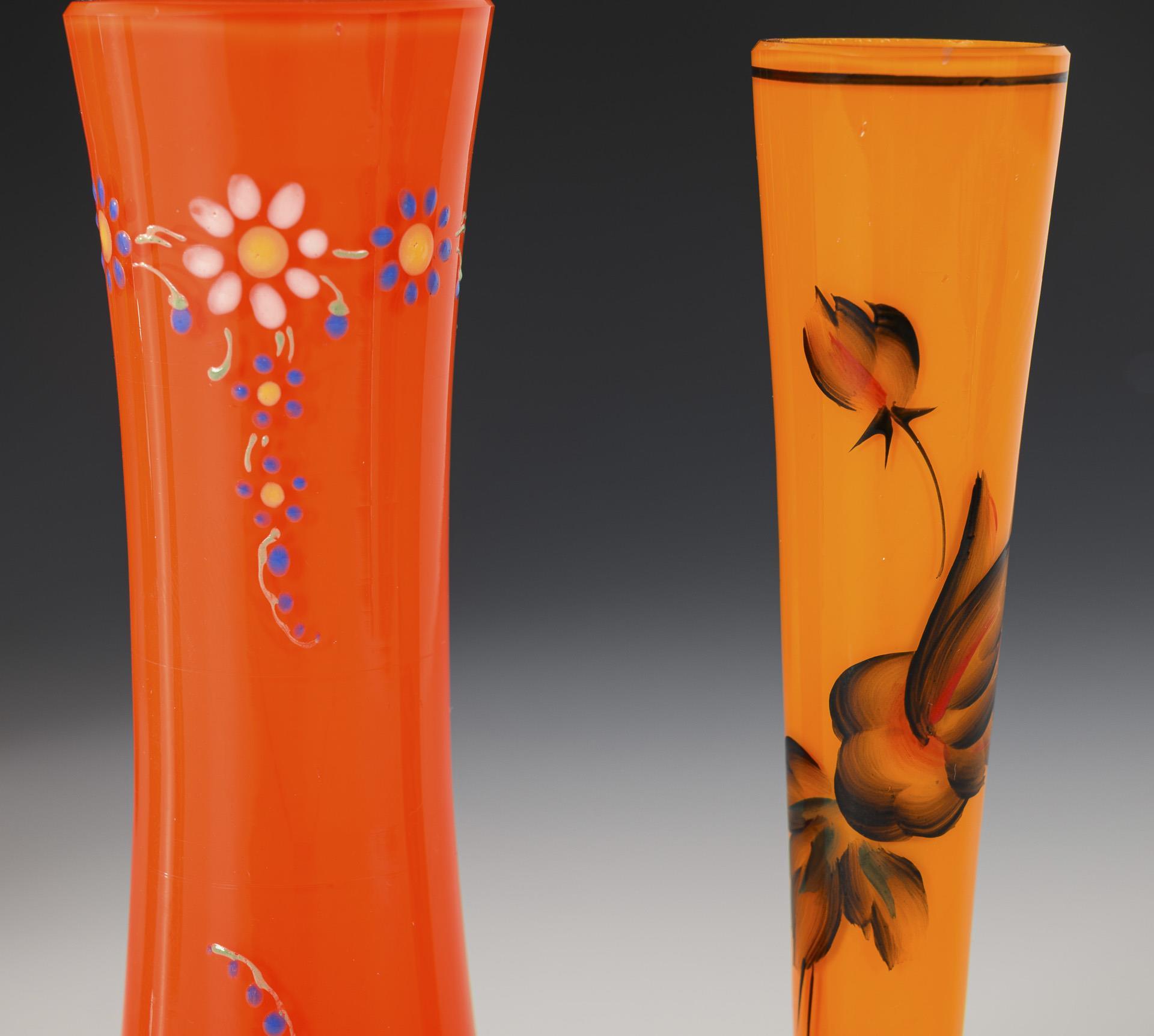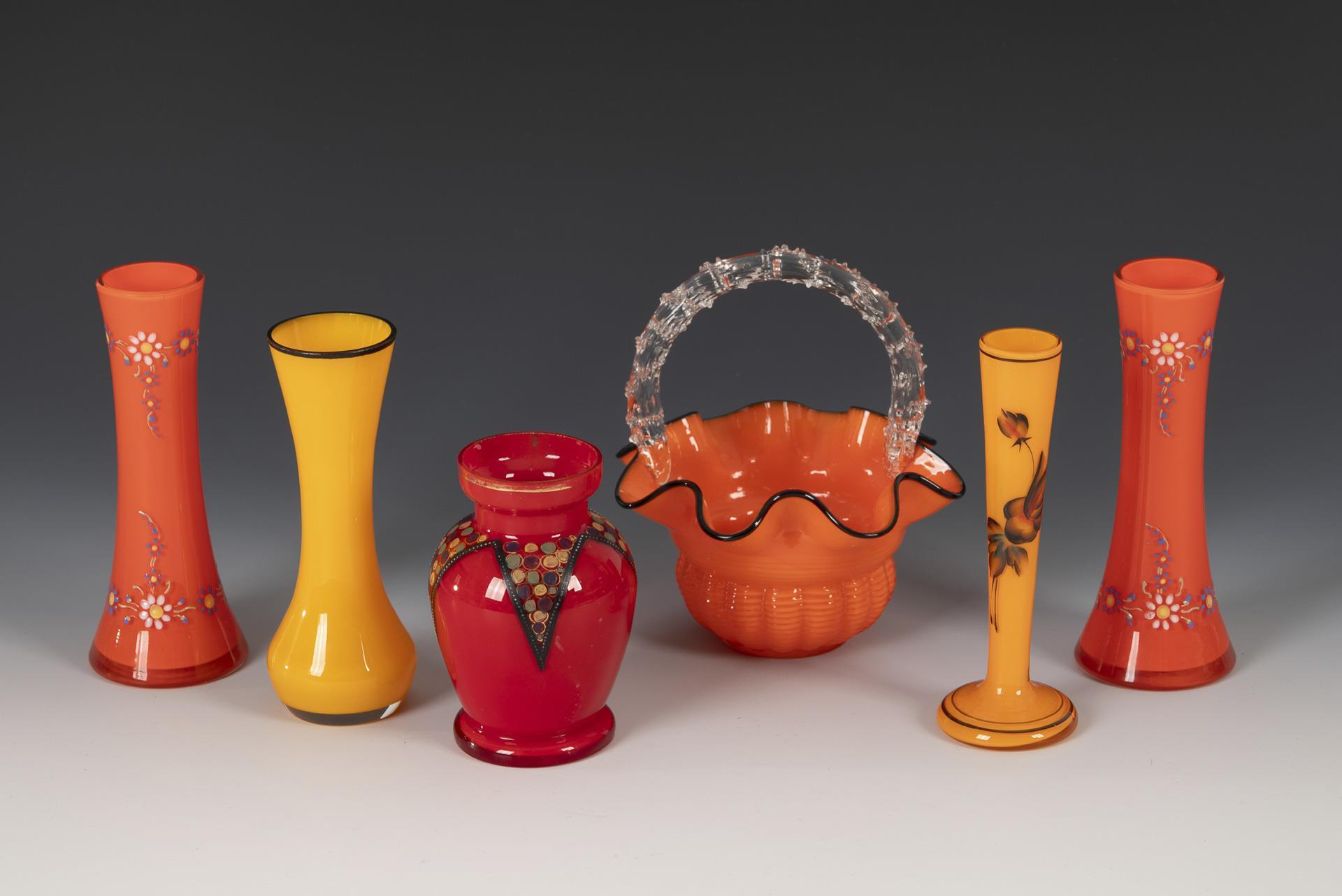 Tangoglas. 2 orange Flötenvasen mit Emailmalerei (H 15,5 cm), 1 gelbe Vase mit schwarzem Rand (H 15 cm), 1 orange-gelbe Soliflore-Vase mit Blumenmalerei (H 15,5 cm), 1 rote Balustervase mit geometrischer Email- und Goldmalerei (H 11 cm), 1 orange, gerillte Schale mit gewelltem Rand und Henkel (H 15,5 cm). Gold berieben.