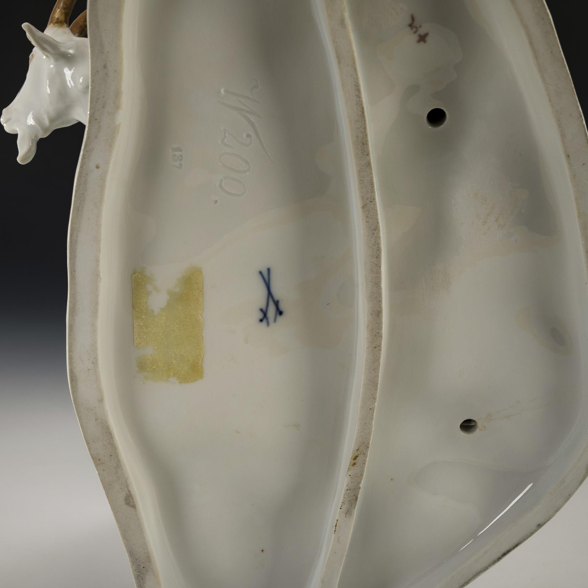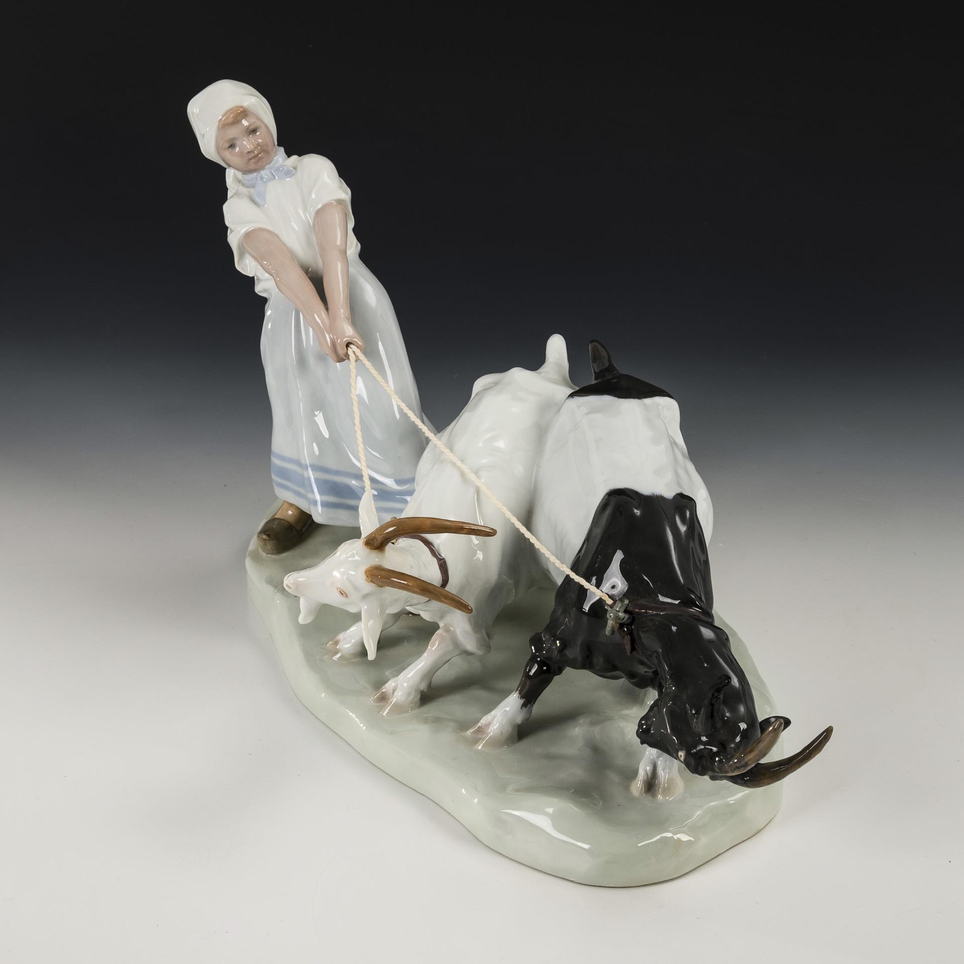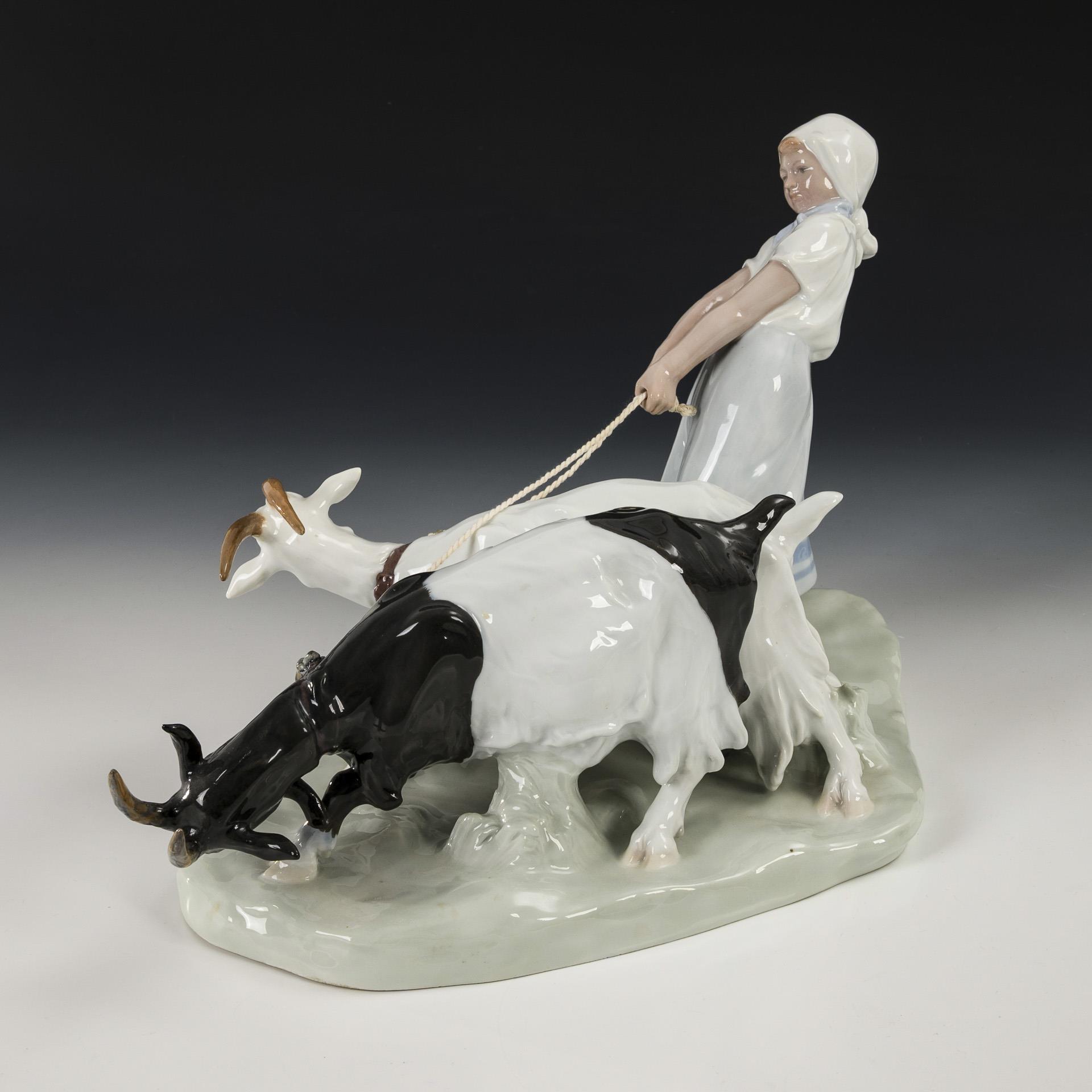 Auf einem Grassockel stehendes, mit zwei eigenwilligen Ziegen kämpfendes Mädchen. Alle Ziegenhörner und 2 Ziegenohren restauriert.