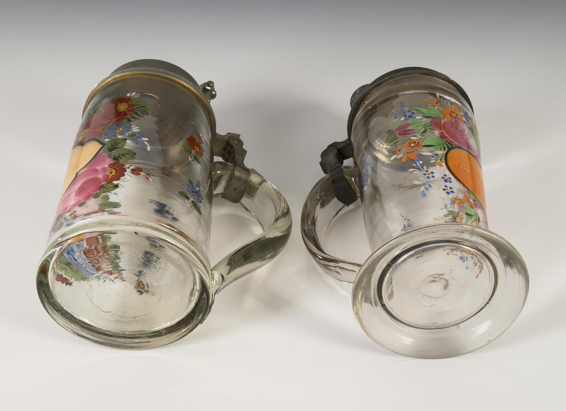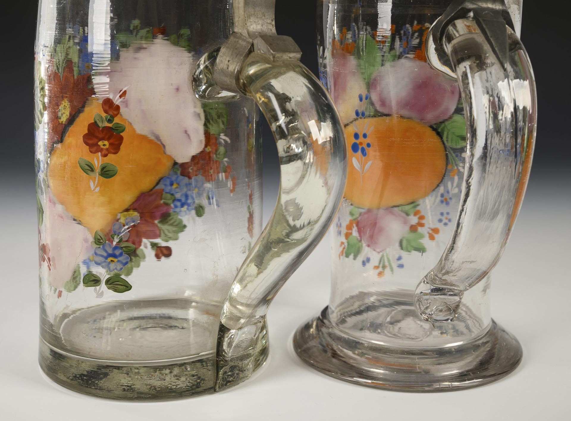 Farbloses, leicht schlieriges Glas, polychrome Emailmalerei, Zinn. H 24 und 24,5 cm.