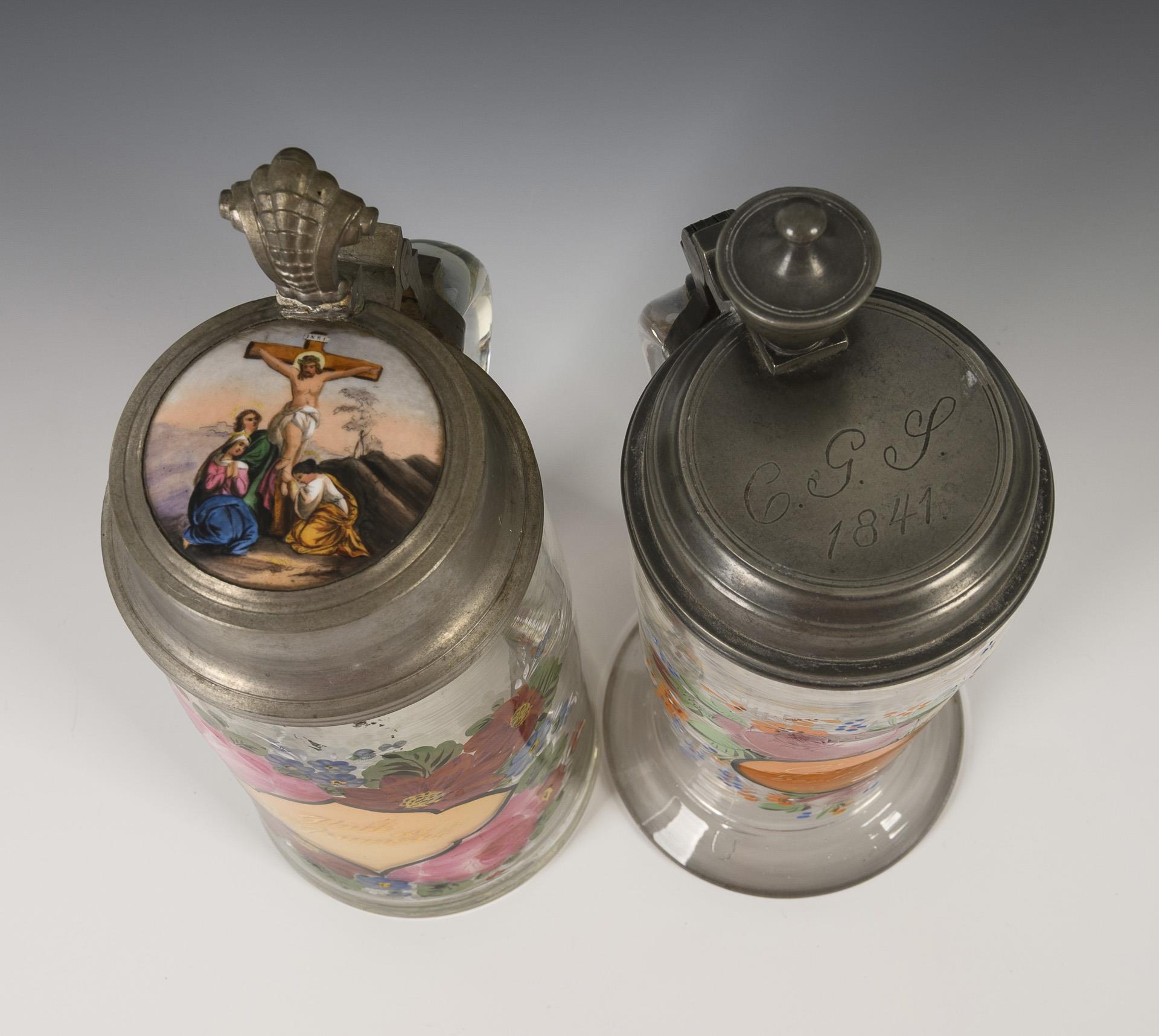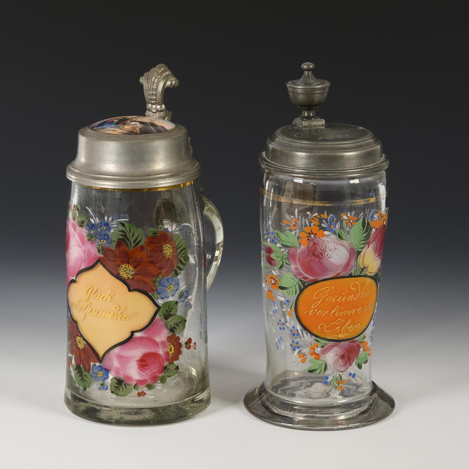 1x Sachsen, um 1840: leicht konischer Krug mit ausgestelltem Stand und der Gravur "C. G. S. 1841" auf dem Zinndeckel. Schauseitig ein Blumenbukett mit einem orange hinterlegten Medaillon, darin der Wunsch "Gesundheit verlänre dein Leben.". / 1x 19. Jh.: konischer Krug mit einer Porzellanplakette im zinnmontiertem Scharnierdeckel. Schauseitig ein Blumenbukett mit dem Wunsch "Glück und Gesundheit" in einer Vierpasskartusche, auf der Porzellanplakette eine Kreuzigungsdarstellung. 1x Spannungsriss im Henkel, 1x Spannungsriss am unteren Henkelansatz.