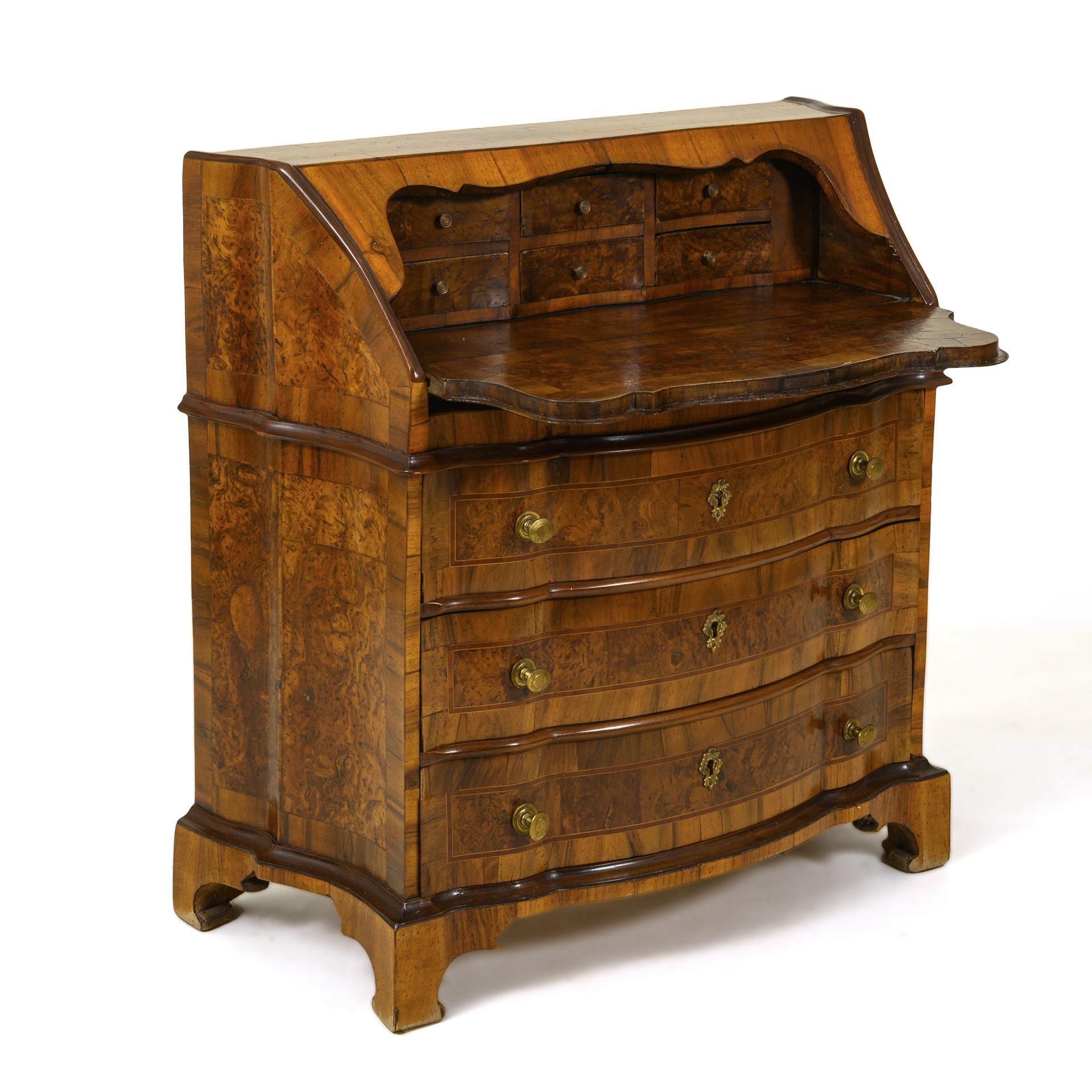 3-schübiger Korpus mit geschweifter, sich nach vorn verjüngender Front und konturierenden Profilleisten, schräger Schreibplatte mit zentraler Sternintarsie und flankierenden Vögeln, auf geschweiftem Sockel. Kunstvolle Scheinkassettierungen mit lebhaftem Maserholz sowie Band- und Fadeneinlagen. Innen 6 kleine Schübe. Florale Schlüssellochbeschläge und Knäufe aus Messing. Restauriert, mit Ergänzungen. Alters- und Gebrauchsspuren, inaktiver Anobienbefall.