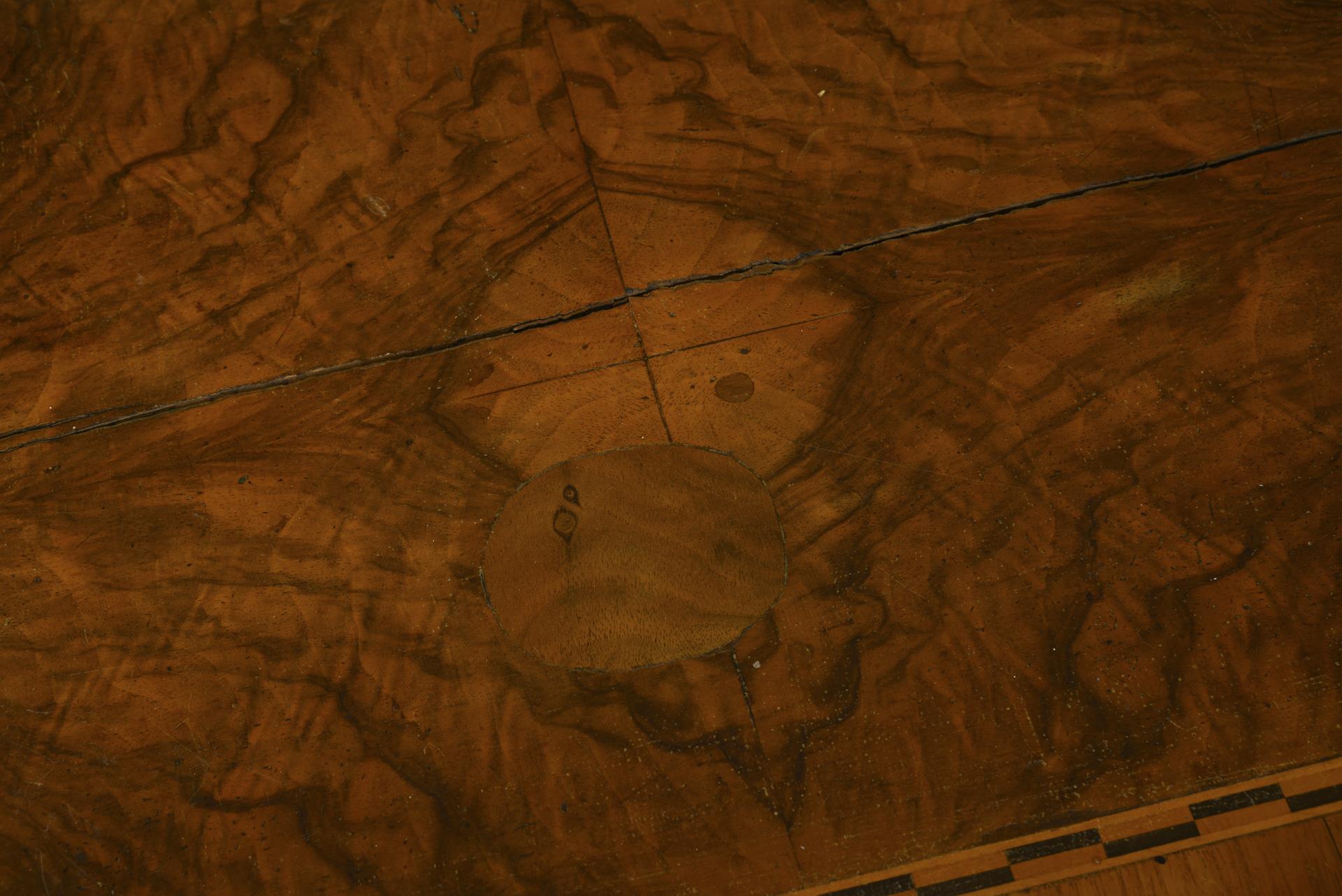 Nussbaum und andere Hölzer, furniert und gebeizt, teils ebonisiert. Ca. 82 x 89 x 45 cm.