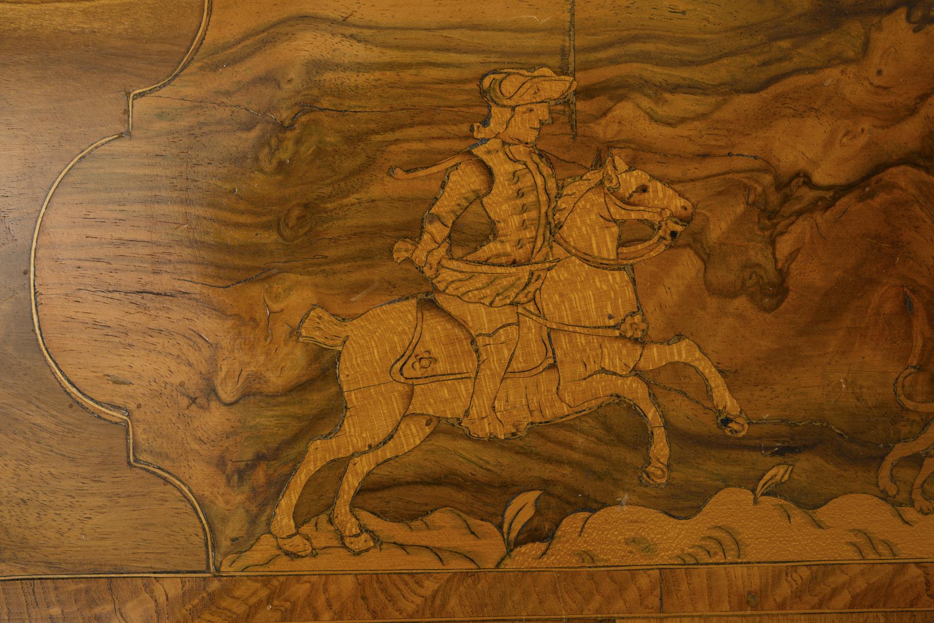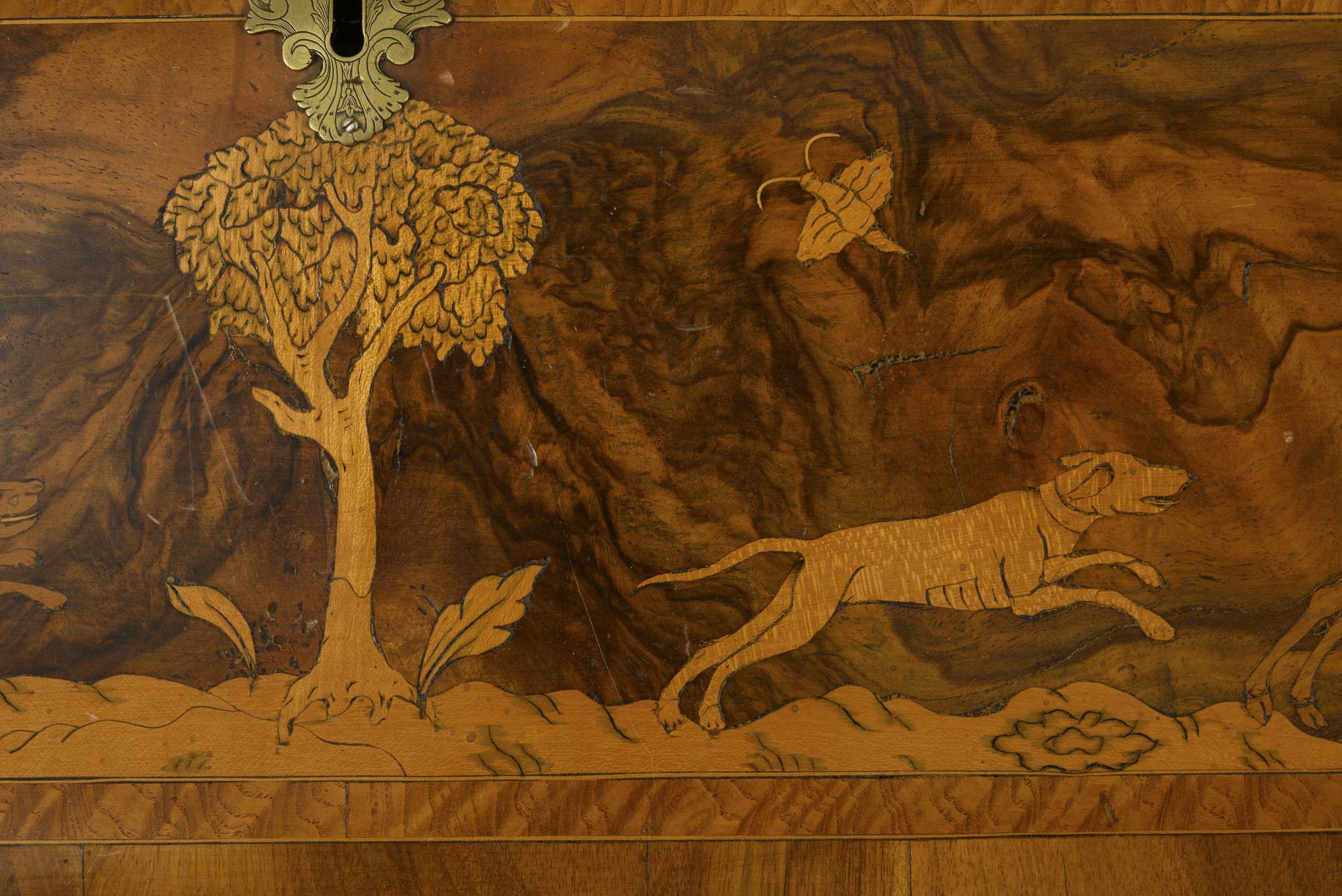 Aus 3 Teilen zusammengesetzter Korpus mit geschweifter und formbewegter Front. 10-schübiger Tabernakelaufsatz mit 1-türigem Mittelfach, innen mit 7 kleinen Schüben, davon 2 verschließbar. Schrägpult mit klappbarer Schreibplatte, innen mit 1 großen und 6 kleinen Schüben, 1 Schub mit kleinen Kompartimenten, Platte mit grünem Lederbezug. 3-schübiges Kommodenunterteil auf 4 gedrückten Kugelfüßen. Lebhaftes Furnierbild durch kunstvolle Verarbeitung verschiedener Hölzer, Holzmaserungen und Marketerien, Band- und Fadeneinlagen, Scheinkassettierungen mit Barockreserven, Bandelwerk und floralen Motiven, Aufsatz mit einem großen Vogel auf einem Baumstamm, Schrägpult mit einem Reiter und Hunden bei der Treibjagd. Messingbügelgriffe, florale Messingbeschläge, Eisenschlösser, Innenschübe mit Holzknäufen, Schübe und Fächer mit diverser Papierauskleidung. Restauriert, mit Ergänzungen. Aufsatzkrone fehlend, leichte Gebrauchsspuren, partiell Defekte und Risse, inaktiver Anobienbefall, Schlösser teils schwergängig, 1 ergänzter Messingknauf innen lose.