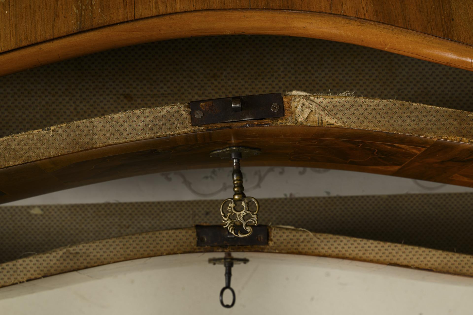 Nussbaum und andere Hölzer, massiv und furniert. Ca. 167 x 117 x 75 cm.