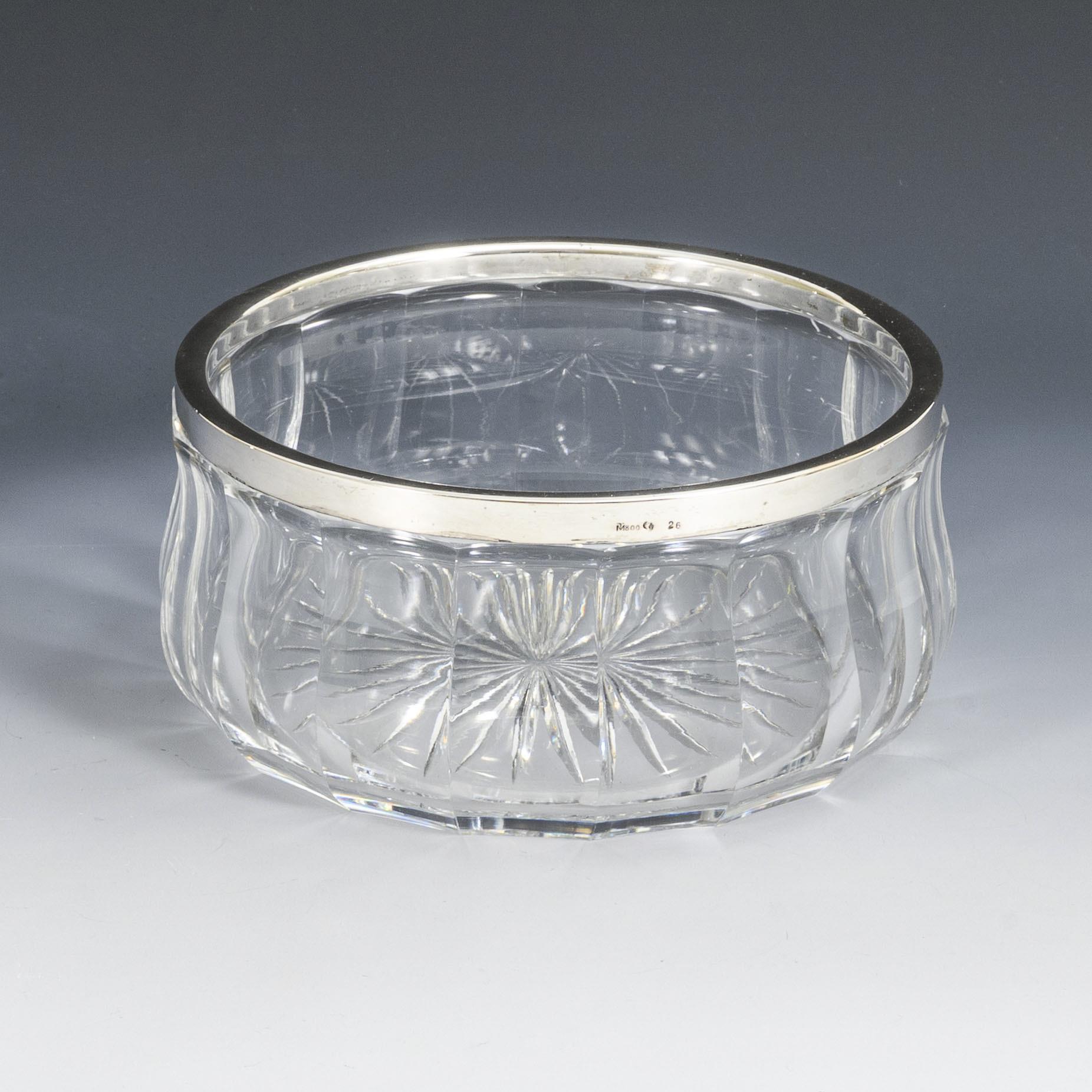 Runde Schale mit facettierter Wandung und geschliffenem Bodenstern, glatter Silberrand. Minimale Alters- und Gebrauchsspuren.