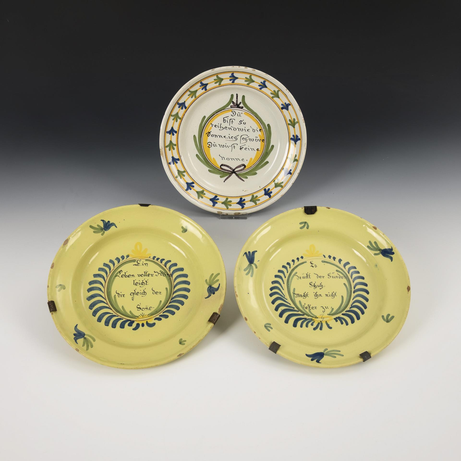 3 Fayence-Spruchteller. Wohl Süddeutschland.