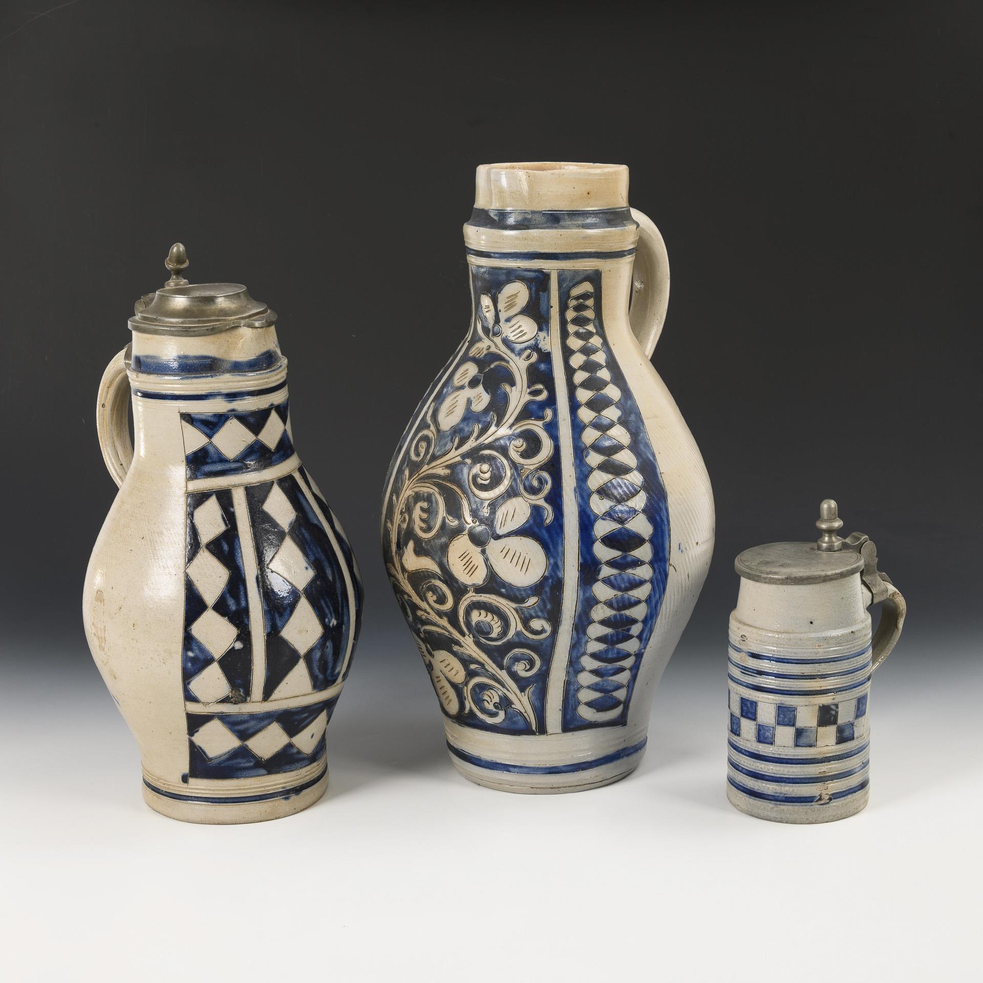 2 Birnkrüge, 1x mit Floralranken und flankierenden Zopfbändern, 1x mit Rautenbändern und Zinndeckel mit Eicheldrücker. 1 Zylinderkrug mit horizontalem Rillendekor und Mittelfries mit Schachbrettdekor, flacher, gepunzter Zinndeckel mit Eicheldrücker (Crailsheim, unbekannter Meister, um 1835/68). Teils herstellungsbedingte Glasurdefekte und Verformungen, Altersspuren, 1 Kanne mit Haarriss an Mündung, Krug mit feinem Bodenriss und leichter Bestoßung.