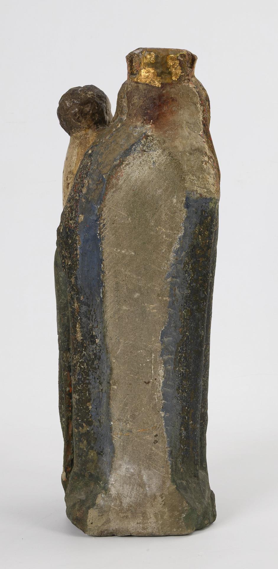 In archaisierender Blockhaftigkeit mit nur leichtem gotischen Schwung stehende Maria, die über ihrer linken Hüfte das nackte Jesuskind trägt, das zärtlich seinen Arm um ihren Hals gelegt hat. Kleinere Abplatzer im unteren Bereich, Fassung mehrfach übergangen, Fassungsschäden.