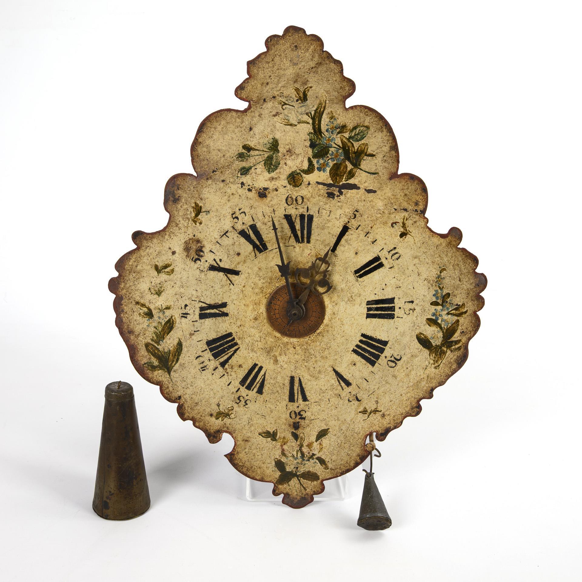 Rokoko-Wanduhr mit geschweift geschnittenem Eisenschild, weiß lackiert und farbig bemalt mit Zweigen und Blumen. Ziffernring mit römischen und arabischen Zahlen, zentrale Messingstellscheibe für Schlag, florale Eisenzeiger. Alters- und Gebrauchsspuren.