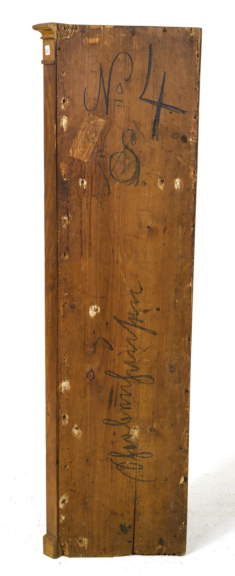 1-türiger, gesprosst verglaster Korpus, profiliertes Gebälk mit Lamellenfries. Runder Schlüssellochbeschlag aus Holz. Innen 4 hellblau gefasste Fächer. Alters- und Gebrauchsspuren, partiell Furnierfehlstellen, leicht verzogene Tür (trotzdem gut schließend).