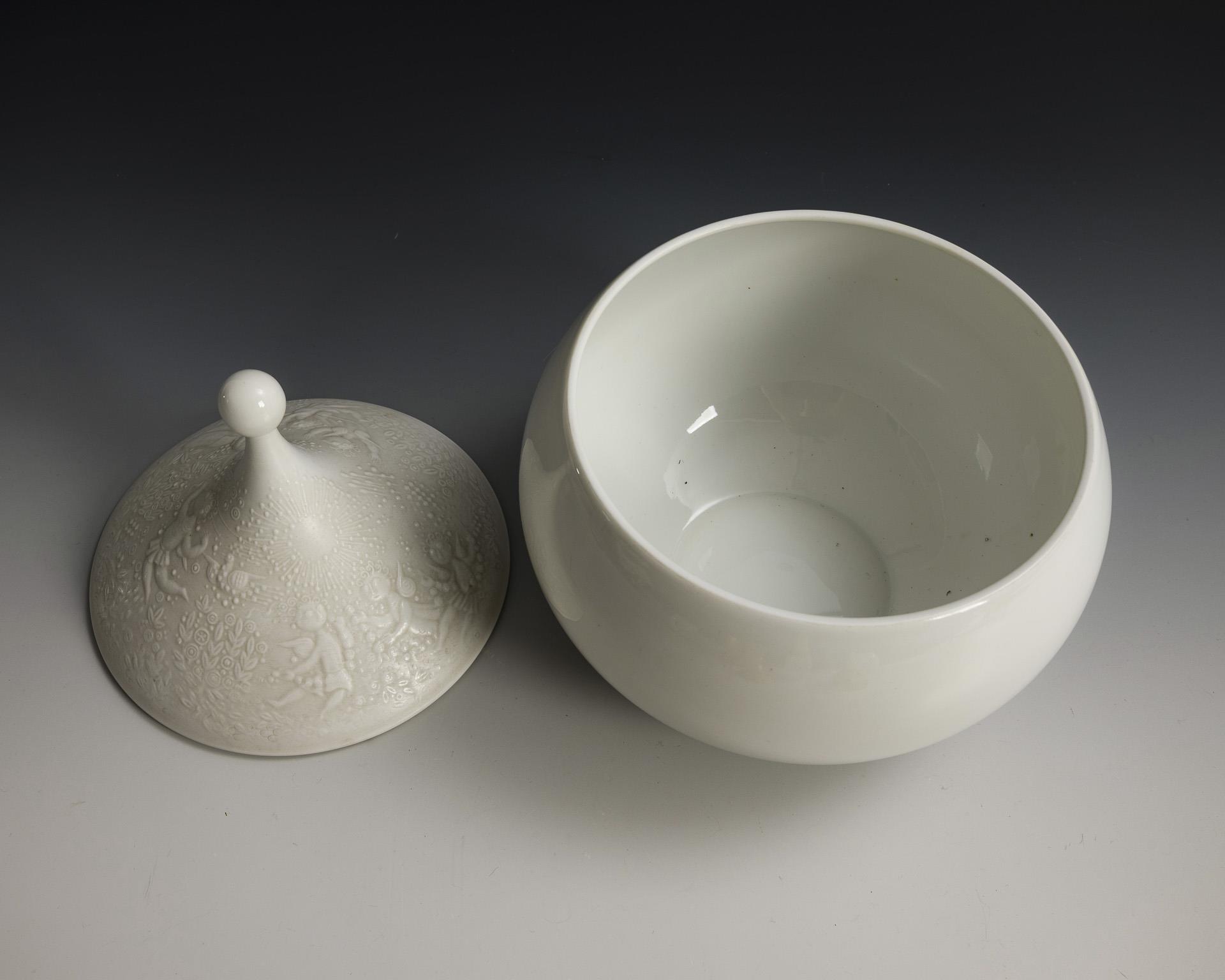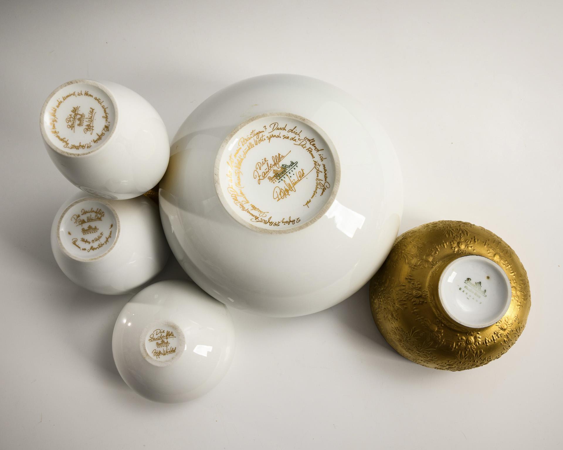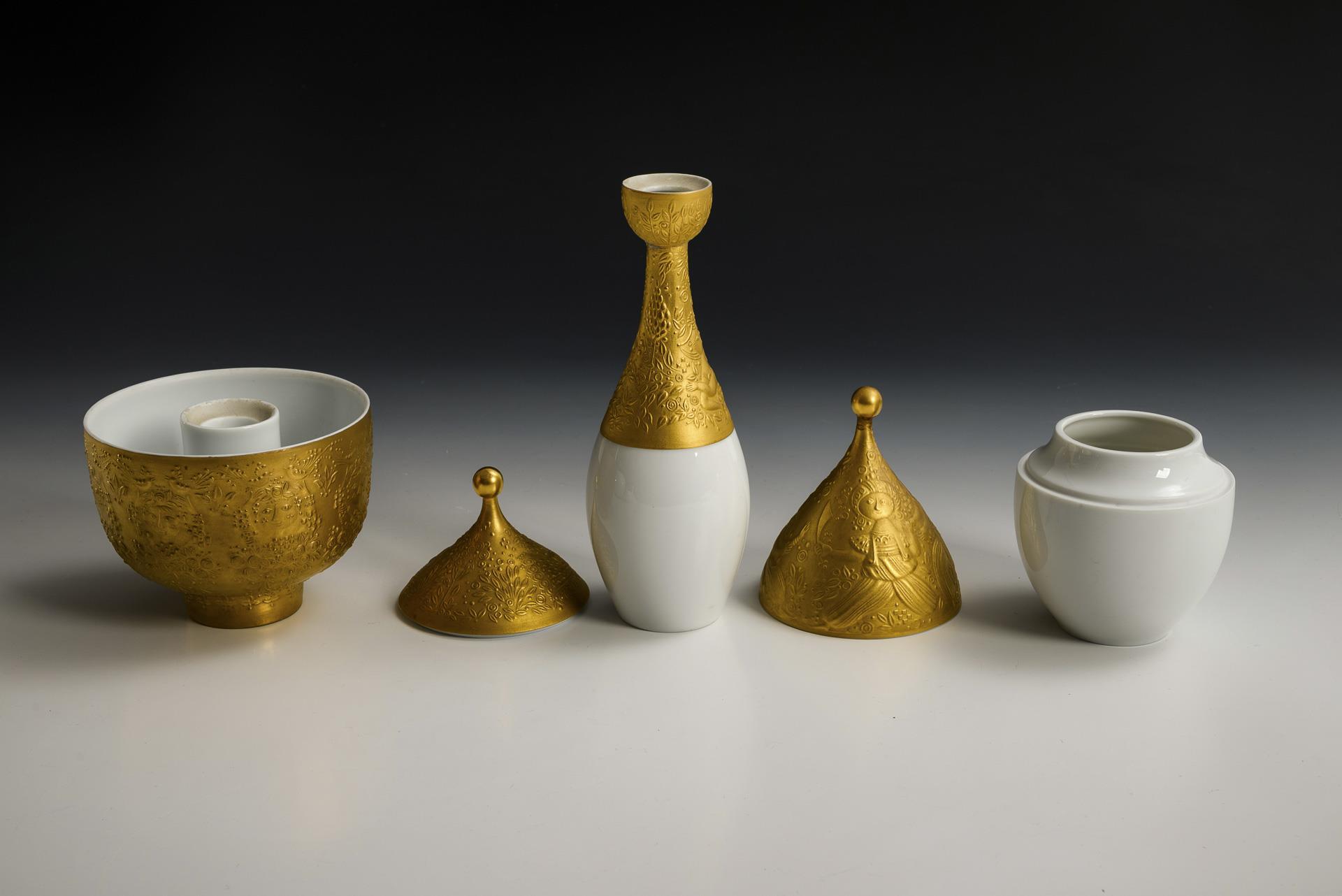 Reich reliefiertes, teils goldbronziertes Porzellan mit Szenen aus der Zauberflöte von W. A. Mozart. Große Dose (H 21 cm), Zuckerdose (H 11 cm), Teedose (H 15,5 cm), Schale mit Leuchtertülle (H 8,5 cm) und vasenförmiger Leuchter (H 7,5 cm). 1 Knauf geklebt, 1 Leuchtertülle geklebt und mit Randbestoßung.