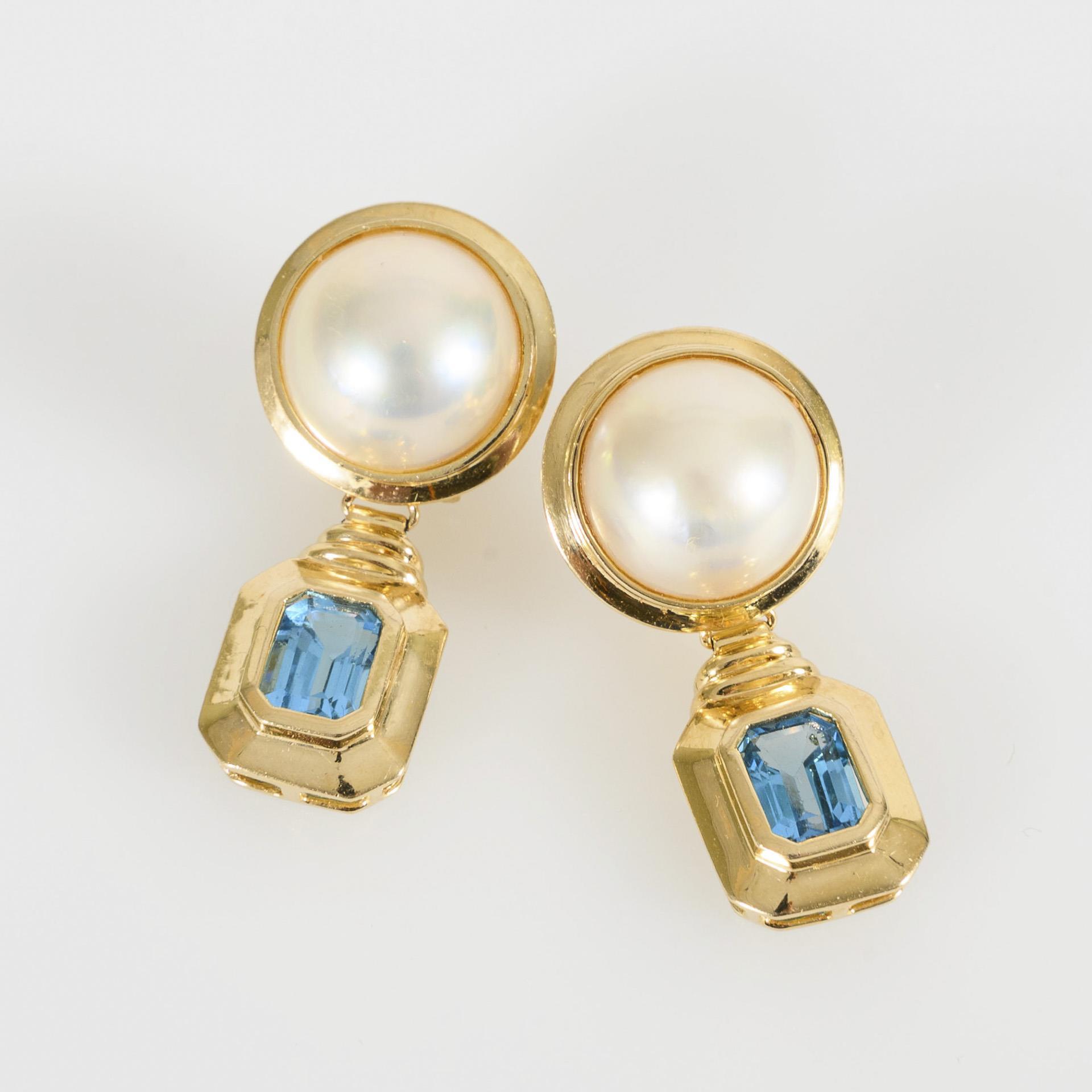 Modernes Ohrhängerpaar in klarer Formensprache, je mit einer Mabé-Zuchtperle und einem blauen Farbstein in Zargenfassung besetzt. Der Verschluss mit Clipsteck-Mechanik, die Perlen mit natürlichen Wachstumsmerkmalen. Leichte Tragespuren am Gold.