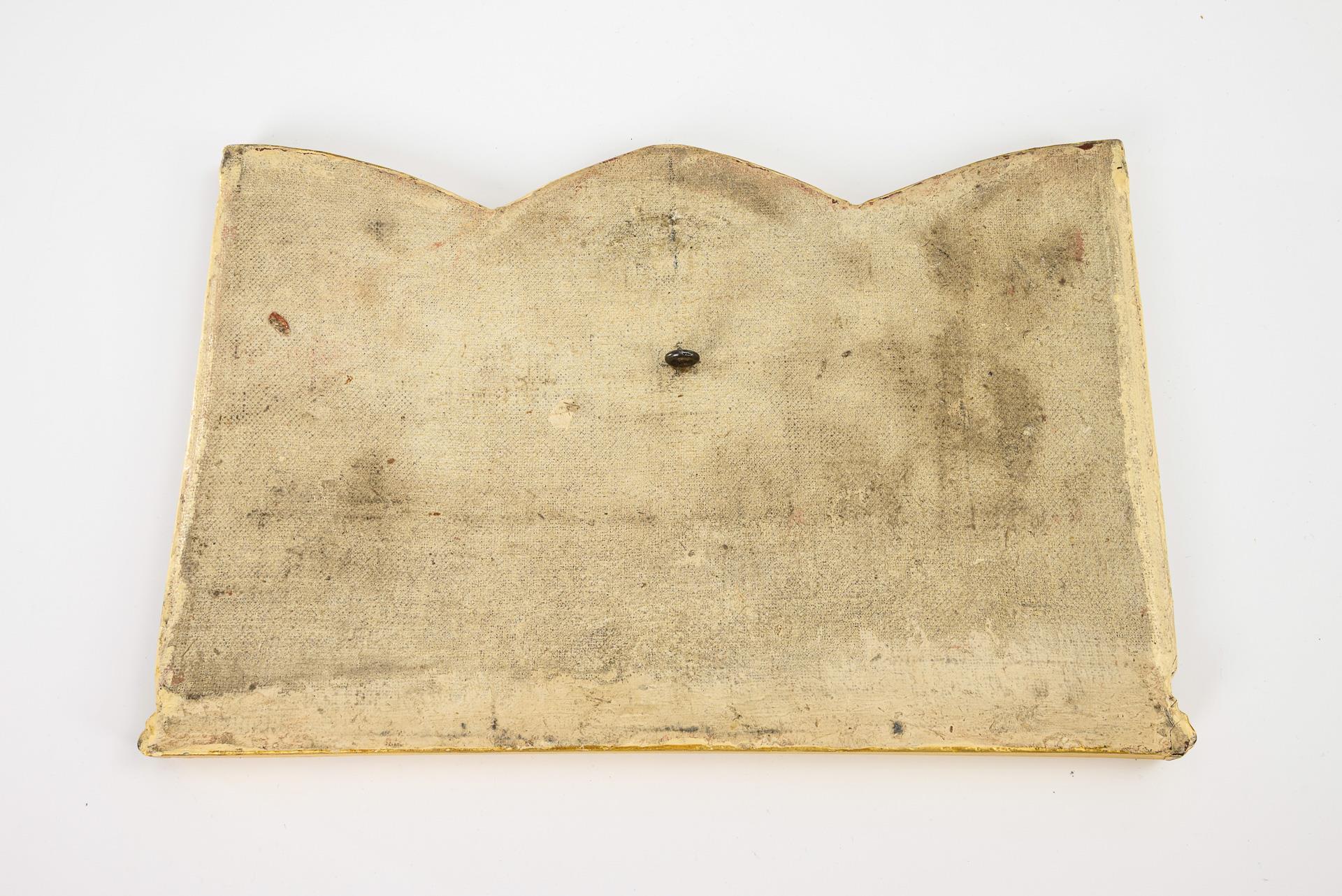 Mit intensiv leuchtenden Farben dargestellte Kreuzigung sowie Maria und Johannes auf den Flügeln. Minimale Alters-/Gebrauchsspuren am Rahmen.