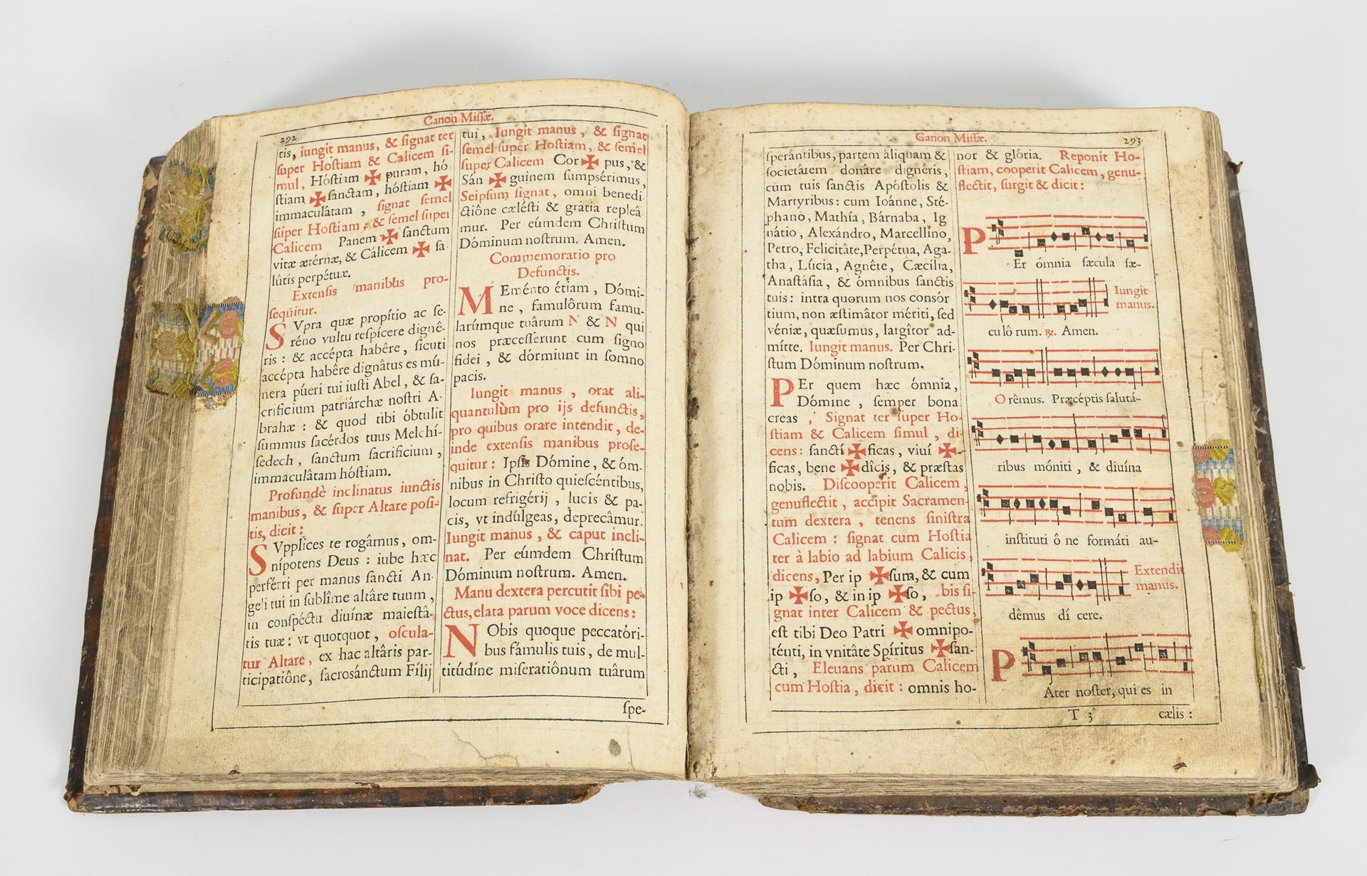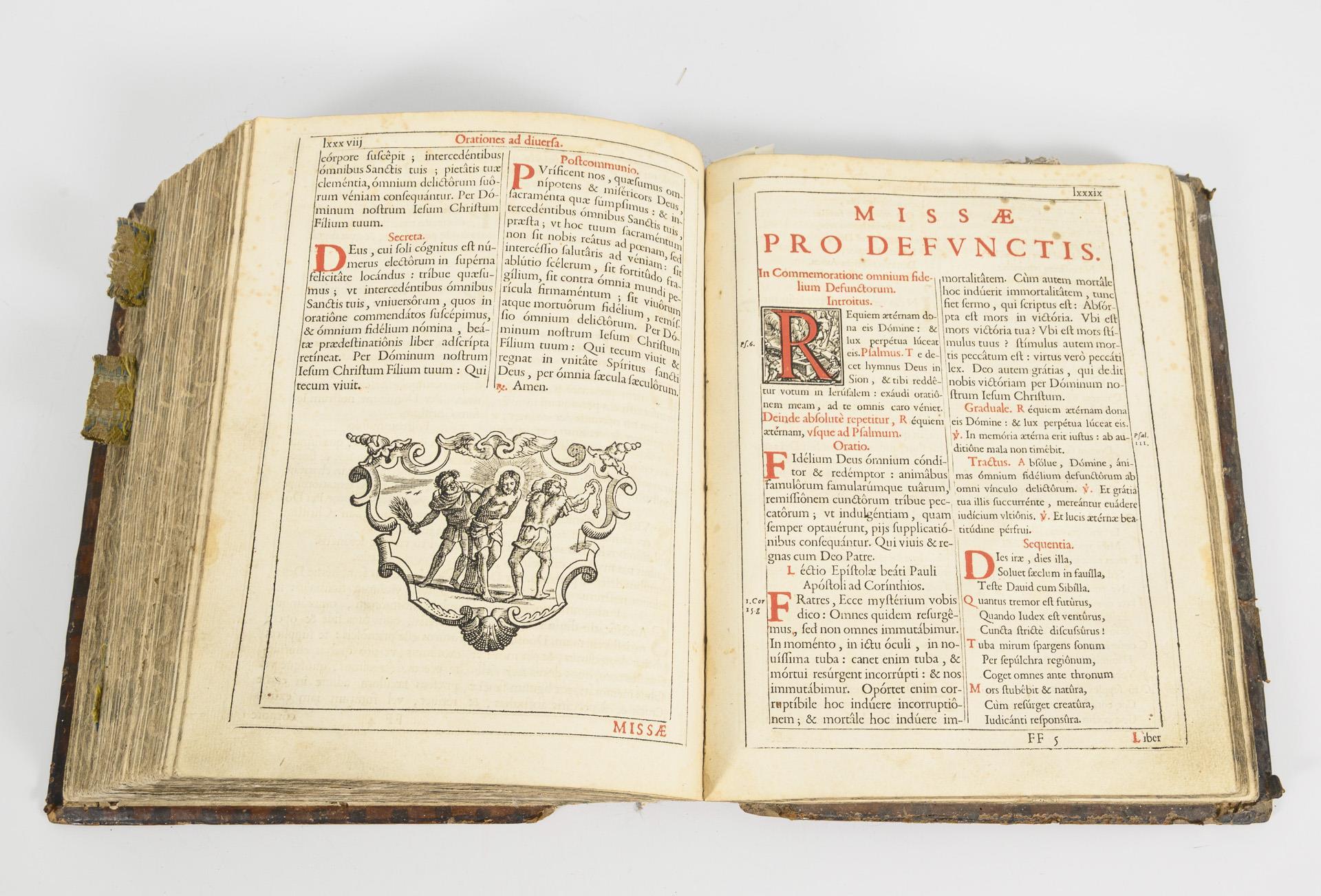 Vorsatzblatt fehlt, Titelblatt, (60), 632, 124, (4), 6, 31, 19 Seiten im geprägten Ledereinband. Zweispaltig mit roten und schwarzen Typen, bildlichen Initialen, Noten. Eingeklebte Stoffstücke als Marker. Auf einigen Seiten alte Feuchtigkeitsspuren, stärkere Alters- und Gebrauchsspuren, wenig Spuren alten Anobienbefalls.